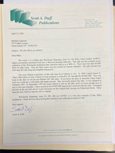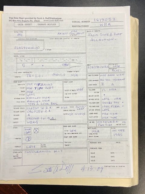 5/19/22 – This is a scarce and desirable “WIN-13” Winchester M1 Garand manufactured in 1945. This specific rifle represented the “WIN-13” example in Garand Guru Scott Duff’s personal collection, as documented by the accompanying letter. It also has one of his brass inventory tags attached to the front sling swivel. The rifle is all-correct and Mr. Duff filled out and signed an M1 Garand data sheet that comes with the package. Also included are shipping documents from the DCM. As noted, he changed the bolt to a correct blued one, and stated he believed the rest of the rifle to be both correct and original. There are no arsenal rebuild markings or evidence of an overhaul. The op rod is uncut. The finish on the receiver and trigger group is very nice, but most of the thinning is on the barrel and gas tube. Bore is relatively shiny with strong rifling and just a little bit of frost. Overall condition is very good, with a TE of 2.0 and ME of 1.0. Wood has nice, clean cartouches with only a few minor dings. Includes a 1945 sling and cleaning kit in the butt.