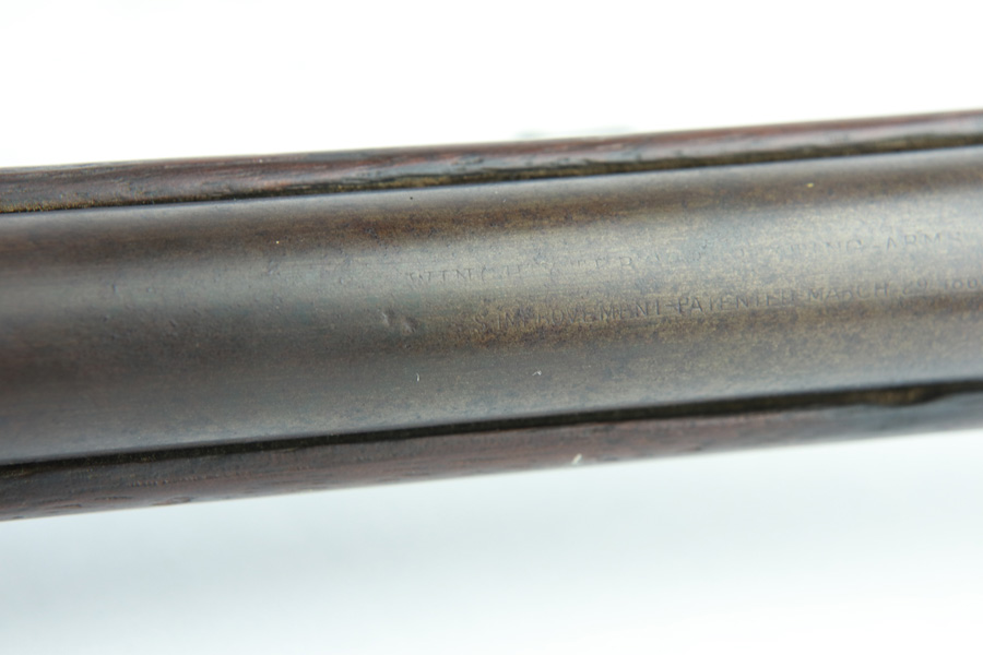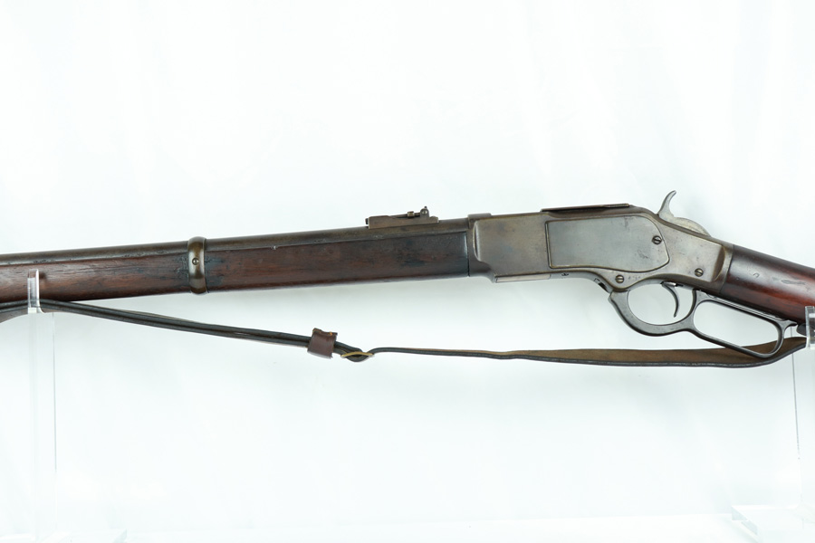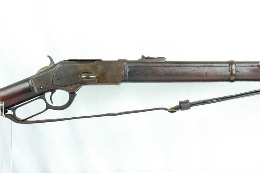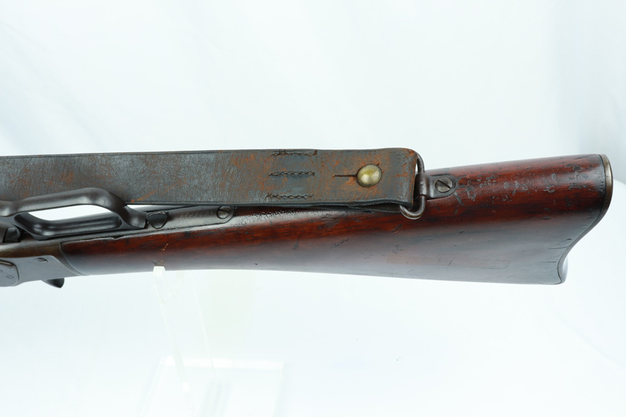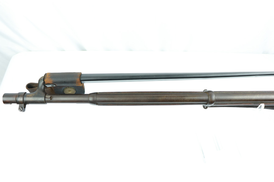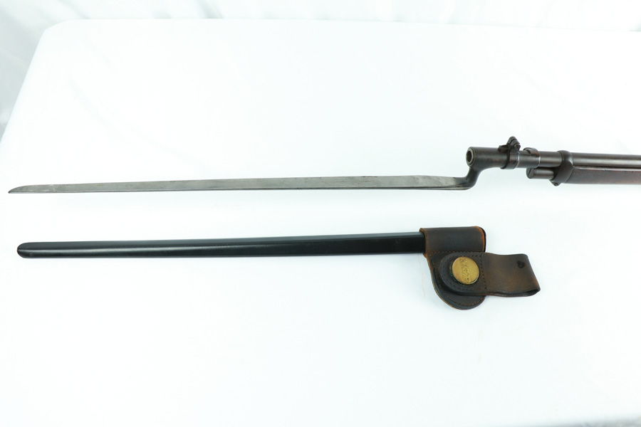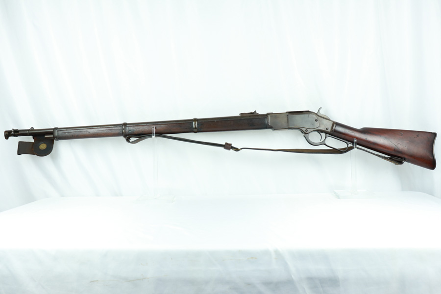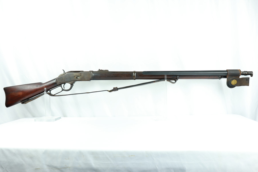 11/13/18 – Made in 1891, this is a scarce Winchester M1873 lever-action musket – third model. This rifle is in excellent condition considering its age, and the wood has aged incredibly well with only very minor nicks and scratches. There is pitting along the side of the barrel where it meets the wooden hand guard, but no other noteworthy flaws on the metal parts. There are little signs of actual finish loss or rub wear, though there is deep, uniform patina on all metal parts. Overall, the metal parts are browned from aging but in great condition. The lever action is smooth and well-functioning. The bore is surprisingly strong, with strong rifling and a decent shine. There is some frost and minor freckling throughout, but it looks like it is still fireable. The rifle includes an original bayonet that is in excellent condition and smoothly locks into place on the barrel. The bayonet is sheathed in an excellent scabbard that is marked “McKENNEY’S PAT. JAN 12 1886” with an “N.G.P.” buckle. The rifle also includes an original sling which, again, is in great condition considering the age of the rifle. The rifle’s iron frame employs Winchester superintendent Nathan King’s 1866 patent for storing cartridges in the tube and also for loading the tube through a hinged gate on the right side of the frame. Lever-action frame has a sliding, rail mounted dust-cover with serrated thumb edges, no saddle ring, and is fitted to a two-piece, oil-stained black walnut stock and forend. Forend wears the iron nose cap.