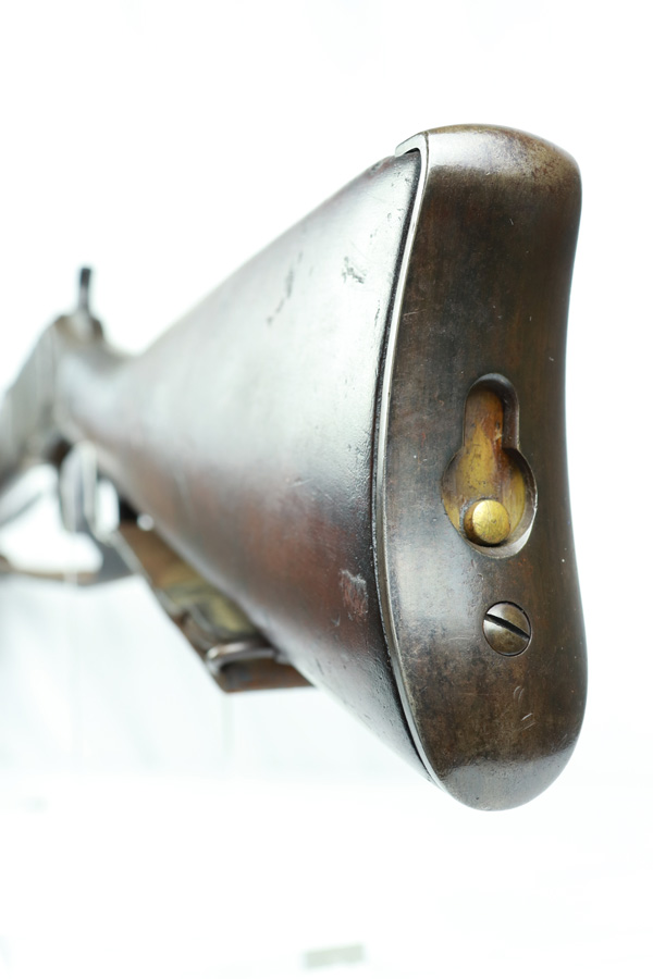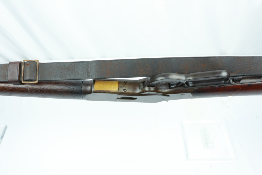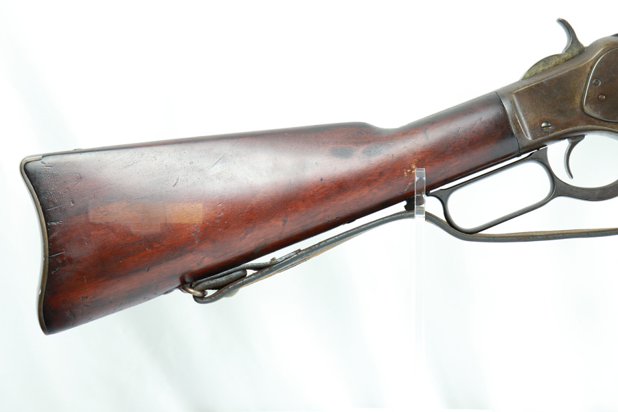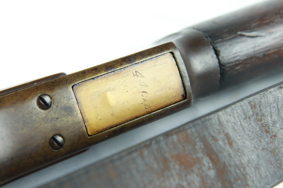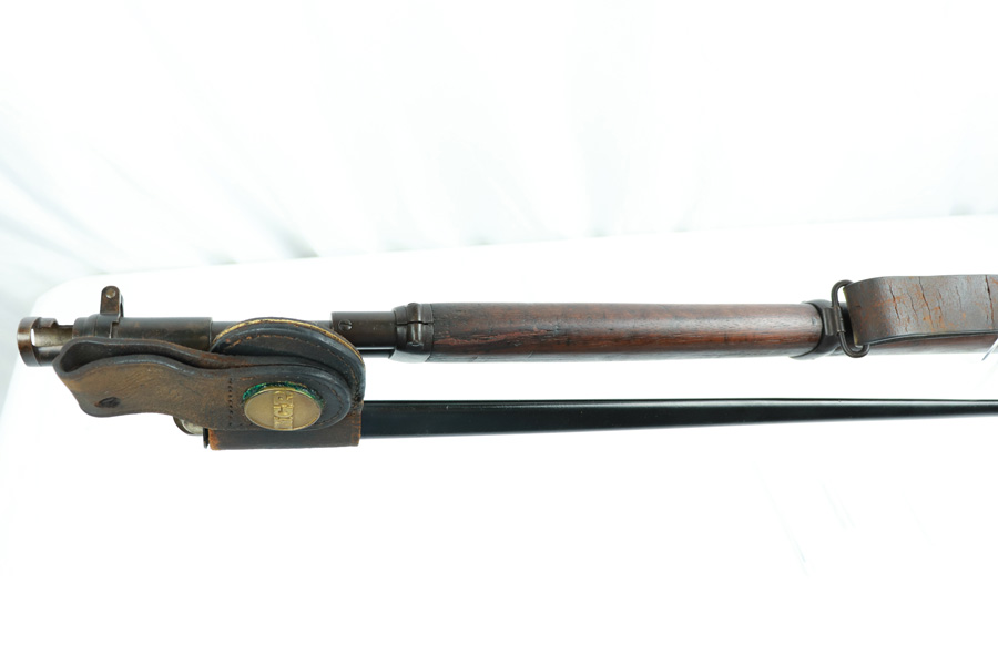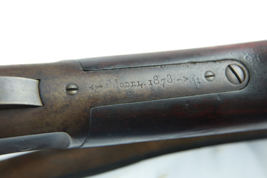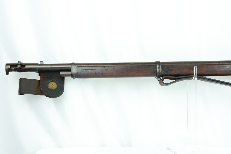 11/13/18 – Made in 1891, this is a scarce Winchester M1873 lever-action musket – third model. This rifle is in excellent condition considering its age, and the wood has aged incredibly well with only very minor nicks and scratches. There is pitting along the side of the barrel where it meets the wooden hand guard, but no other noteworthy flaws on the metal parts. There are little signs of actual finish loss or rub wear, though there is deep, uniform patina on all metal parts. Overall, the metal parts are browned from aging but in great condition. The lever action is smooth and well-functioning. The bore is surprisingly strong, with strong rifling and a decent shine. There is some frost and minor freckling throughout, but it looks like it is still fireable. The rifle includes an original bayonet that is in excellent condition and smoothly locks into place on the barrel. The bayonet is sheathed in an excellent scabbard that is marked “McKENNEY’S PAT. JAN 12 1886” with an “N.G.P.” buckle. The rifle also includes an original sling which, again, is in great condition considering the age of the rifle. The rifle’s iron frame employs Winchester superintendent Nathan King’s 1866 patent for storing cartridges in the tube and also for loading the tube through a hinged gate on the right side of the frame. Lever-action frame has a sliding, rail mounted dust-cover with serrated thumb edges, no saddle ring, and is fitted to a two-piece, oil-stained black walnut stock and forend. Forend wears the iron nose cap.