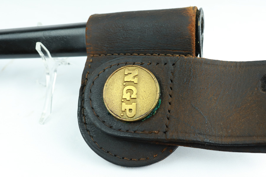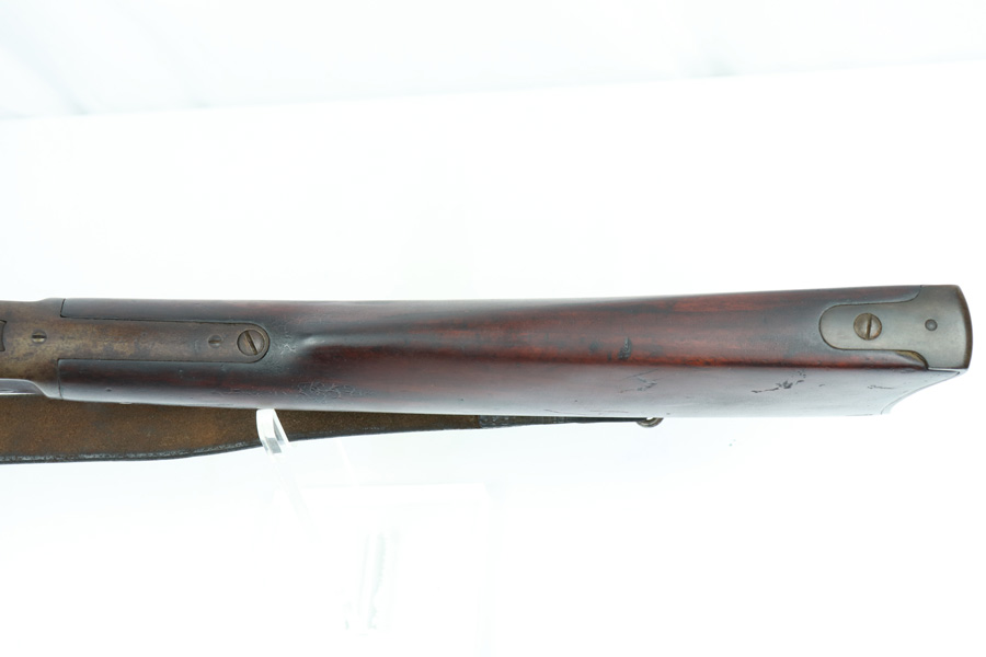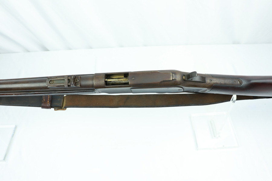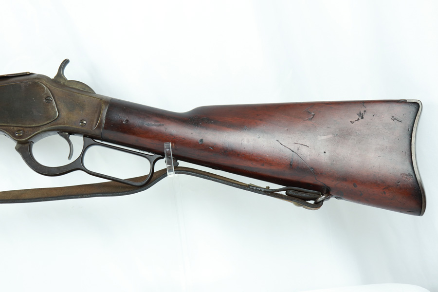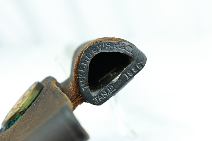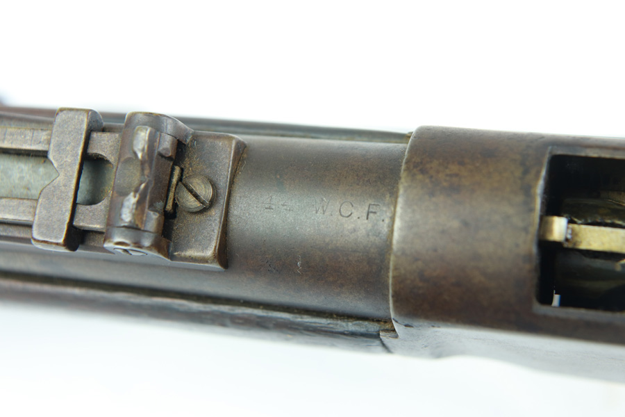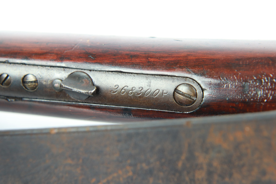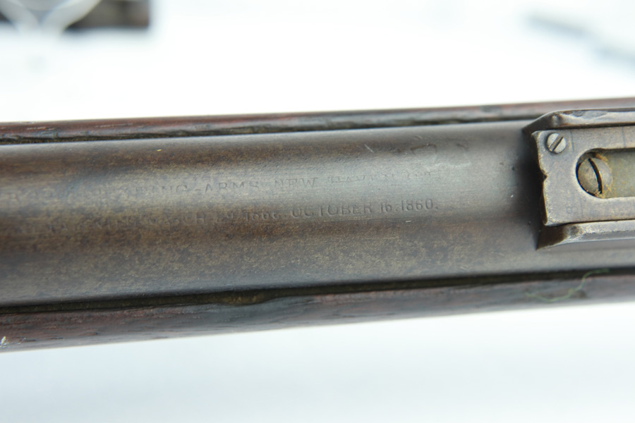 11/13/18 – Made in 1891, this is a scarce Winchester M1873 lever-action musket – third model. This rifle is in excellent condition considering its age, and the wood has aged incredibly well with only very minor nicks and scratches. There is pitting along the side of the barrel where it meets the wooden hand guard, but no other noteworthy flaws on the metal parts. There are little signs of actual finish loss or rub wear, though there is deep, uniform patina on all metal parts. Overall, the metal parts are browned from aging but in great condition. The lever action is smooth and well-functioning. The bore is surprisingly strong, with strong rifling and a decent shine. There is some frost and minor freckling throughout, but it looks like it is still fireable. The rifle includes an original bayonet that is in excellent condition and smoothly locks into place on the barrel. The bayonet is sheathed in an excellent scabbard that is marked “McKENNEY’S PAT. JAN 12 1886” with an “N.G.P.” buckle. The rifle also includes an original sling which, again, is in great condition considering the age of the rifle. The rifle’s iron frame employs Winchester superintendent Nathan King’s 1866 patent for storing cartridges in the tube and also for loading the tube through a hinged gate on the right side of the frame. Lever-action frame has a sliding, rail mounted dust-cover with serrated thumb edges, no saddle ring, and is fitted to a two-piece, oil-stained black walnut stock and forend. Forend wears the iron nose cap.