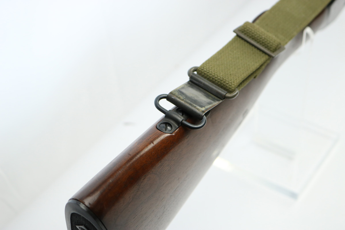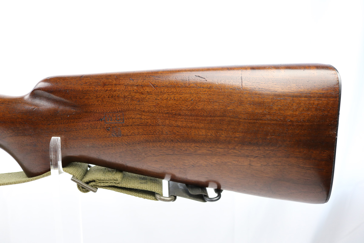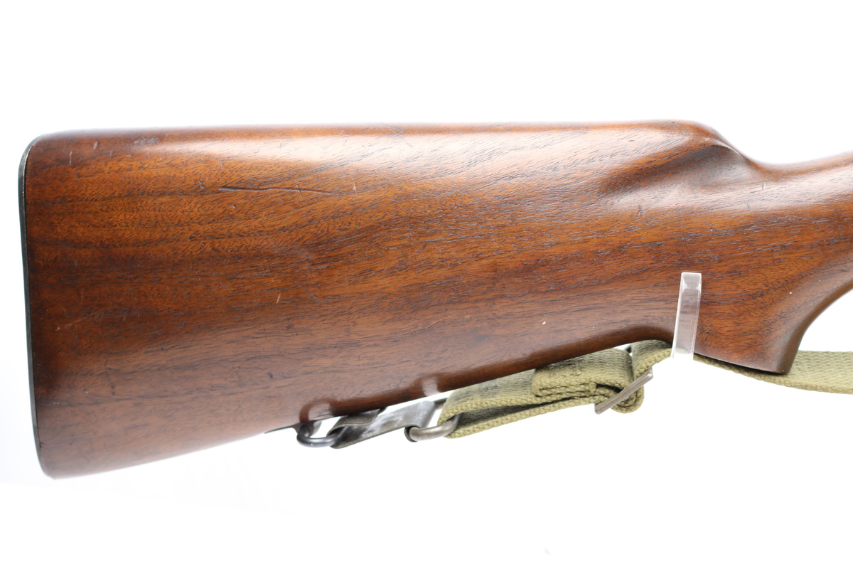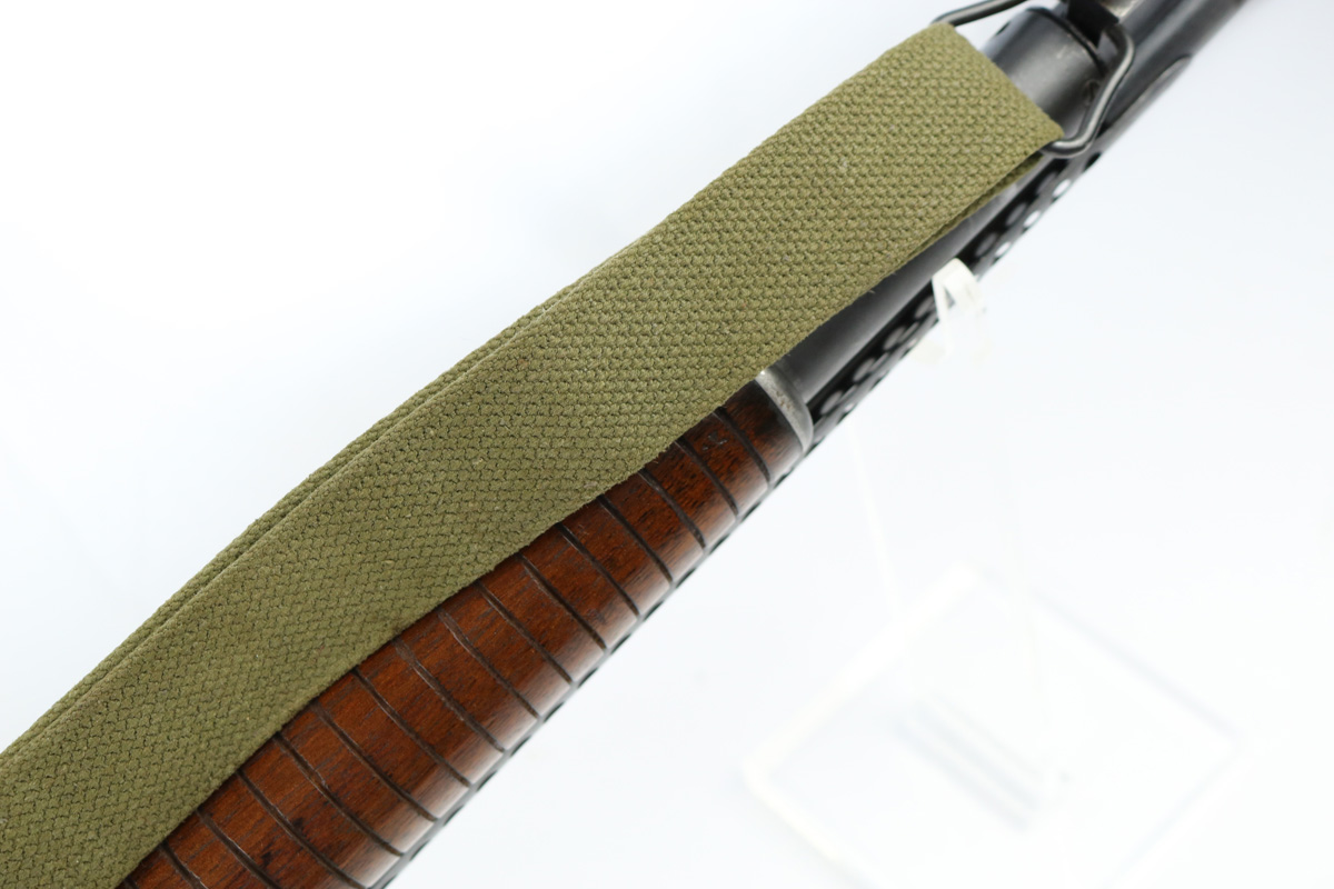 8/3/18 – This is an original Winchester model 1897 Trench Shotgun made during WW2. This shotgun was produced in 1942 and comes with the original factory shroud and bayonet lug. The shotgun is a proper takedown model and in about 90% overall condition. A 1944 dated canvas sling is also included. The shotgun has a very nice blued finish, with a small spot of pitting on the shroad, but the rest of the shroud is minty. There’s typical bluing loss on the tube from use. The barrel has browning / patina throughout – especially towards the receiver / legend area. The receiver is excellent though, despite a few light surface scratches. Has the U.S. and flaming bomb ordnance proof on one side of the receiver. The wood stock is excellent and properly cartouche stamped with a W.B. inspector proof. Overall excellent collector trench shotgun. Smooth action, fully functional and guaranteed original.