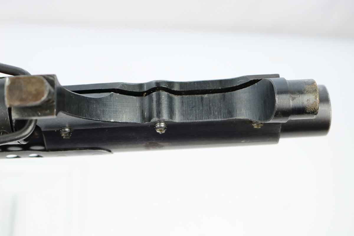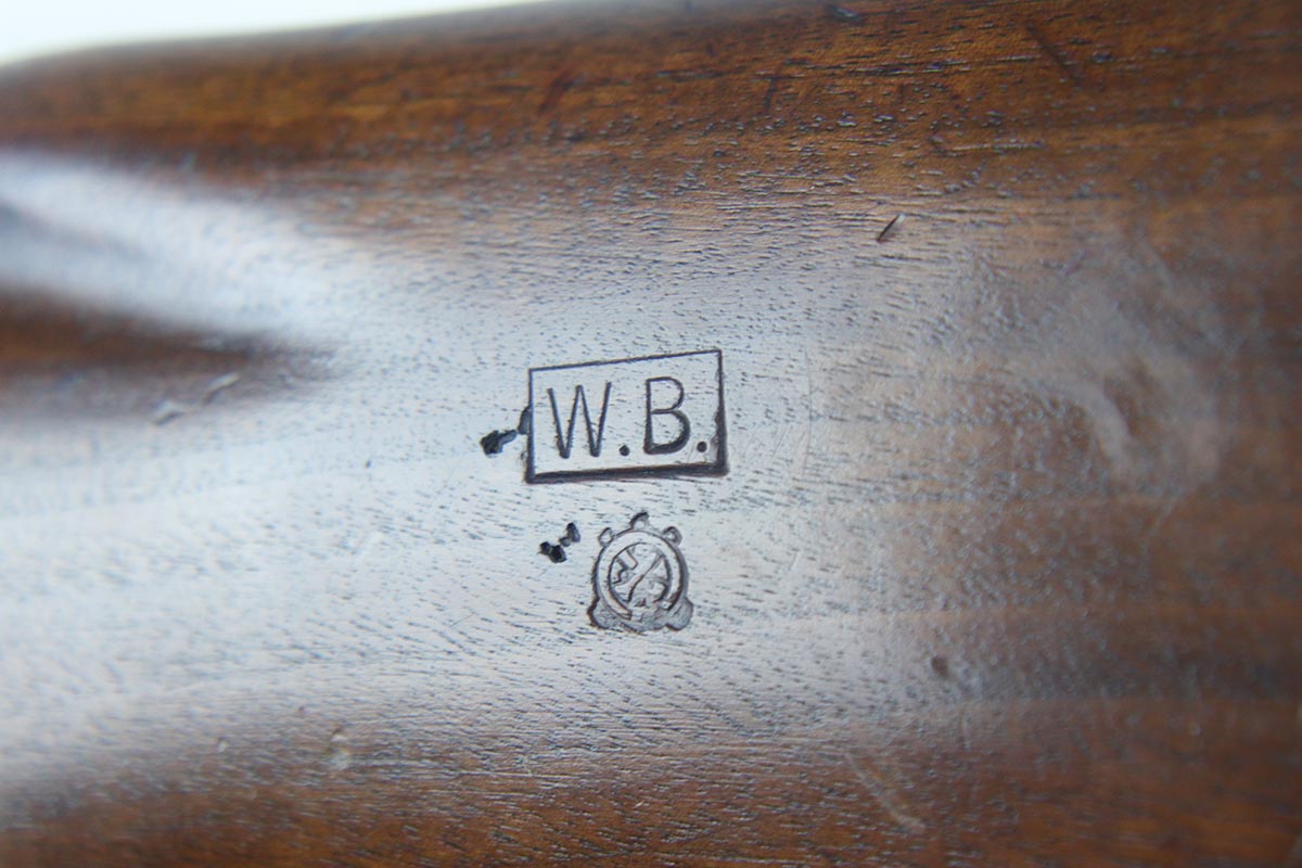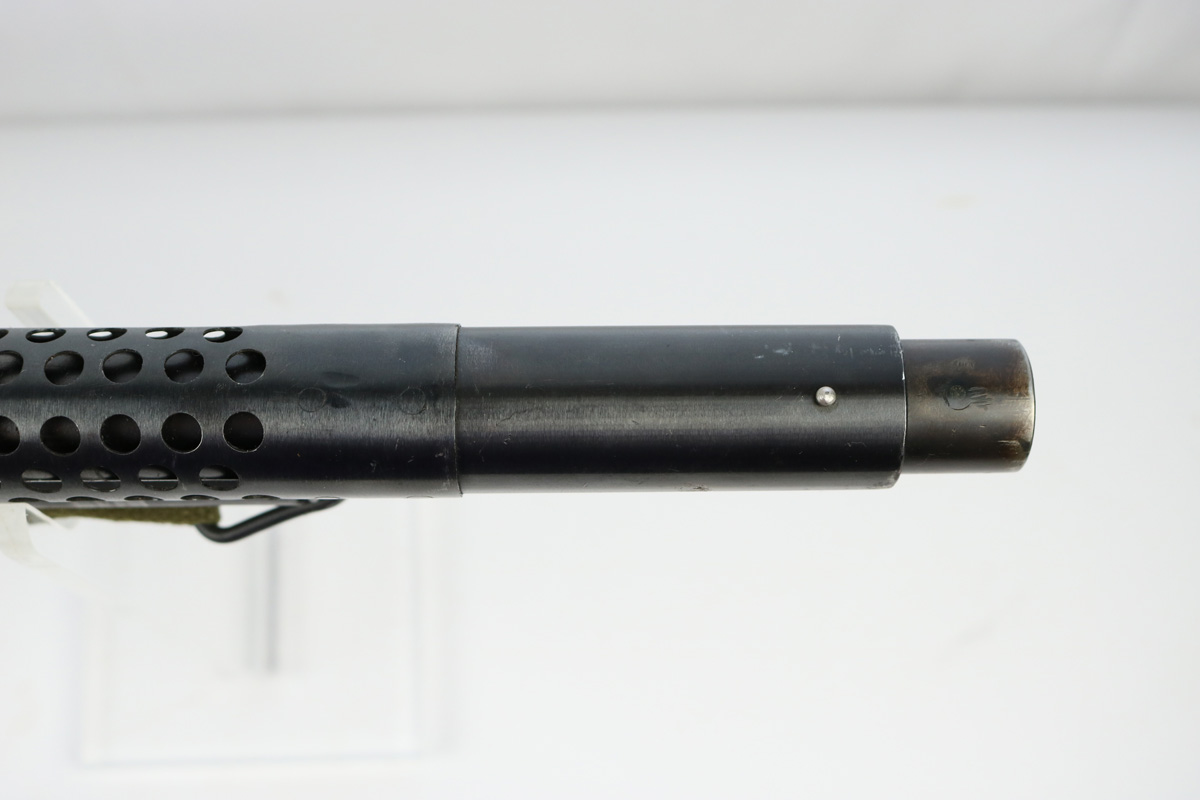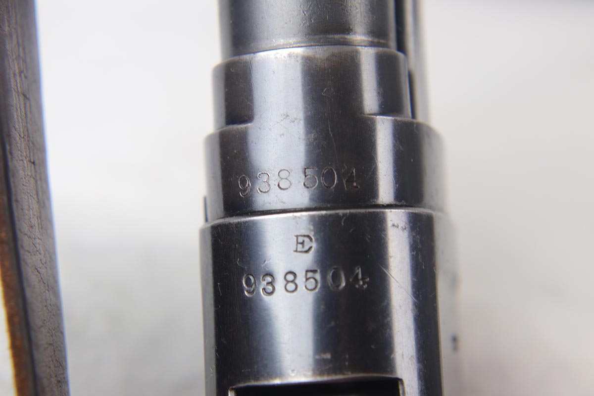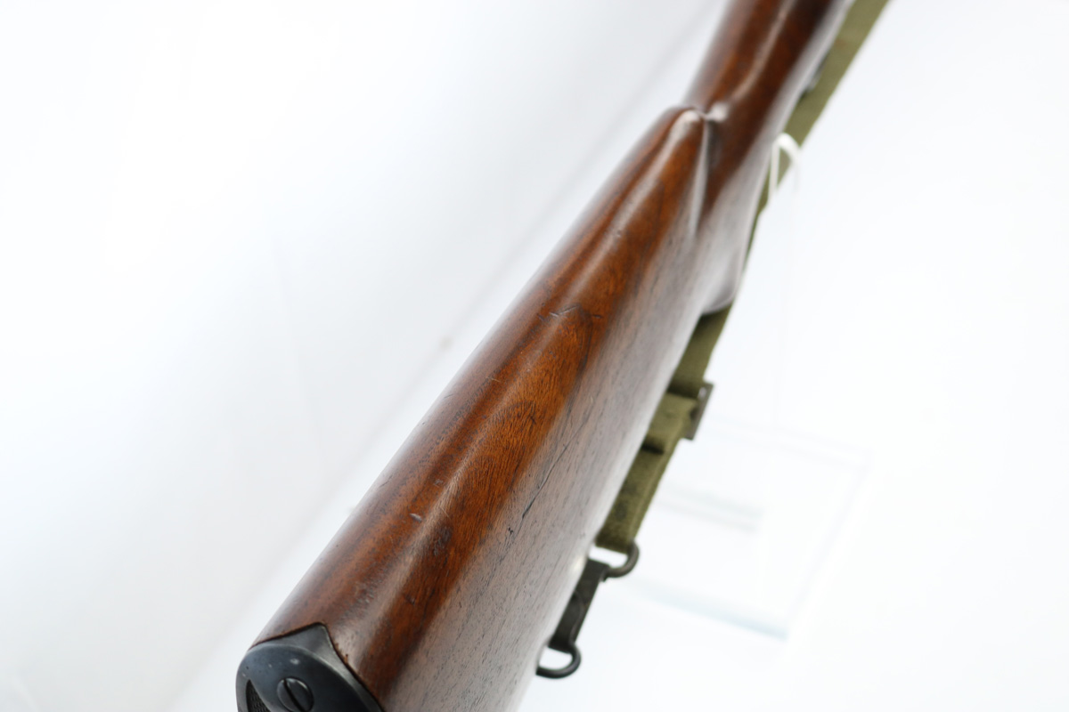 8/3/18 – This is an original Winchester model 1897 Trench Shotgun made during WW2. This shotgun was produced in 1942 and comes with the original factory shroud and bayonet lug. The shotgun is a proper takedown model and in about 90% overall condition. A 1944 dated canvas sling is also included. The shotgun has a very nice blued finish, with a small spot of pitting on the shroad, but the rest of the shroud is minty. There’s typical bluing loss on the tube from use. The barrel has browning / patina throughout – especially towards the receiver / legend area. The receiver is excellent though, despite a few light surface scratches. Has the U.S. and flaming bomb ordnance proof on one side of the receiver. The wood stock is excellent and properly cartouche stamped with a W.B. inspector proof. Overall excellent collector trench shotgun. Smooth action, fully functional and guaranteed original.