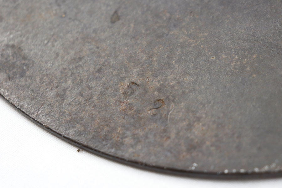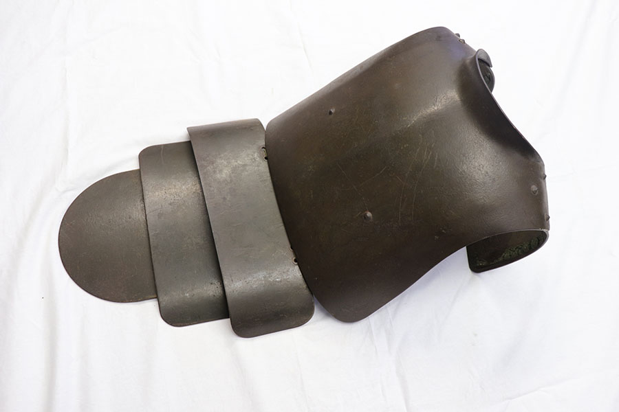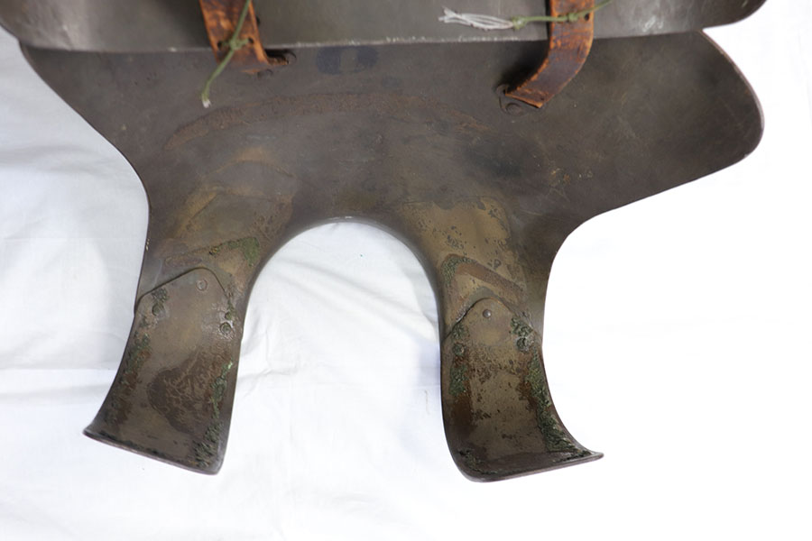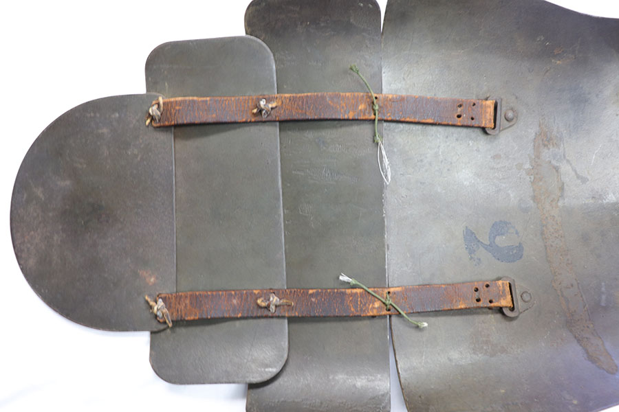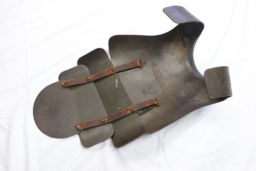 1/8/21 – This is a rare and original set of body armor that would have been used by a machine gunner in World War I. It includes the large, heavy steel breast plate with the three lower articulated torso steel plates. This set is constructed from steel plates 3/20ths of an inch thick, and is of the typical style that was produced for use by machine gunners and snipers during WWI, and is what you usually see in the WWI and WWII German newsreels. The armor features the original paint, but period replaced straps as the originals would have been made of canvas. One plate has a serial number, and there is some internal paint but unsure the significance. Our first time ever offering such a piece!