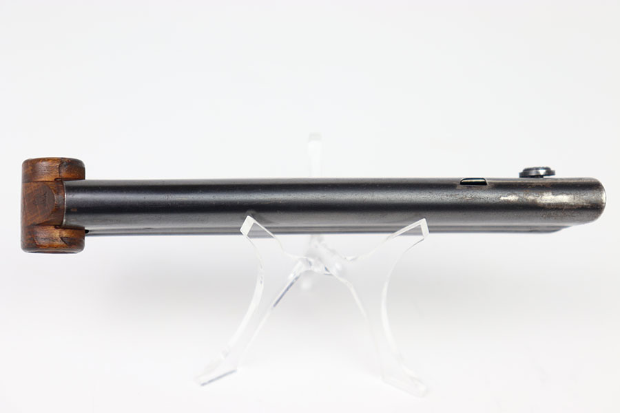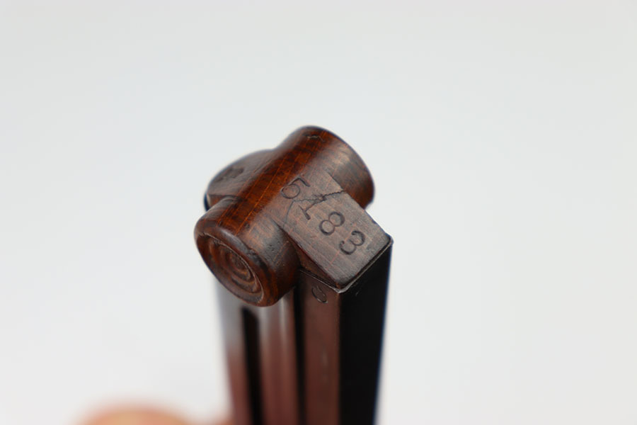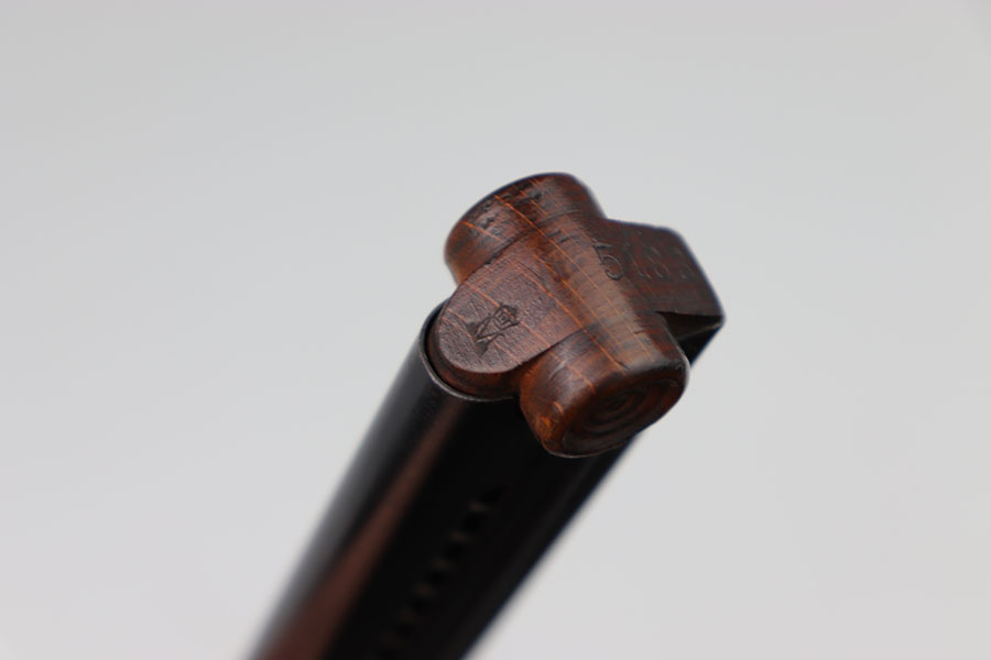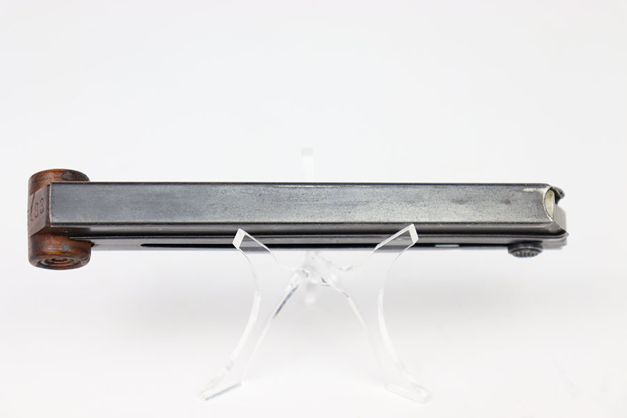 2/23/24 – This is a rare example of a WW1 Navy Luger Magazine with a blued tube. Most WW1 Navy Luger magazines come with a nickeled tube, but this one is blued. The magazine is in excellent condition with some light wear around the top edges of the tube as well as on the side of the window/track. The wood bottom is in minty condition with the Navy crown M and serial number 5183. The spring of this magazine is strong and functional. Overall a really unique find and excellent piece.