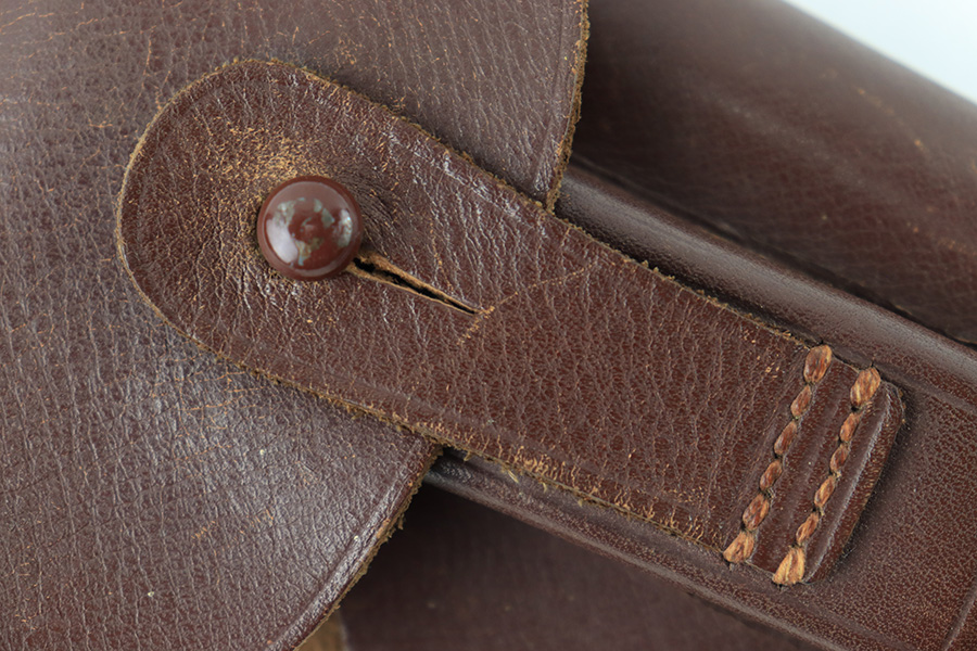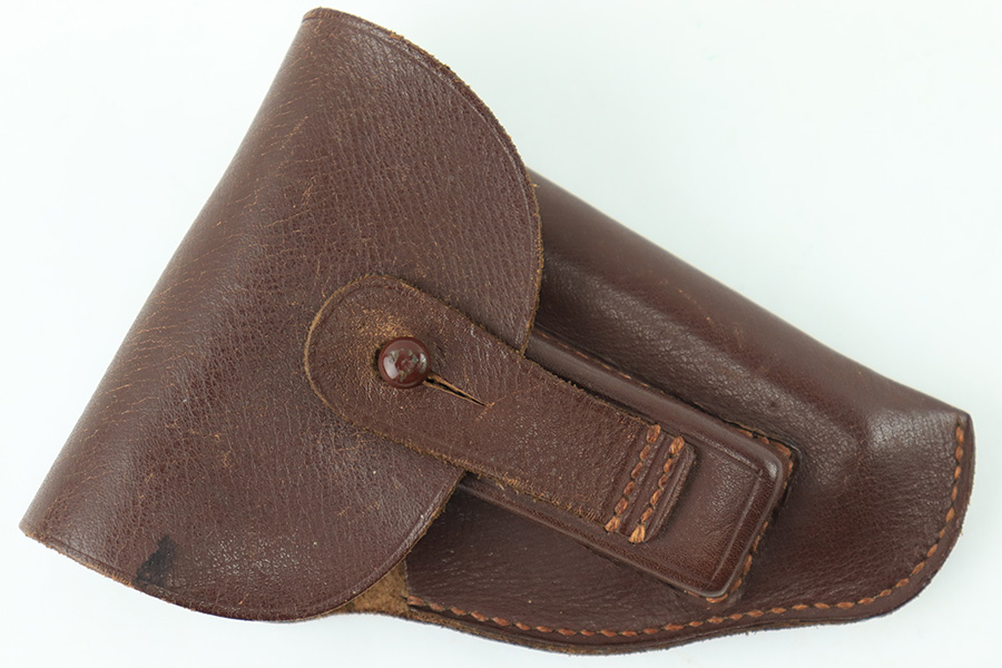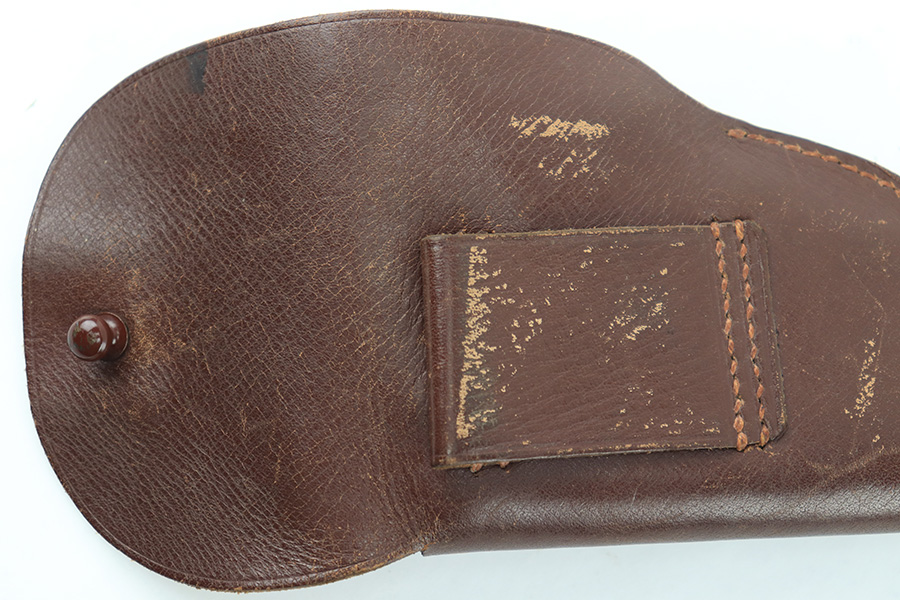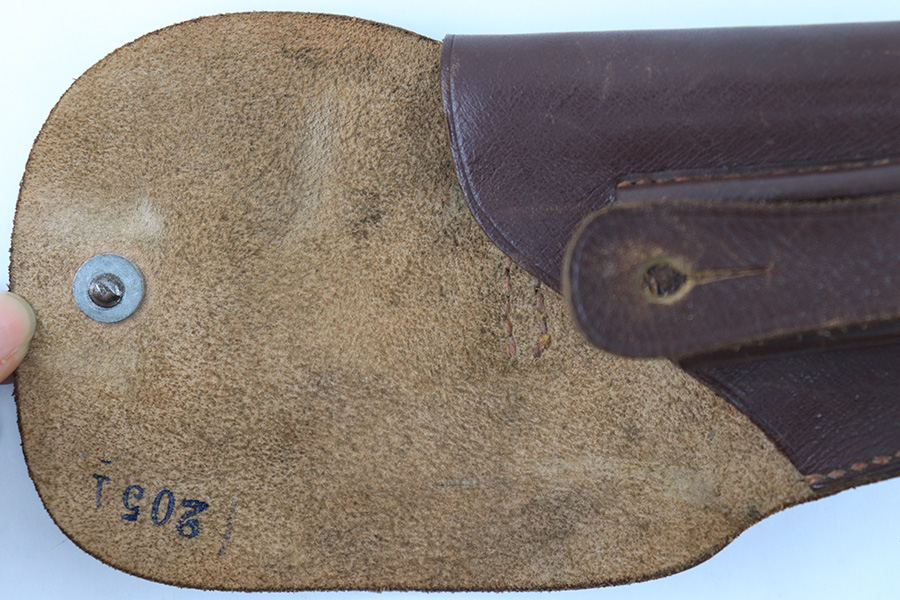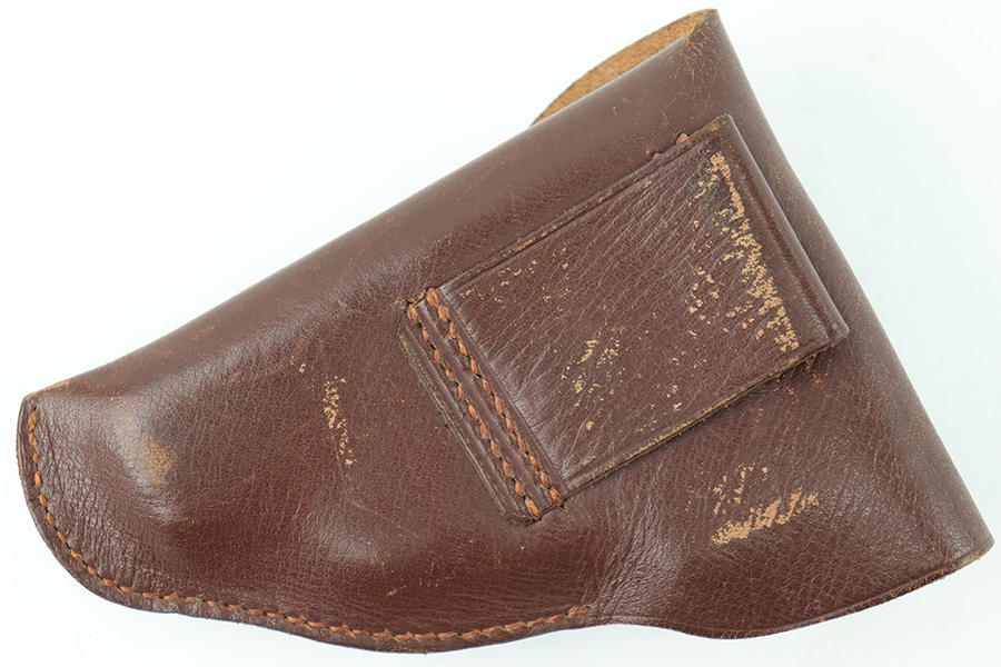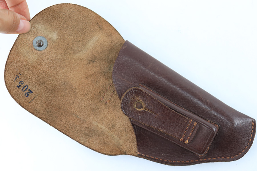 8/18/23 – This is an original WW1 era production Steyr Piper 6.35mm holster. The holster could also be used for similar sized German pocket pistols. The leather and stitching are all original and intact throughout this example. Normal pliability and light signs of previous use. Ink stamped 2051 on the interior leather, with no other markings. A fairly scarce holster.