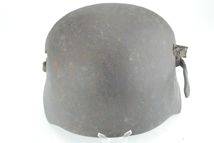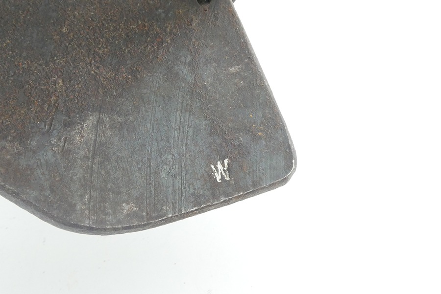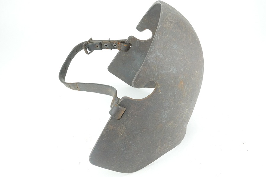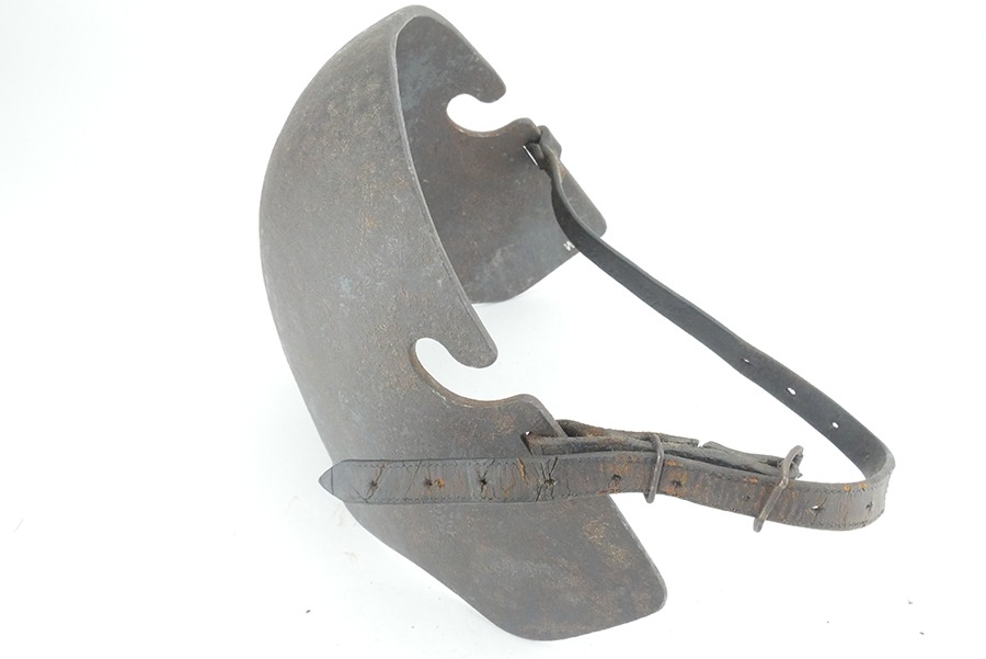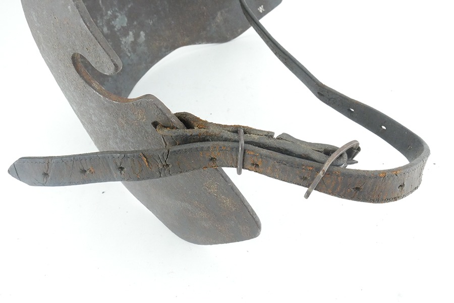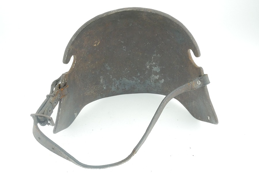 11/6/24 – This is a rare WW1 production German Stirnpanzer helmet attachment with the original leather attachment strap. These attached to the lugs found on M1917 German helmets, and was used as an additional armored reinforcement for the front of a soldier’s helmet. These were issued to machine gunners and those who were “high priority” targets. This example has some mild surface rust and typical aging throughout the metal, but there is no pitting or major issues. No dents. The metal is maker stamped with a “W”. The leather strap has some cracking but is still completely intact.