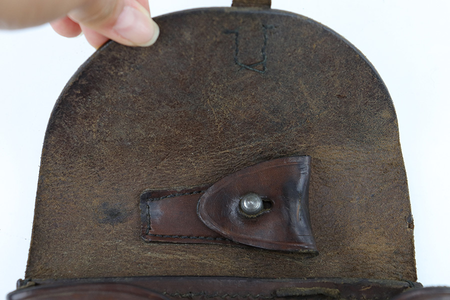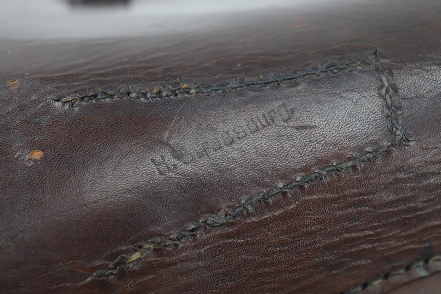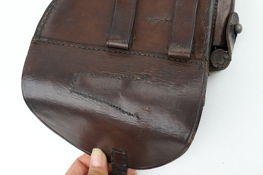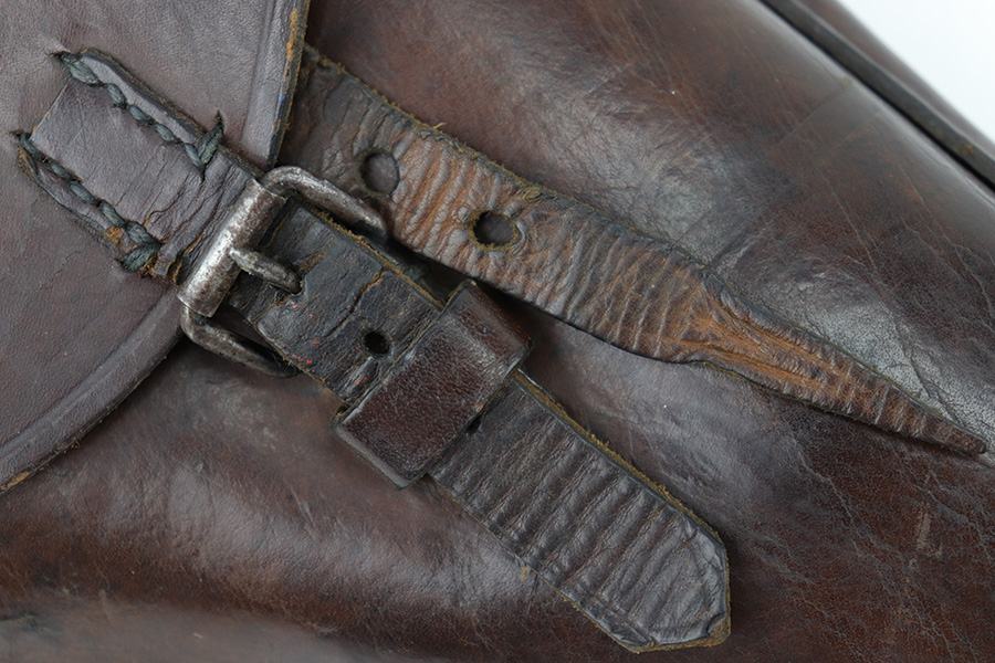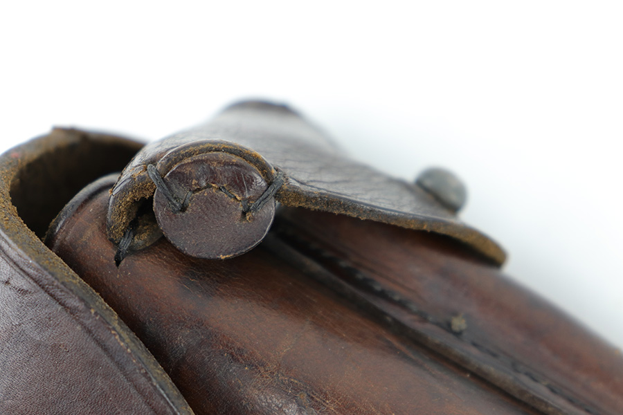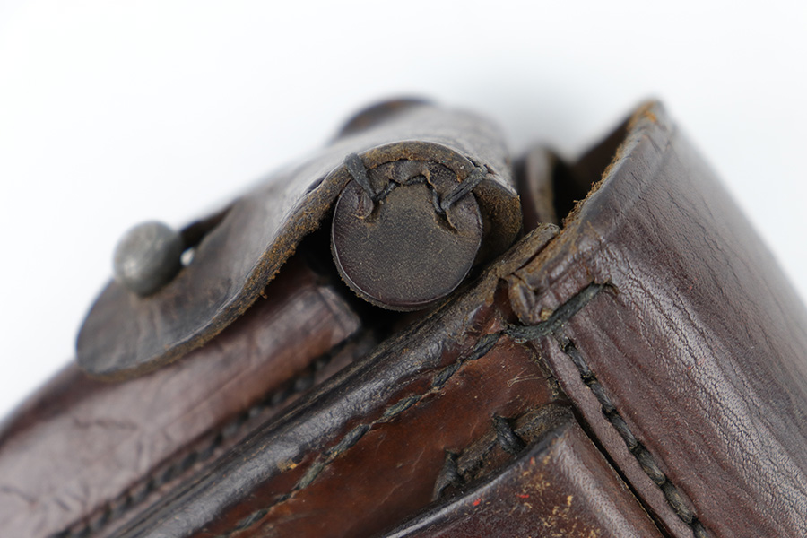 6/21/23 – This is a rare variation WW1 Imperial Navy Luger holster. The holster is in excellent condition with very nice dark brown leather and all original black stitching intact. There’s no notable stitching issues, and all the stitching is tight. This example has exceptionally excellent leather for the side cleaning tool; this leather is typically weak and worn but not on this example. The leather has normal pliability and some mild surface wrinkling with clean interior leather. The front leather is maker stamped with a crisp marking. The back leather has an upside down “L.Z.A.” distributor stamp. A very hard-to-find holster in excellent condition.