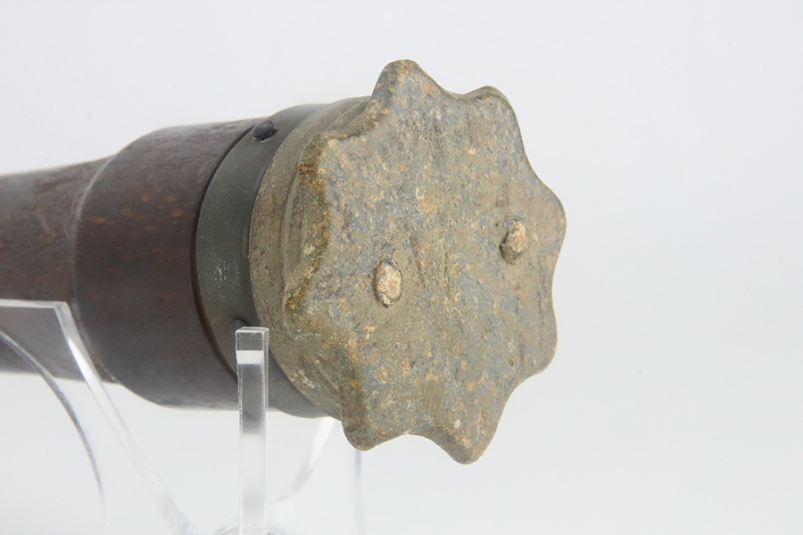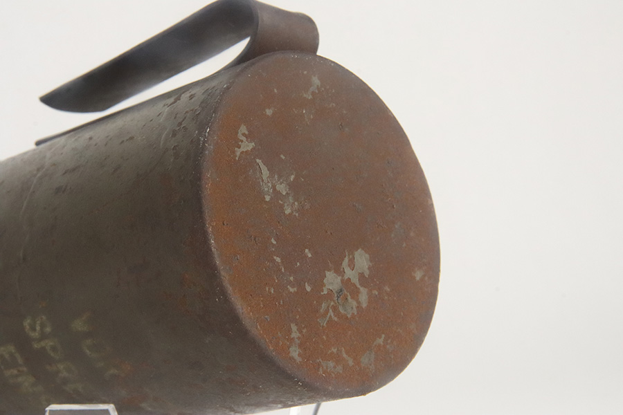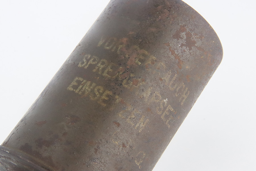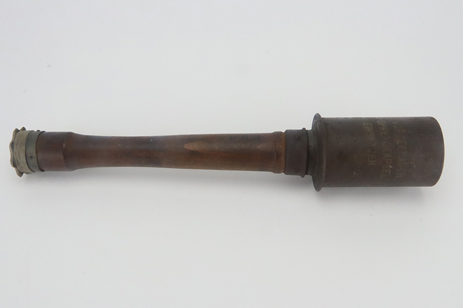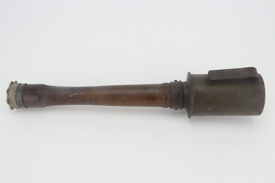 5/2/24 – This is a rare WW1 production M17 German grenade that has been decommissioned. The grenade top screws off and is empty inside. The base metal cap at the bottom of the wood handle pops off and is empty as well (no string inside). The metal has some light rust / discoloration throughout. The wood handle is excellent. Maker-stamped.