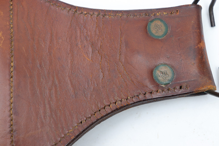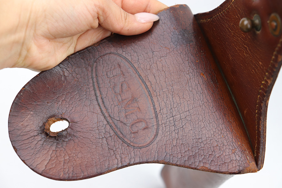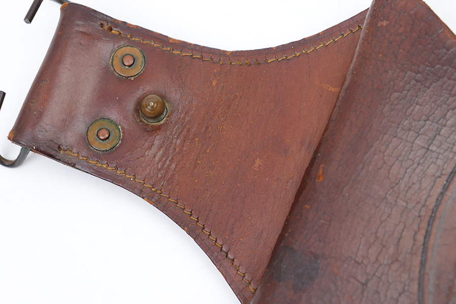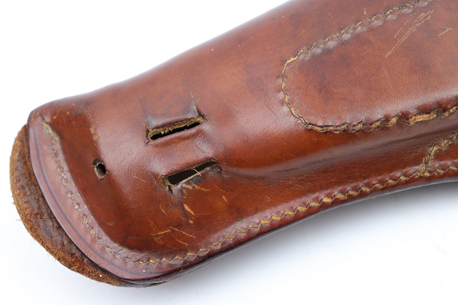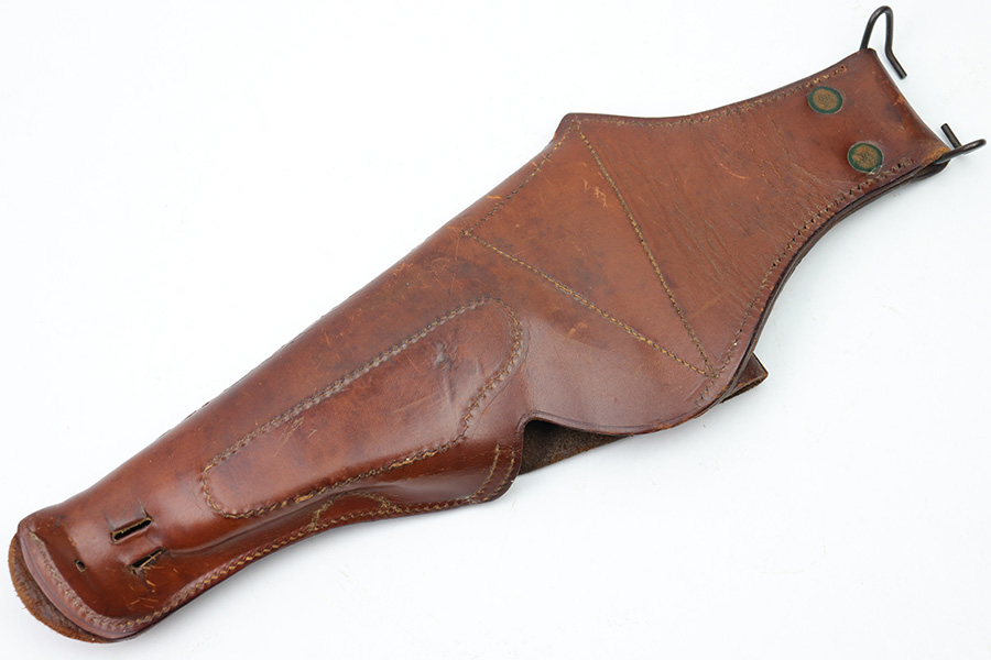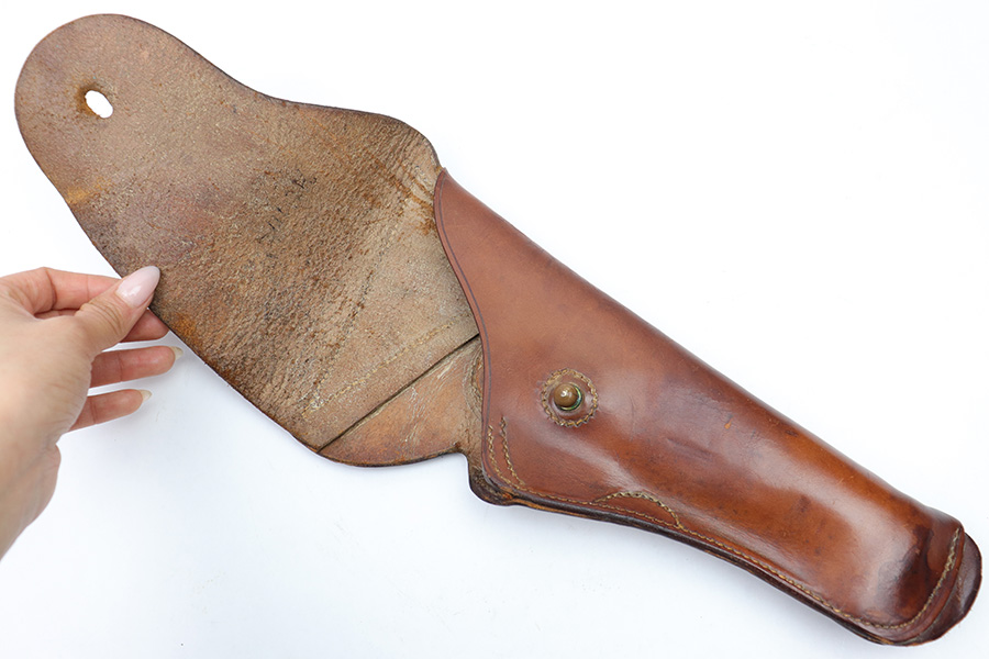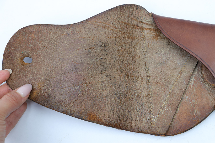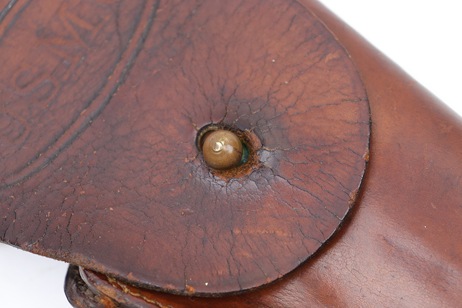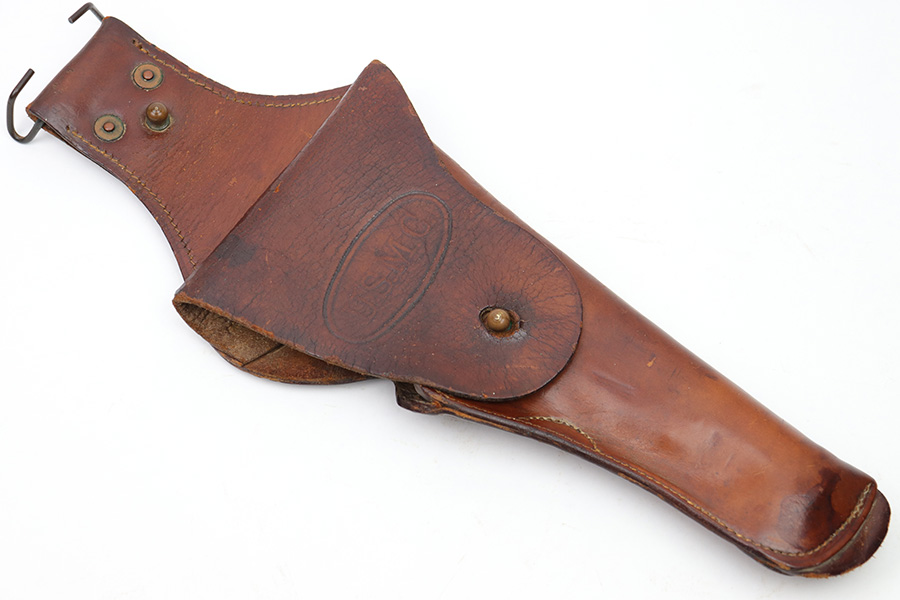 1/26/23 – This is a rare USMC stamped US M1912 holster for a 1911 Colt pistol. These are fairly scarce, early / pre WW1 production holsters. This example is in great overall condition with a distinct U.S.M.C. stamp on the front leather. The leather has surface wrinkling and some surface cracking around this area of front / lid leather. There’s mild scuffing around the edges of the leather as well. The leather has normal pliability and considering its age, is in great overall condition. The stitching is all original and intact, and the original brass fixtures are all intact as well. No lanyard attached or included (as shown). The interior leather shows aging and mild wear, as well as a name lightly scratched into the leather.