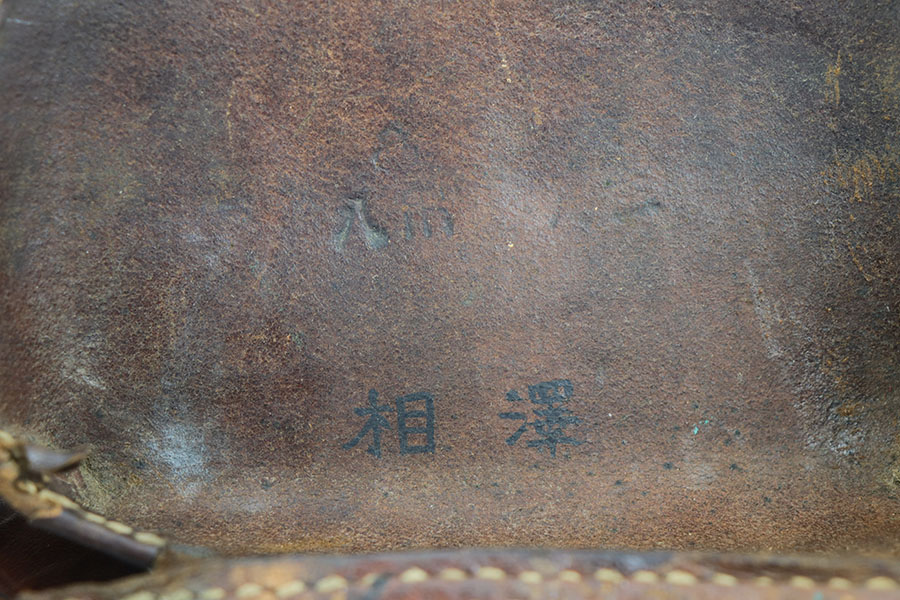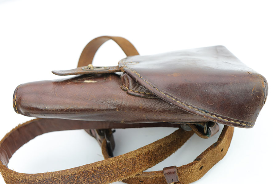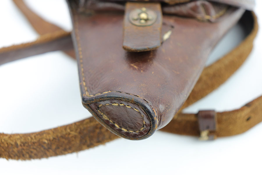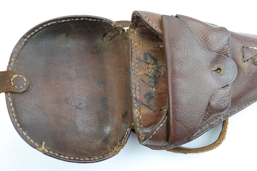 2/4/20 – This is an extremely scarce Japanese Baby Nambu holster from WW2. The holster comes with a leather shoulder strap that we believe is reproduction due to the thickness and quality of the leather (albeit a high quality reproduction). The holster leather only has minor surface wrinkling and normal signs of use. Stitching appears to be all original and in tact, except for the small triangle of stitching next to the closure knob. The interior leather is marked with Japanese symbols, likely maker markings, but we aren’t sure. The leather is soft with normal pliability. A very hard to find piece of WW2 history!