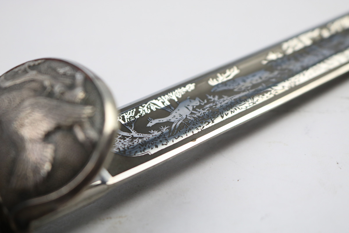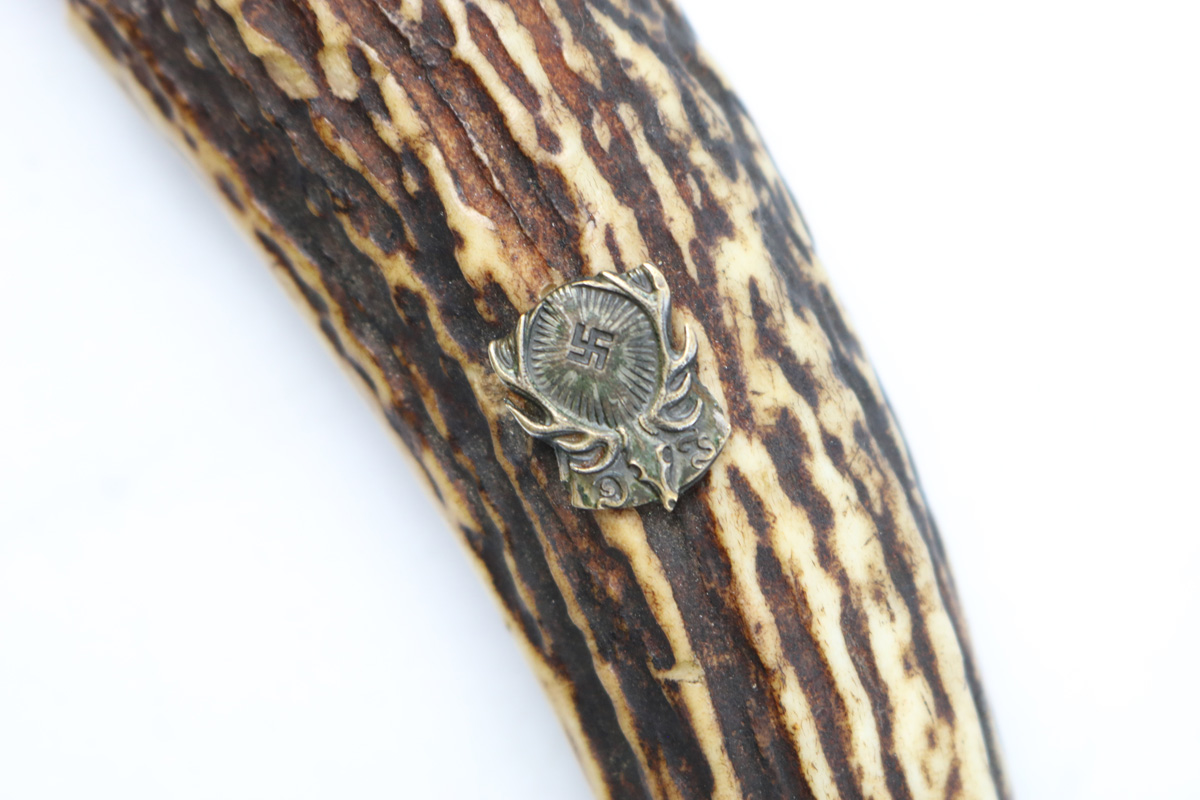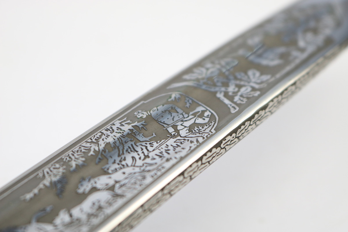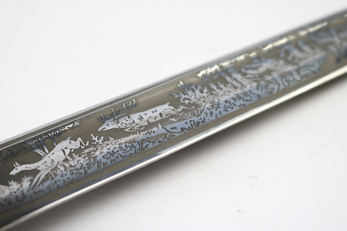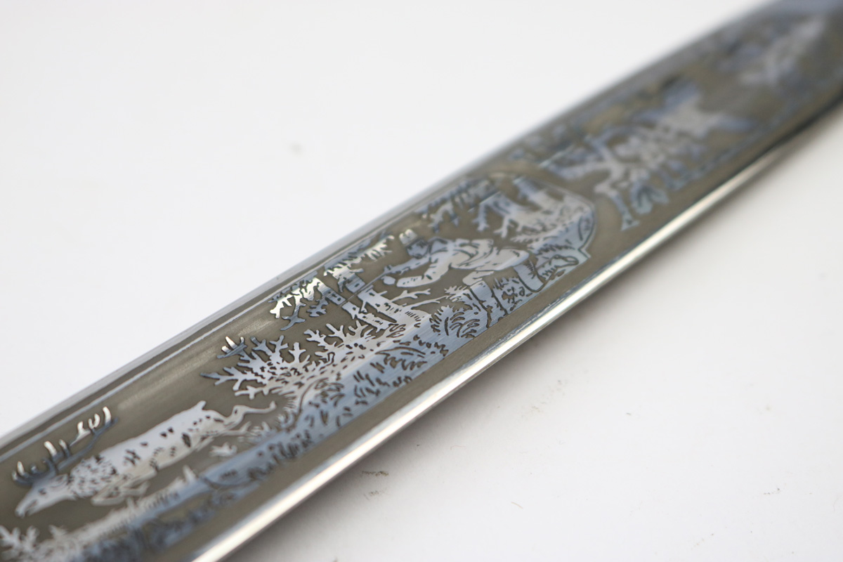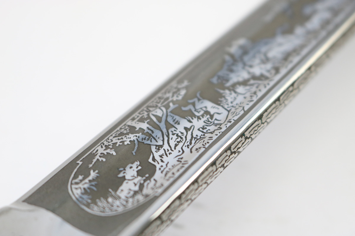 7/2/18 – This is an original WW2 production Hunting Assn. knife. The knife was given to members of Germany’s national hunting association. The blade is beautifully etched/engraved with two hunting scenes. Eickhorn maker marked side shows a pack of dogs taking down a boar. The reverse side is a hunter shooting at deer. The “spine” of the blade is also engraved with forestry leaves. The stag handle is excellent and features a deer with a nazi swastika between the antlers. The pommel and hand guard are pristine with beautiful engravings. Both the pommel and hand guard show normal dark patina. The leather scabbard stop isin tact and original, but shows aging and light wear from use. The scabbard has normal patina and finish wear but there’s not rust or pitting, and the stretched leather body of the scabbard is excellent and in tact. Beautiful craftsmanship and quality. These are very hard to find in this condition. Guaranteed original and authentic.