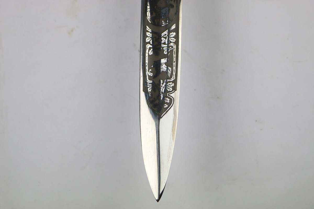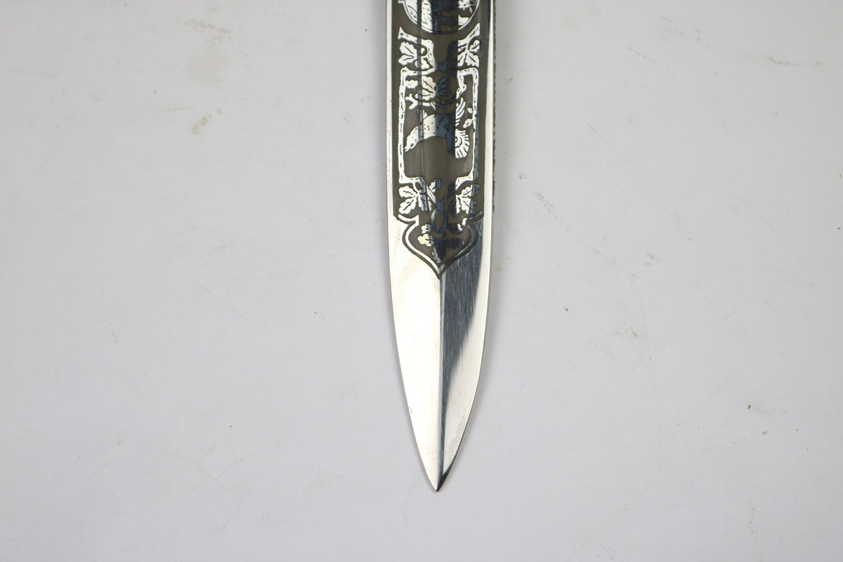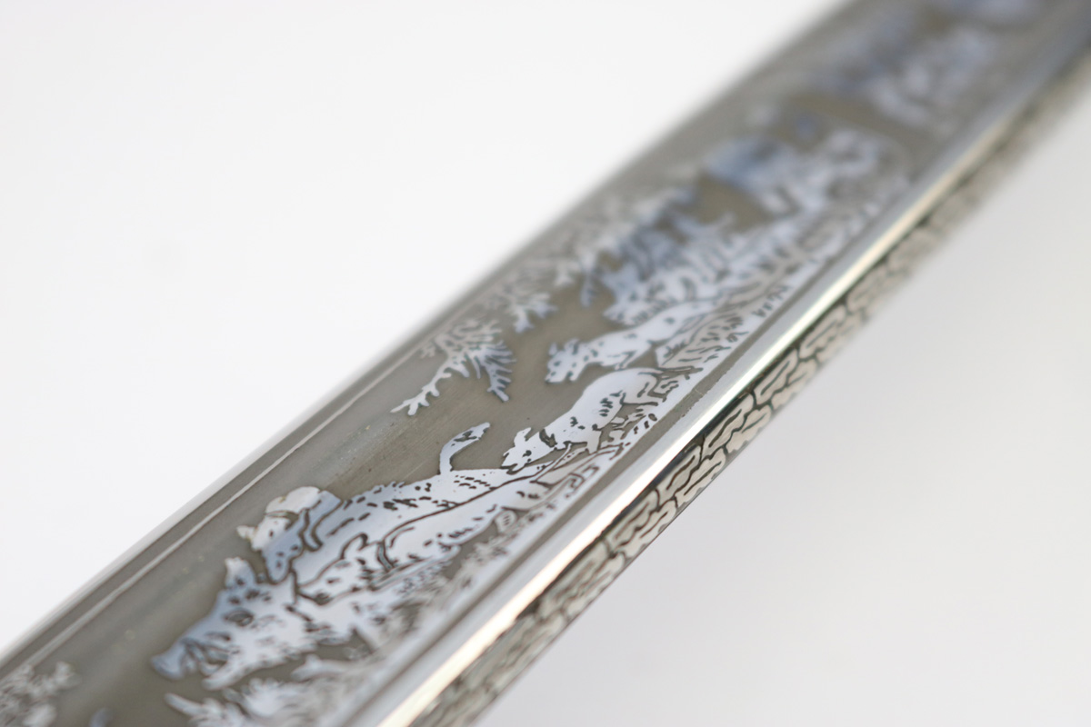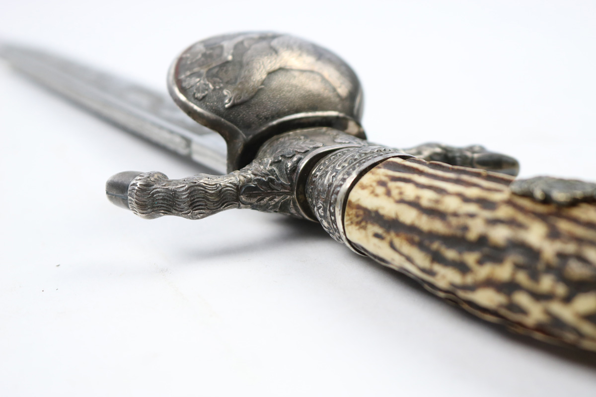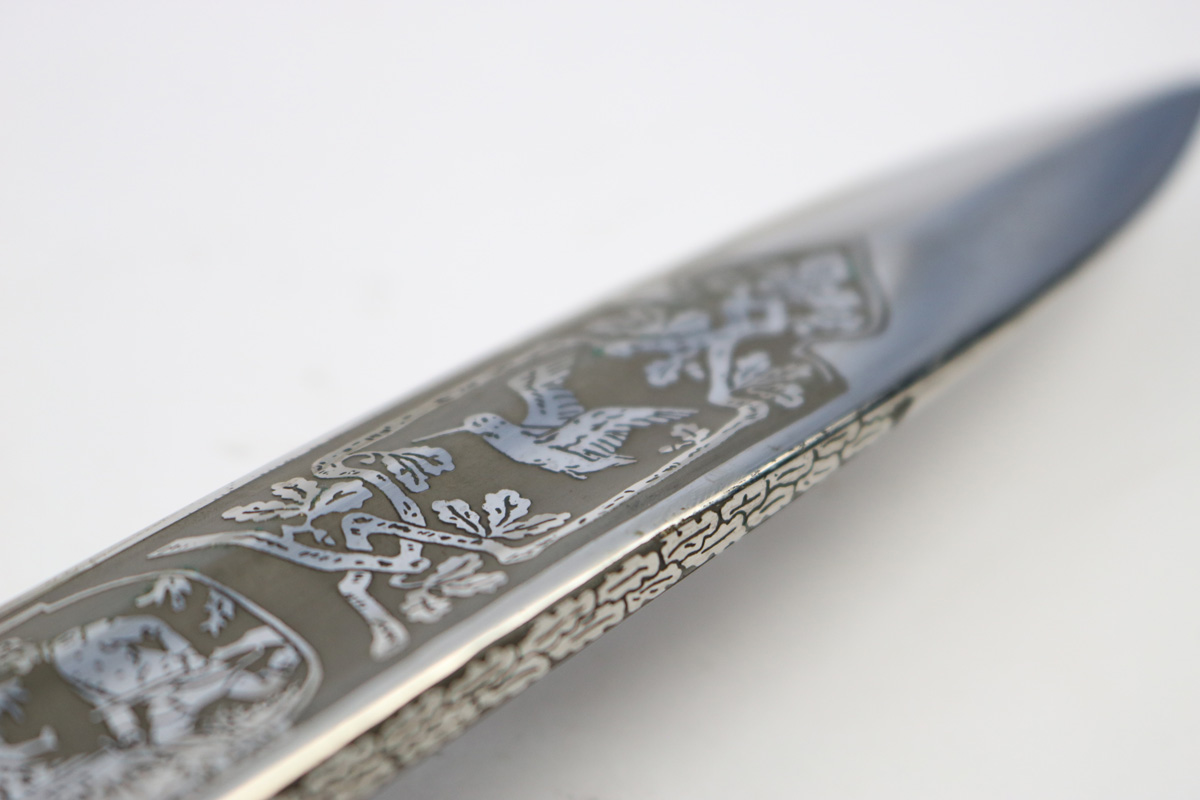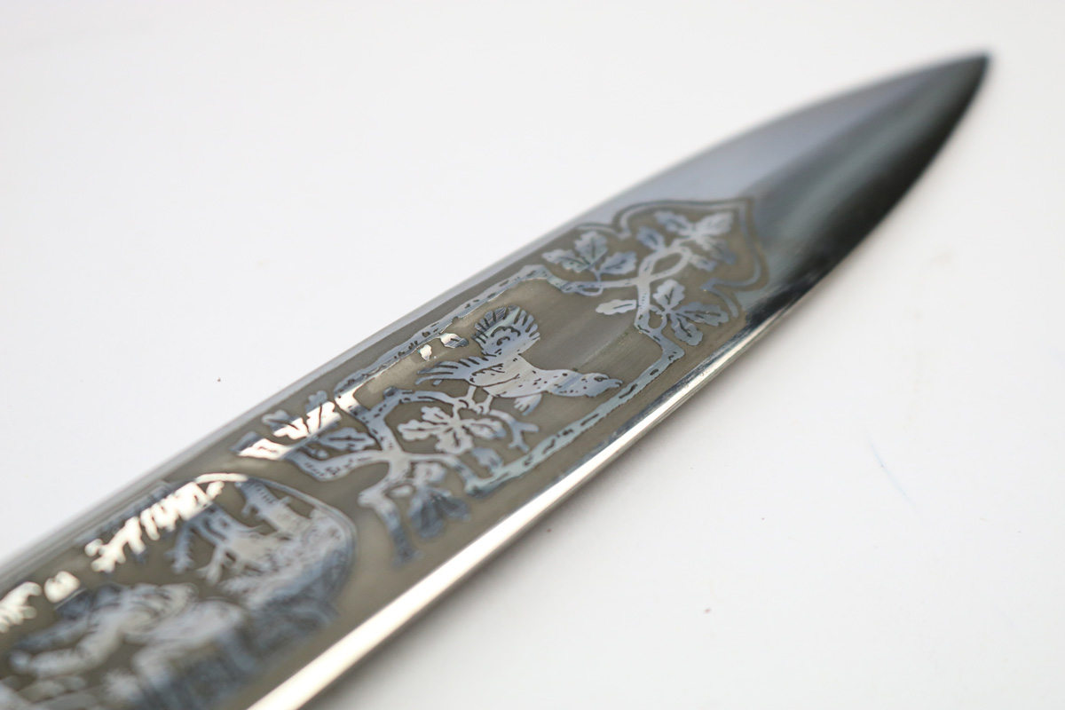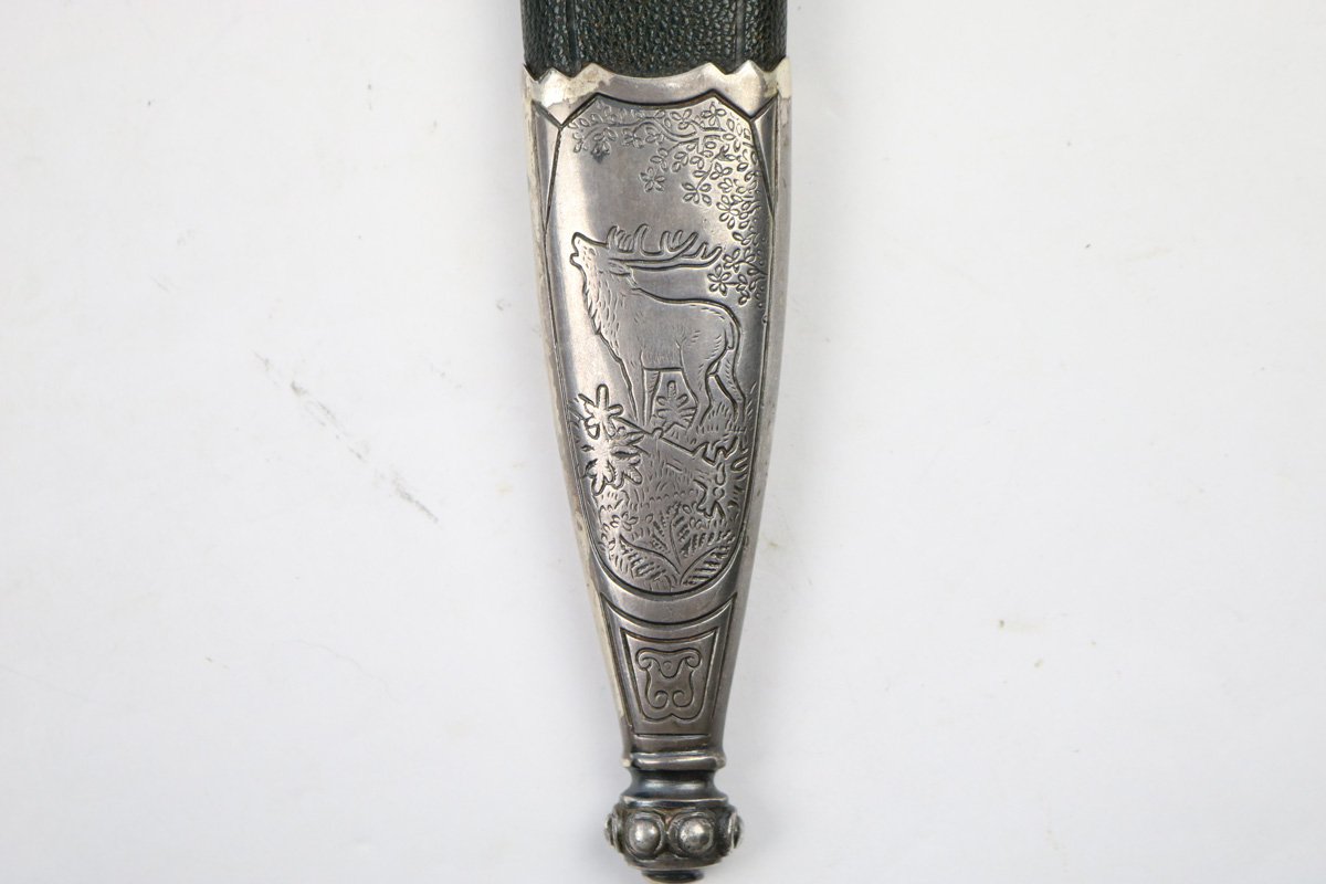 7/2/18 – This is an original WW2 production Hunting Assn. knife. The knife was given to members of Germany’s national hunting association. The blade is beautifully etched/engraved with two hunting scenes. Eickhorn maker marked side shows a pack of dogs taking down a boar. The reverse side is a hunter shooting at deer. The “spine” of the blade is also engraved with forestry leaves. The stag handle is excellent and features a deer with a nazi swastika between the antlers. The pommel and hand guard are pristine with beautiful engravings. Both the pommel and hand guard show normal dark patina. The leather scabbard stop isin tact and original, but shows aging and light wear from use. The scabbard has normal patina and finish wear but there’s not rust or pitting, and the stretched leather body of the scabbard is excellent and in tact. Beautiful craftsmanship and quality. These are very hard to find in this condition. Guaranteed original and authentic.