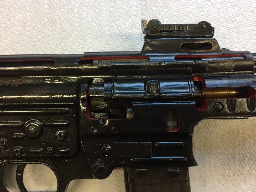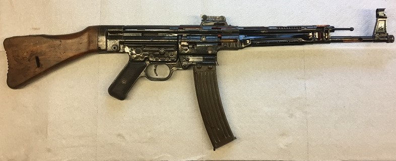 The receiver was originally a non amnestied, non registered automatic that had to be rendered totally inoperable, as it was illegal in its original configuration. The receiver has been cut away on the right side to reveal the fascinating inner workings of the worlds very first intermediate caliber assault rifle. The barrel, chamber, recoil system, sight block mount, magazine well, gas operating system, and bolt and bolt carrier are visible through the red coated cut away sections. The barrel contains a deactivated 7,92 Kurz shell, with a live primer but no gun powder, as does the original WW2 magazine. DO NOT ATTEMPT TO DISCHARGE SHELL IN A LIVE RIFLE, IT WILL RESULT IN A JAMMED BARREL, POSSIBLE SERIOUS INJURY OR DEATH. The bolt has no firing pin hole, but does contain a wartime firing pin. The bolt and bolt carrier function as originally designed and the rifle can be safely charged as per normal, but the bolt will not chamber rounds from the magazine, nor will it extract rounds from the barrel, to ensure no attempt to fire the rifle is ever possible.