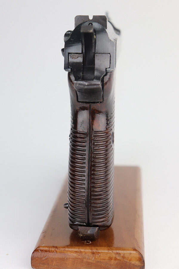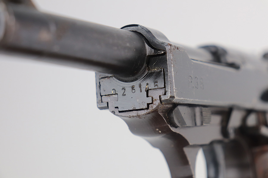 5/26/21 – This is a rare Zero-Prefix Walther P.38 issued to the Nazi military in 1945. This is the last military contract for these guns. It is all matching and has the proper “Eagle 359” military proofs. It has retained about 95% of its original finish. There is minor wear on the high edges of the slide and light scratching here and there. While there isn’t much actual finish loss, there are areas of significant pitting throughout. Comes with nice grips and a period-correct magazine. Overall, the bore is shiny with strong rifling, but there is a very small area of pitting near the muzzle. De-cocker is functional.