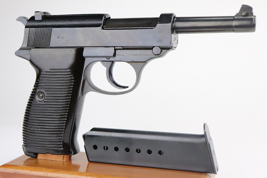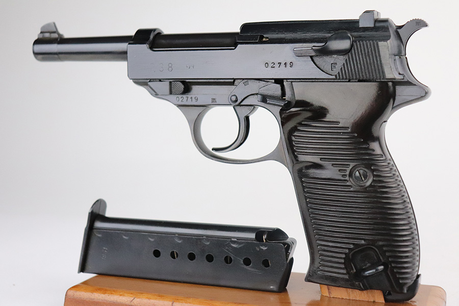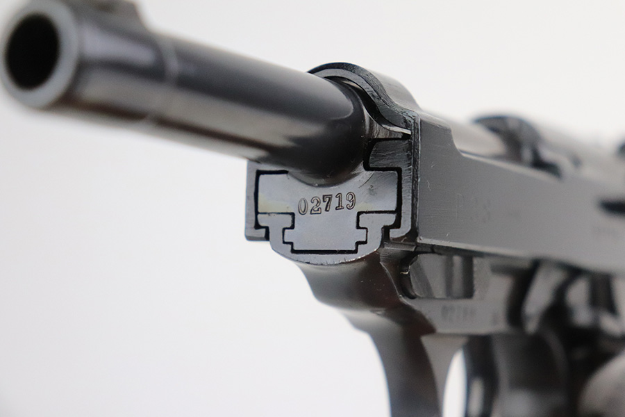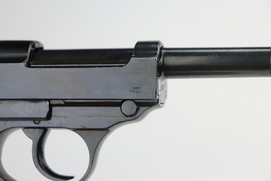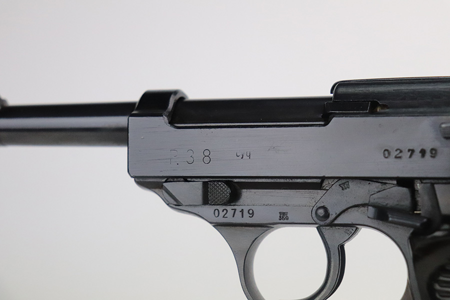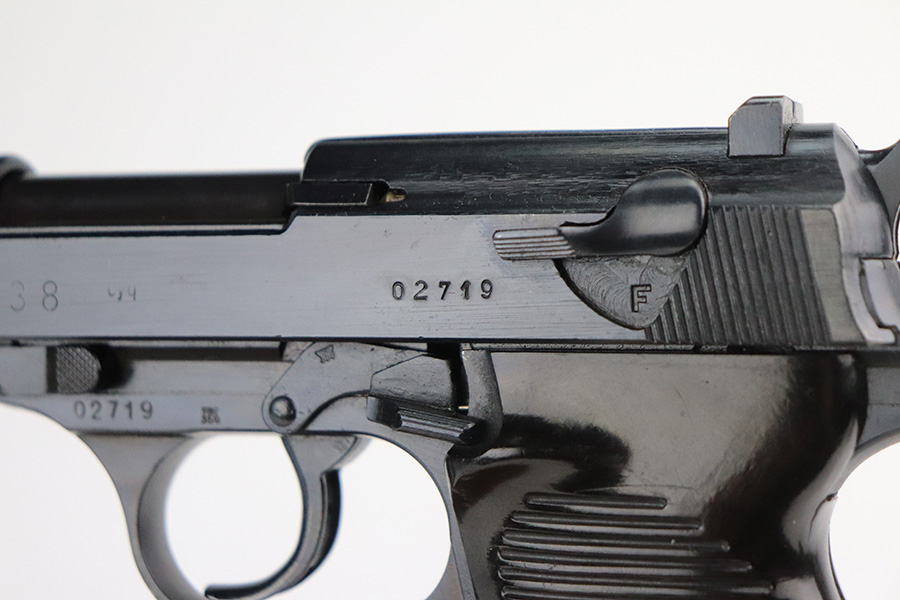 7/8/21 – This is an excellent example of a rare P.38. The gun was put together from parts, likely at the end of the war. It has a Zero Series Walther frame, a Walther barrel, most of the small parts are Walther-marked, and it has a Spreewerk slide. The gun has “Eagle 88” Nazi military proofs and an “Eagle Hza JC3” marking on the right side of the slide. “Hza” stands for Heereszeugamt or the Nazi Army Ordnance Office. It indicates that this gun was reworked at a Nazi Army Depot. All the parts were numbered to match at the depot. These guns are very rare. The gun has a very dark finish, and we believe it was “Russian dipped”. There is almost no finish loss – just a few very light handling marks here and there with a series of tiny scratches on the front strap. Comes with excellent grips and a Walther magazine. The bore has strong rifling with spotty oxidation in the grooves. The de-cocker is functional.