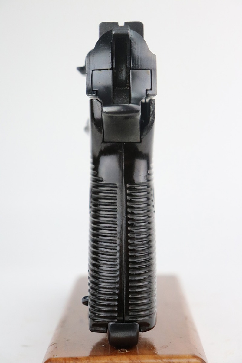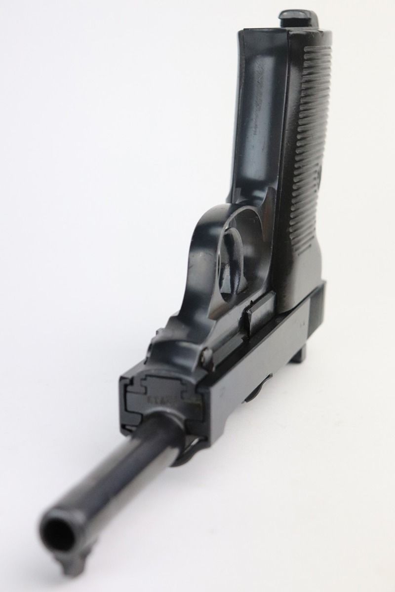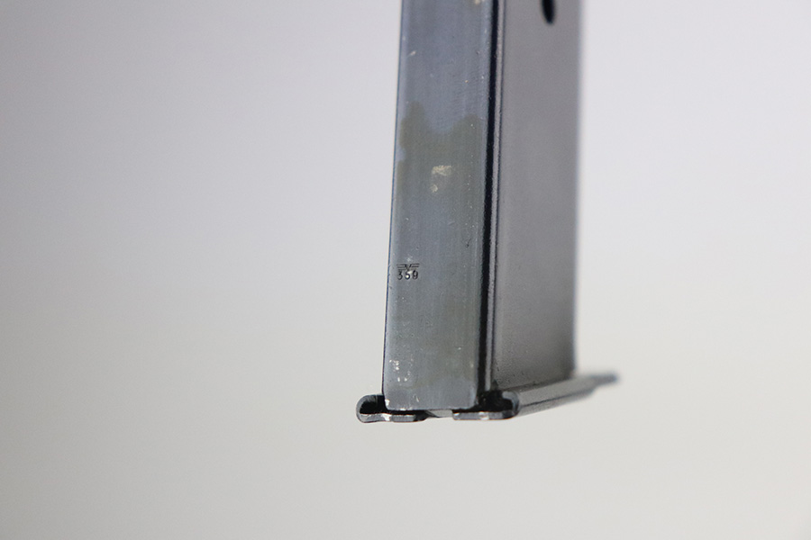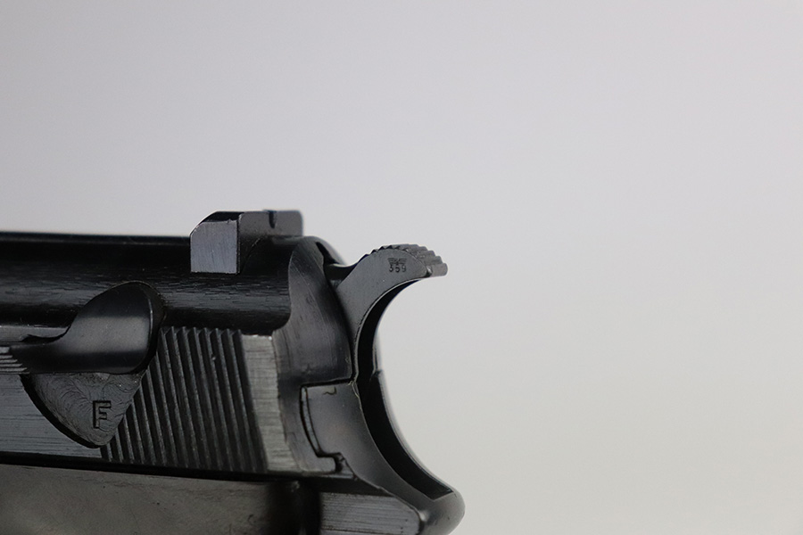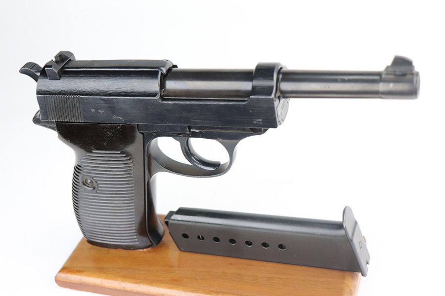 7/8/21 – This is an excellent example of a rare P.38. The gun was put together from parts, likely at the end of the war. It has a Zero Series Walther frame, a Walther barrel, most of the small parts are Walther-marked, and it has a Spreewerk slide. The gun has “Eagle 88” Nazi military proofs and an “Eagle Hza JC3” marking on the right side of the slide. “Hza” stands for Heereszeugamt or the Nazi Army Ordnance Office. It indicates that this gun was reworked at a Nazi Army Depot. All the parts were numbered to match at the depot. These guns are very rare. The gun has a very dark finish, and we believe it was “Russian dipped”. There is almost no finish loss – just a few very light handling marks here and there with a series of tiny scratches on the front strap. Comes with excellent grips and a Walther magazine. The bore has strong rifling with spotty oxidation in the grooves. The de-cocker is functional.