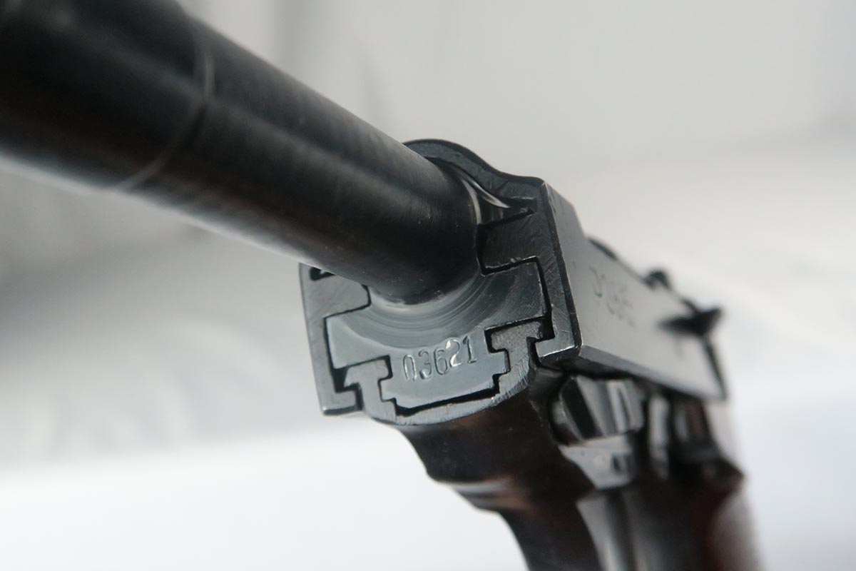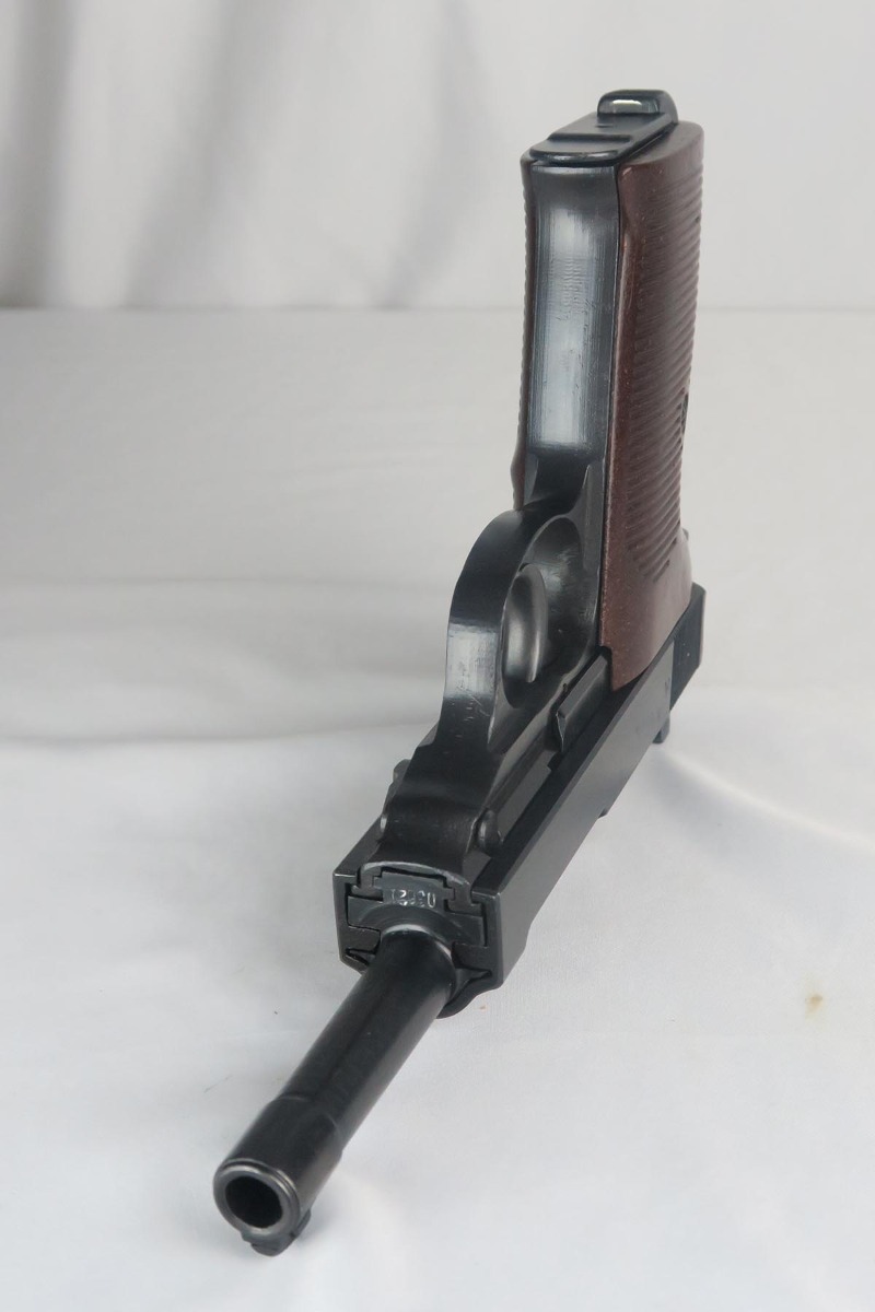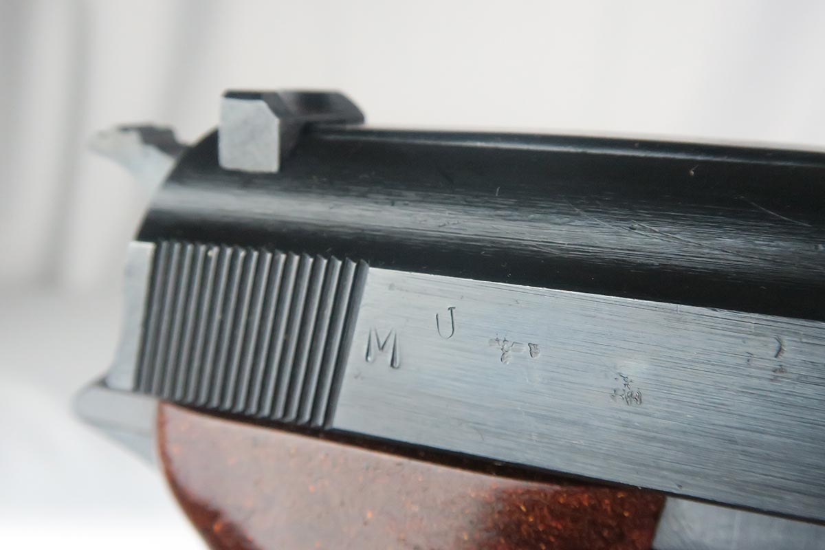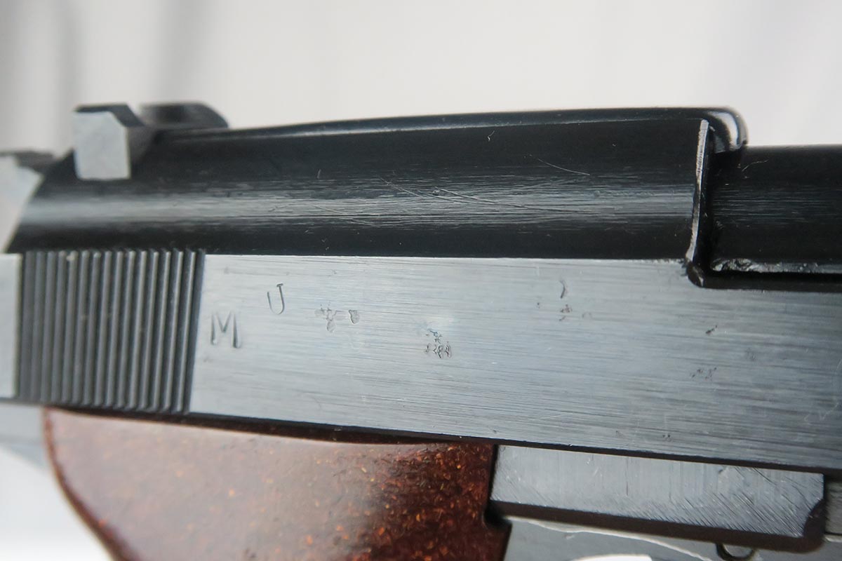 1/18/18 – This is a rare ‘zero series’ Spreewerke P.38 from the end of the war. This was one of the last P.38’s made for the war, with ‘0’ prefix to the serial number and late-war features such as the cog hammer. These pistols were put together from a mix of parts, with this one having an FN slide with ‘ac 44’ marking on left side and M proof on the right. The pistol is all matching with 99% bluing remaining. The bore is mint and so are the reddish grips. Small import mark beneath the tang is the only drawback.