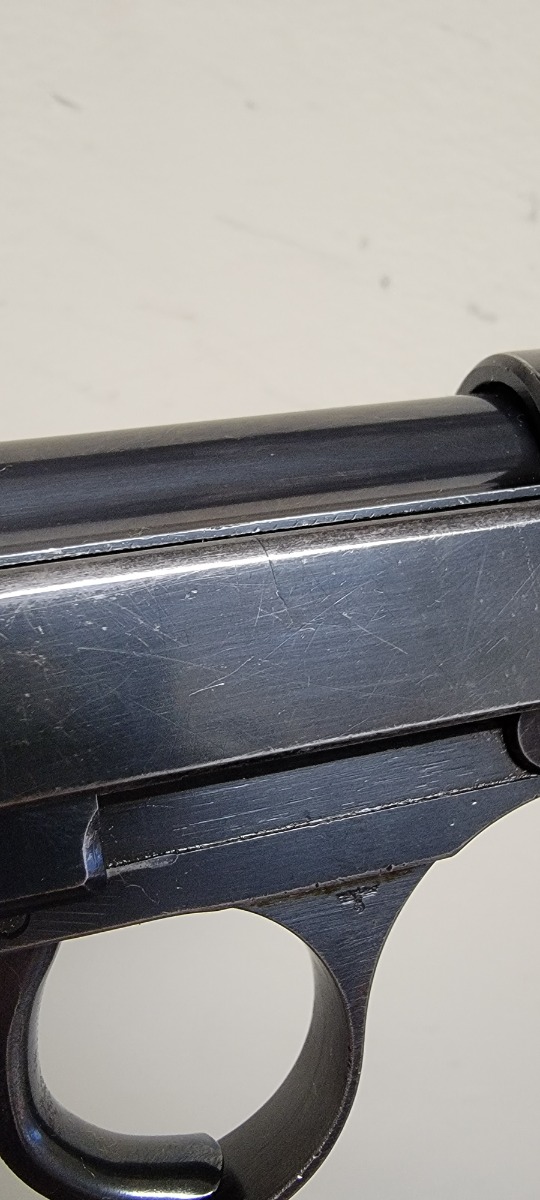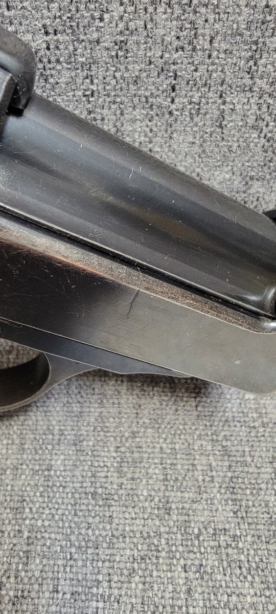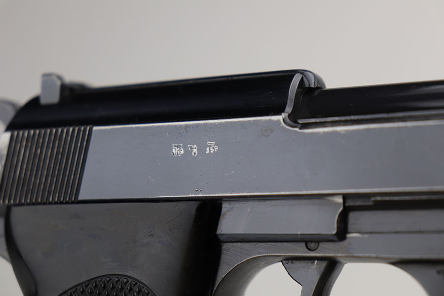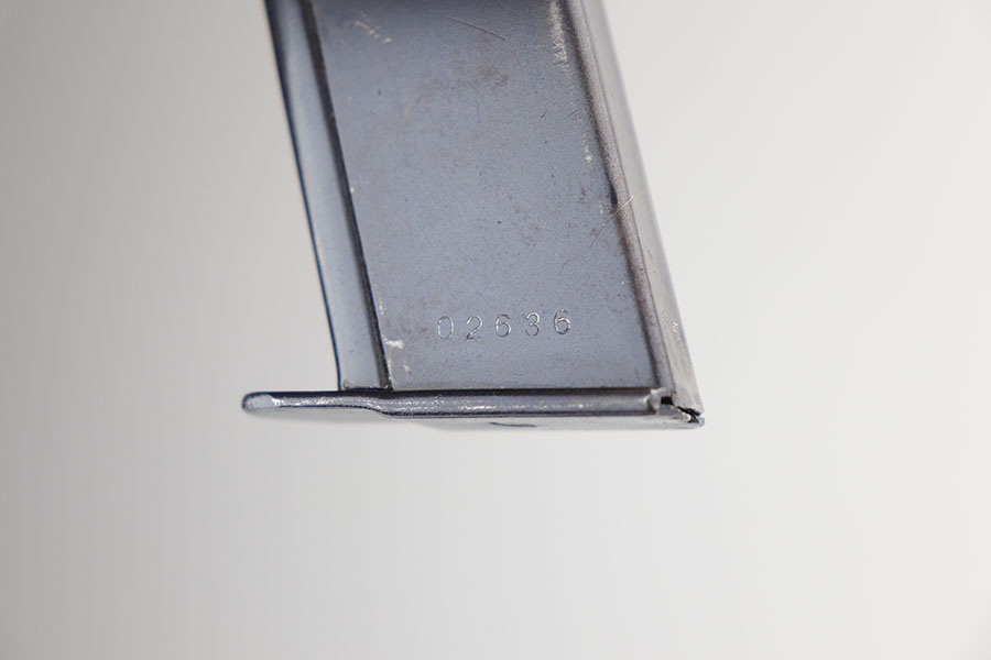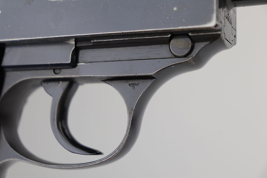 7/14/23 – This is rare and very desirable early Nazi Walther P.38 with its original matching magazine and grips. It’s a second variation zero series, one of only ~1,500 produced. The 2nd variation still had the rectangular firing pin but the slide was cut for the extractor. This particular example has an excellent profile with minor high edge thinning, but most of the bluing loss is on the front strap. Excellent bore and good mechanics. Both the grips and magazine are original and matching to the pistol. Grips show minor handling wear but no major defects. NOTE: THERE IS A HAIRLINE CRACK IN THE SLIDE. This would otherwise be a $6500-$7500 pistol.