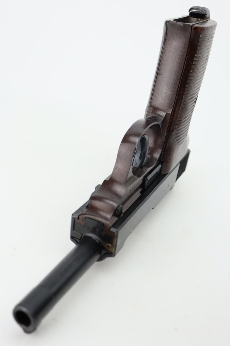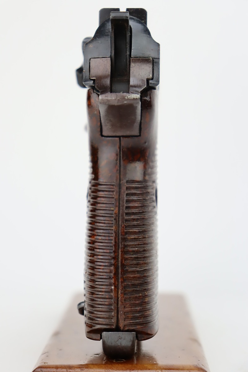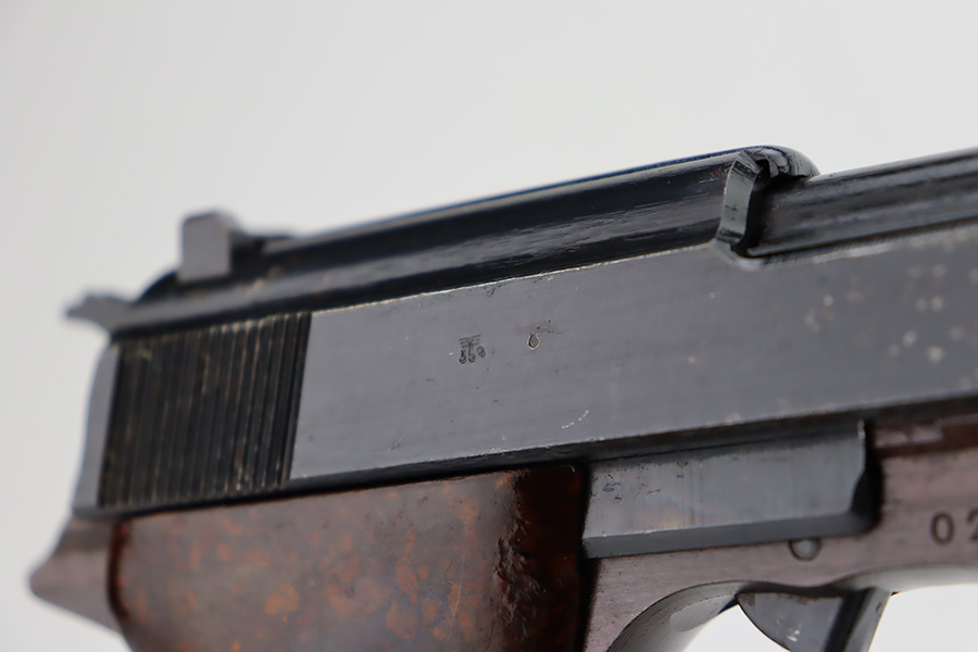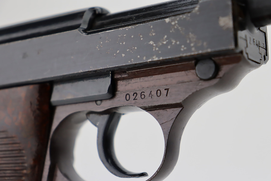 10/10/23 – This is an excellent example of a very rare “Zero Series” Walther P.38, manufactured in 1945. They are called a zero series because the serial numbers start with a zero. Only 1,750 of these were produced according to Whittington’s book. This one is all matching and has “Eagle 359” military acceptance proofs. It has retained about 94% of its late-war finish. The frame has a really nice plum color. The only notable sign of wear is spotty discoloration along the right side of the slide and barrel. Fitted with reddish bakelite grips and comes with an “Eagle 359” marked magazine. Mint bore. De-cocker is functional.