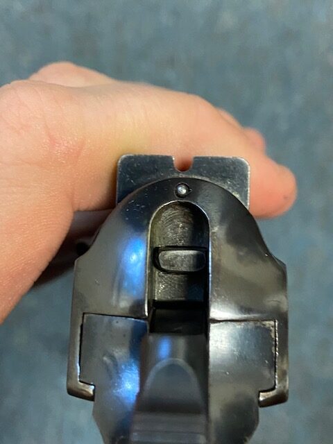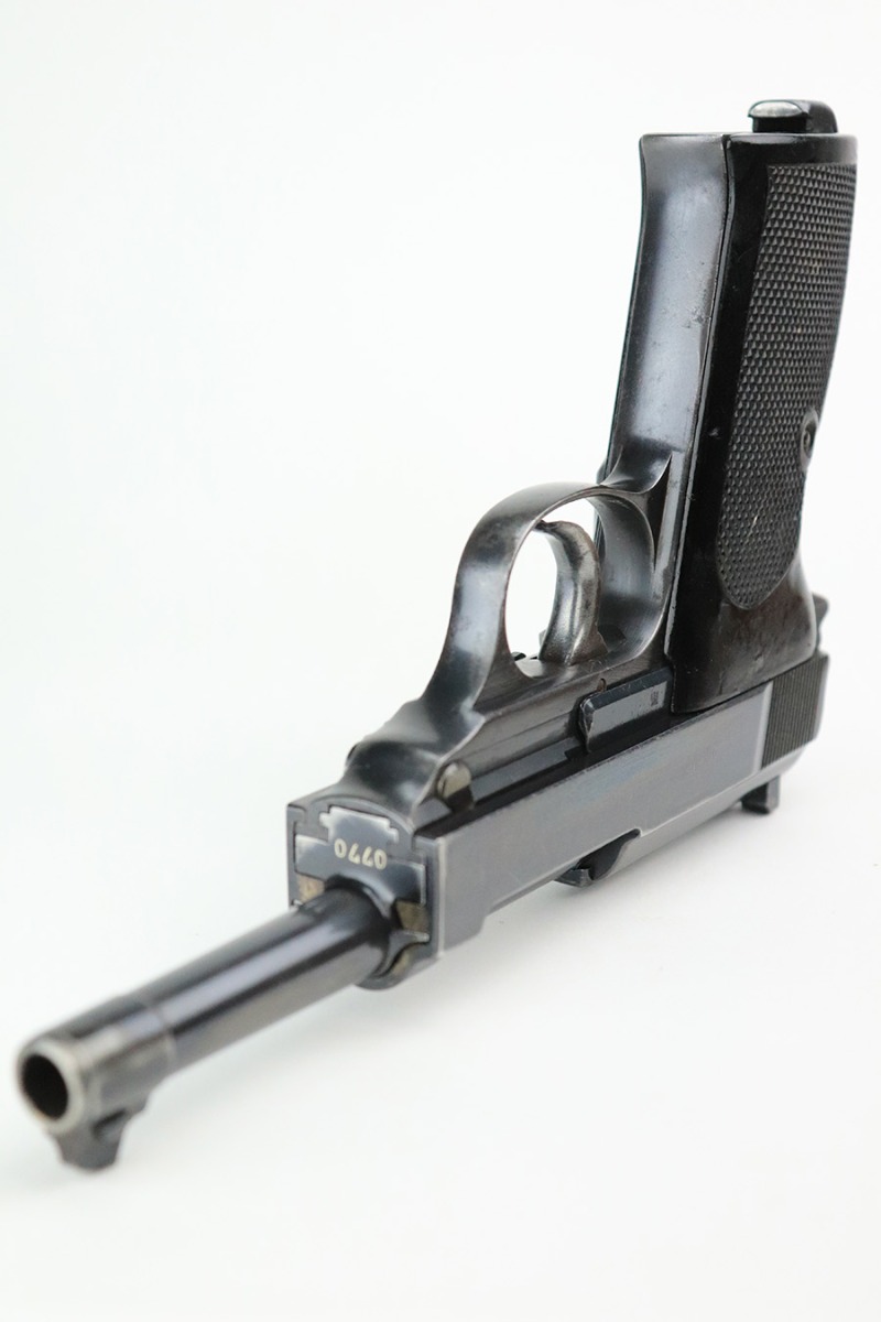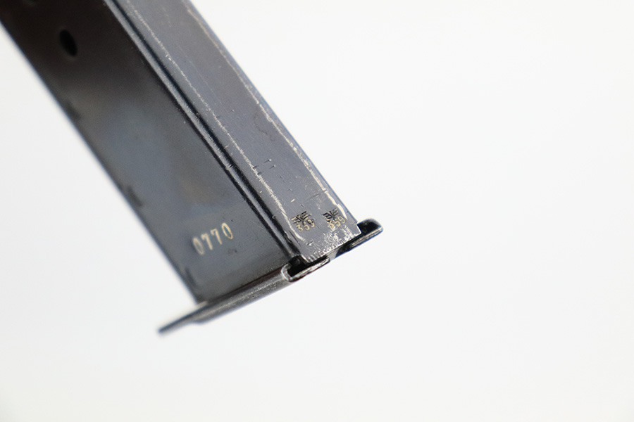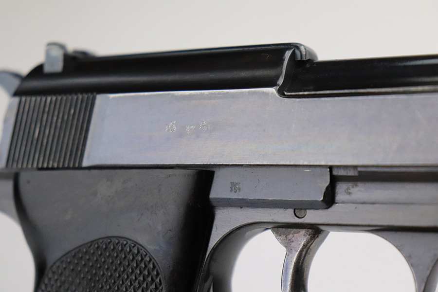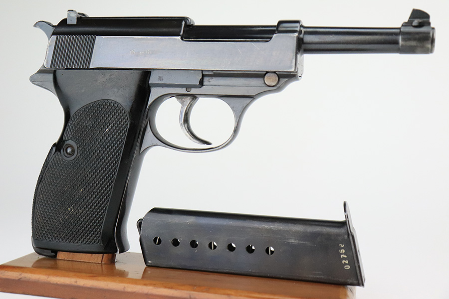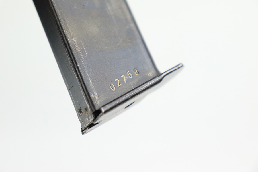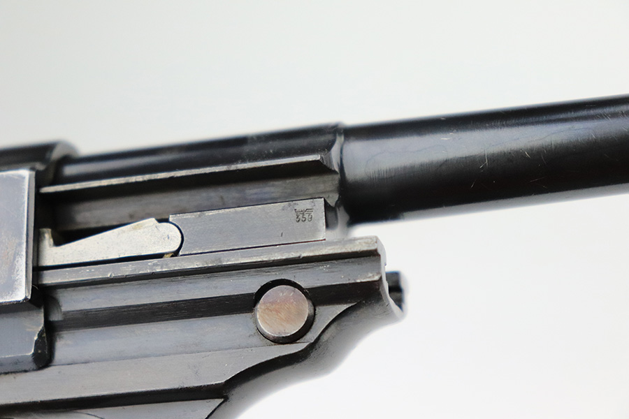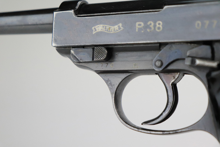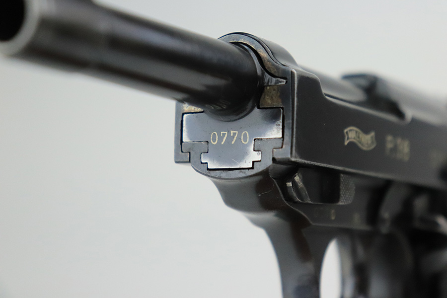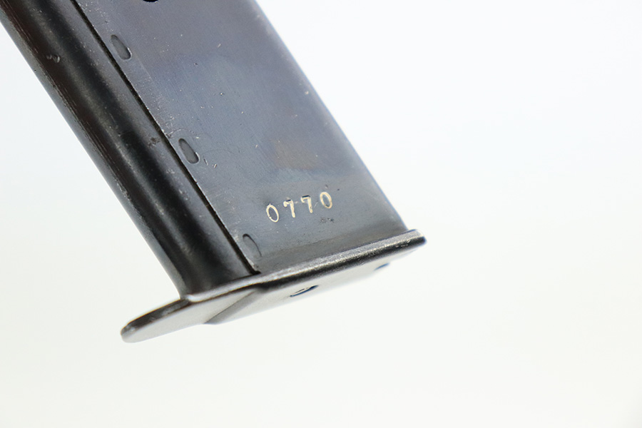 6/16/22 – This is a very rare Zero Series Walther P.38, first variation. One of only 1,000 produced, it features the hidden extractor and rectangular firing pin. This particular example has all matching numbers, including the original grips and magazine. Oddly, the magazine has another number/serial on the right side of the body, but we aren’t sure why. The numbering appears to be the correct font and the magazine is the correct variation with double E/359 proofs at the bottom of the spine, and even the internal parts are E/359 marked. The finish on the pistol was restored at some point, though is more evident on the frame with some pitting under the blue. The pistol is in good mechanical order with a functional de-cocker. The bore has good rifling but frost and pinpricking in the grooves.
