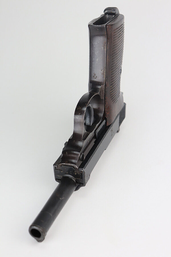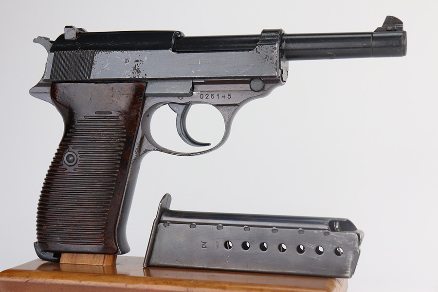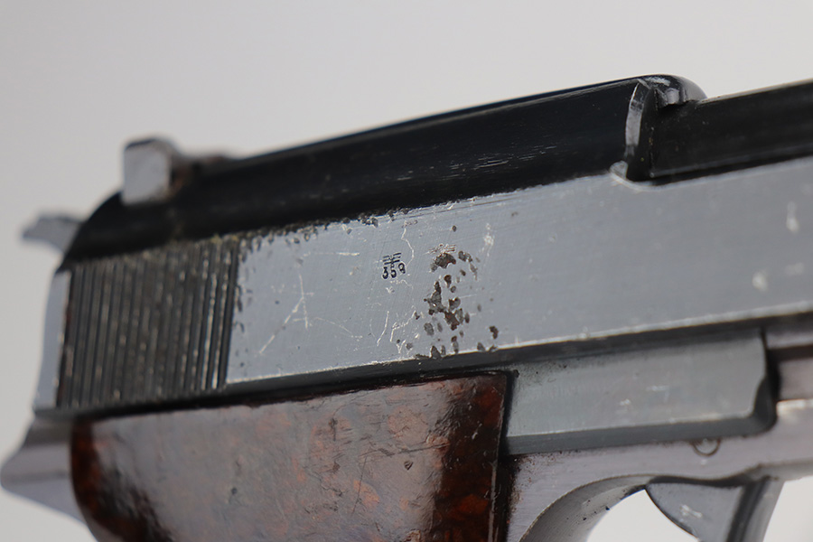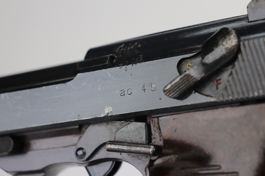 4/14/22 – This is an all matching and original example of a very rare Walther P.38 variation from 1945, one of only 1,800 produced. We’ve seen these referred to as zero series or zero-prefix Walther P.38s, but Krutzek’s P.38 book states this is the last Mod. HP variation. It features two inspection marks on the right side of the slide as it used ‘ac 45’ slides but serializing continued from where Mod. HP production ended. The zero was added to distinguish from the commercial production that preceded it. It has retained about 95% of its original finish. There is minor wear on the high edges of the slide and light scratching here and there. While there isn’t much actual finish loss, there are areas of significant pitting throughout. Comes with nice grips and a period-correct jvd magazine. Overall, the bore is shiny with strong rifling, but there is a very small area of pitting near the muzzle. De-cocker is functional.