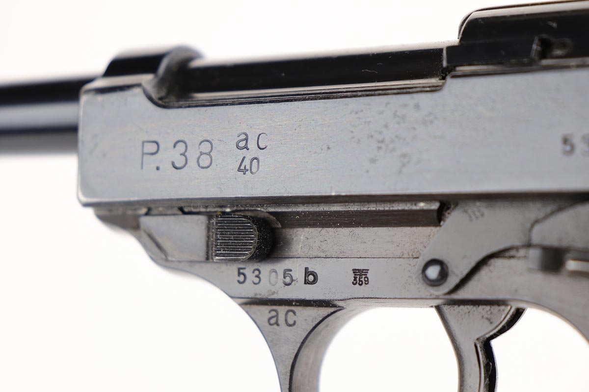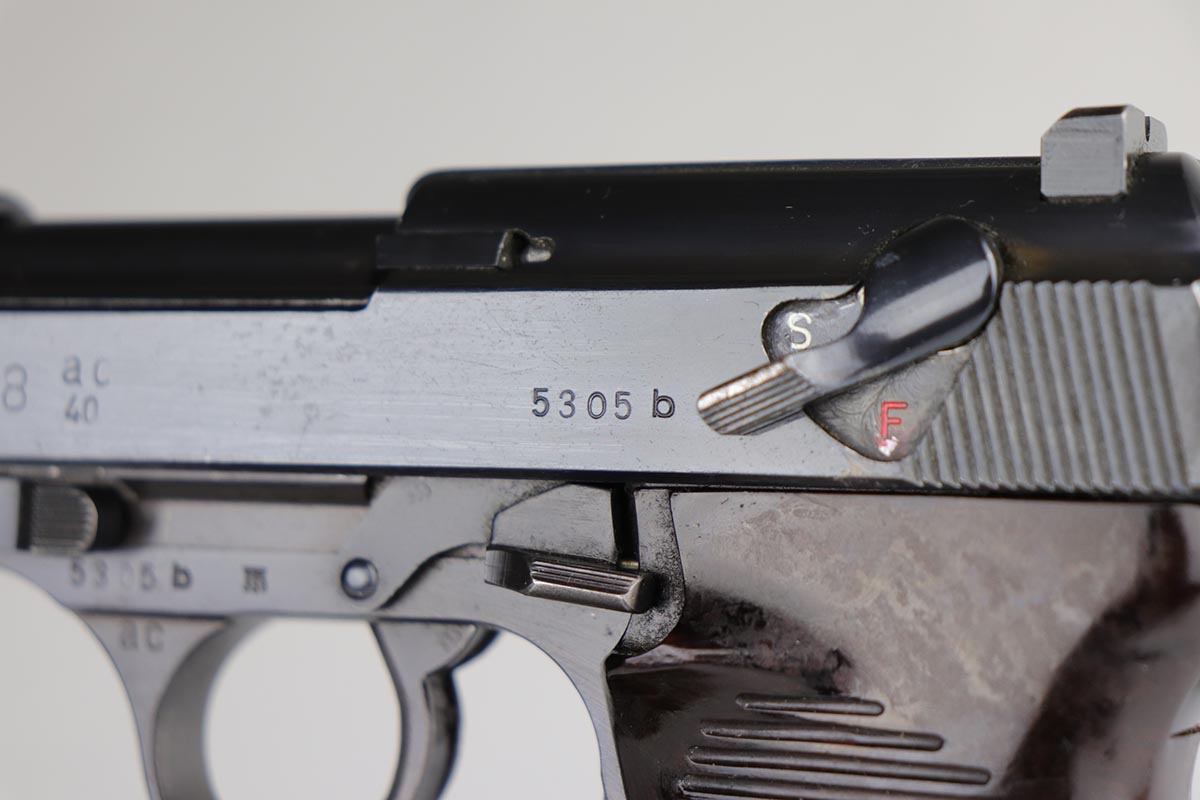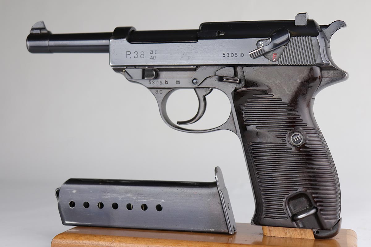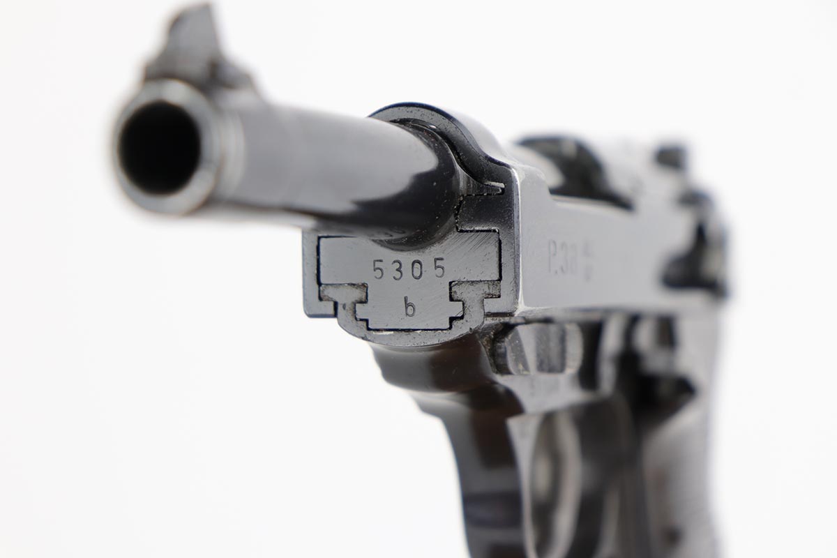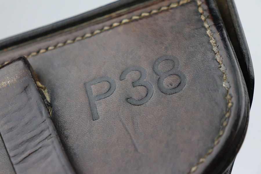 2/9/21 – This is a very nice example of an all matching and original Walther P.38 from 1940. Made in November of 1940, this is one of only 12,000 produced with ‘ac 40’ marked slide. The original bluing rates at about 97+%, as there is only minor edge thinning on the front strap, muzzle and front edges of the slide. There is some oxidation on the barrel and both sides of the slide, though. The grips are numbered and matching to the pistol. De-cocker works but is a little bit stiff. Excellent grips. It comes with an excellent 1941-dated holster and two numbered but mismatched Walther magazines.