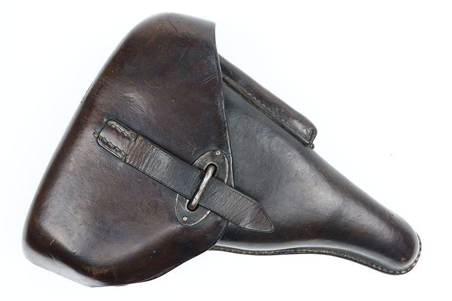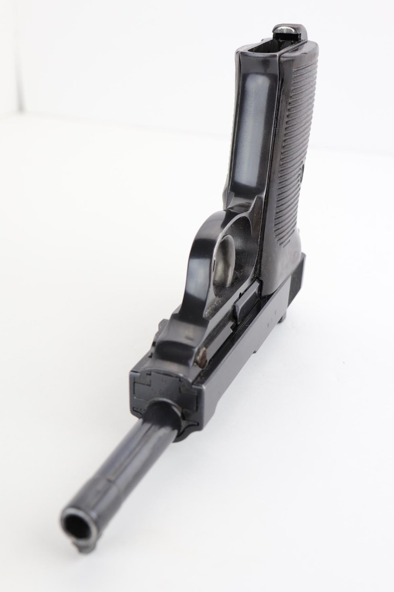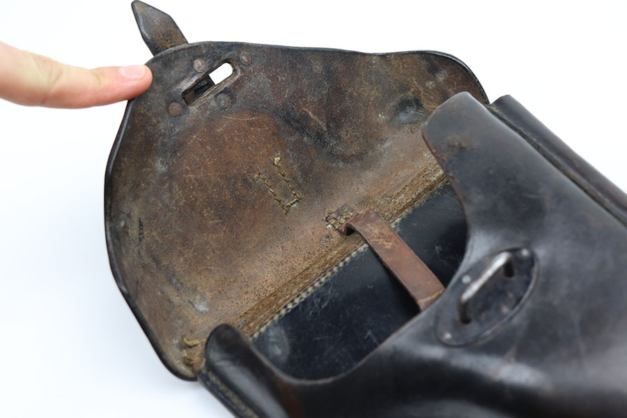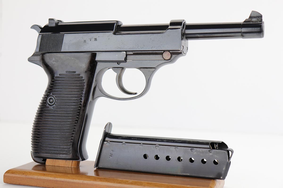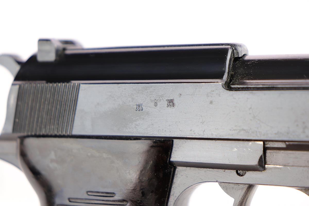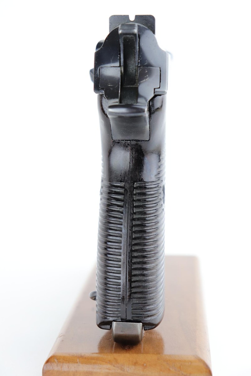 2/9/21 – This is a very nice example of an all matching and original Walther P.38 from 1940. Made in November of 1940, this is one of only 12,000 produced with ‘ac 40’ marked slide. The original bluing rates at about 97+%, as there is only minor edge thinning on the front strap, muzzle and front edges of the slide. There is some oxidation on the barrel and both sides of the slide, though. The grips are numbered and matching to the pistol. De-cocker works but is a little bit stiff. Excellent grips. It comes with an excellent 1941-dated holster and two numbered but mismatched Walther magazines.