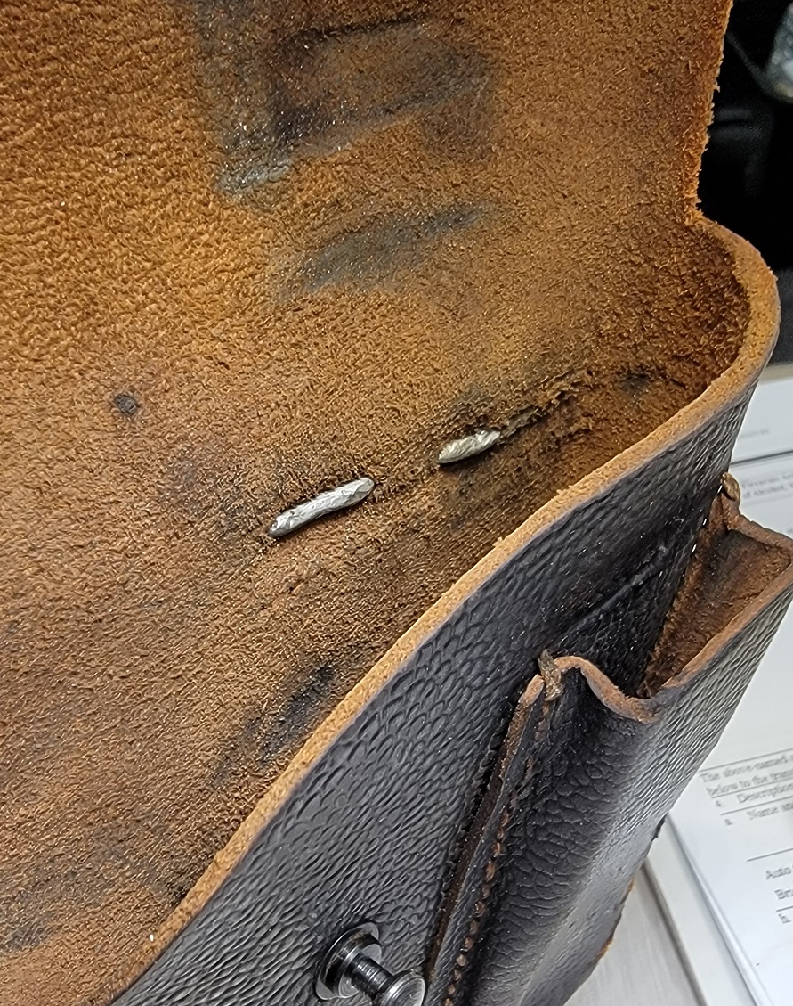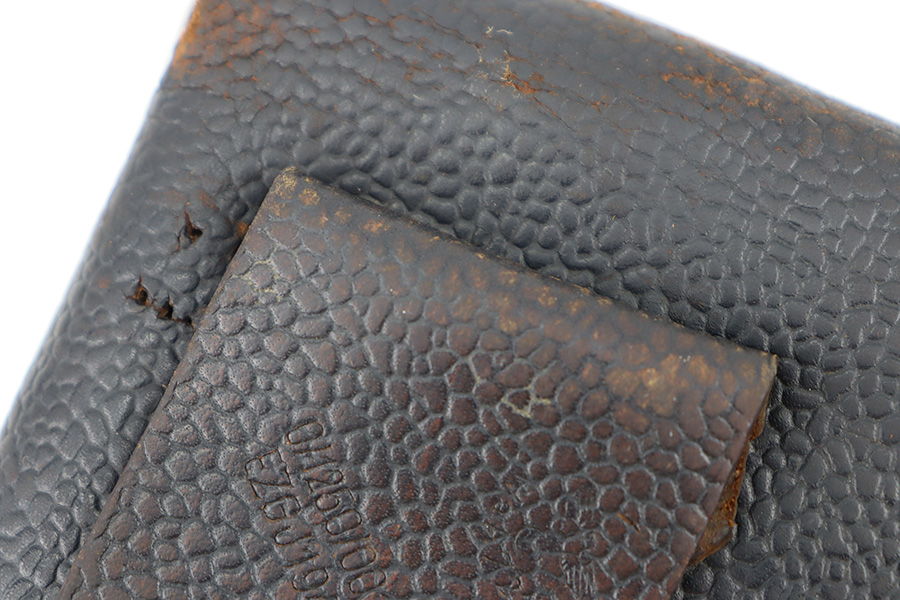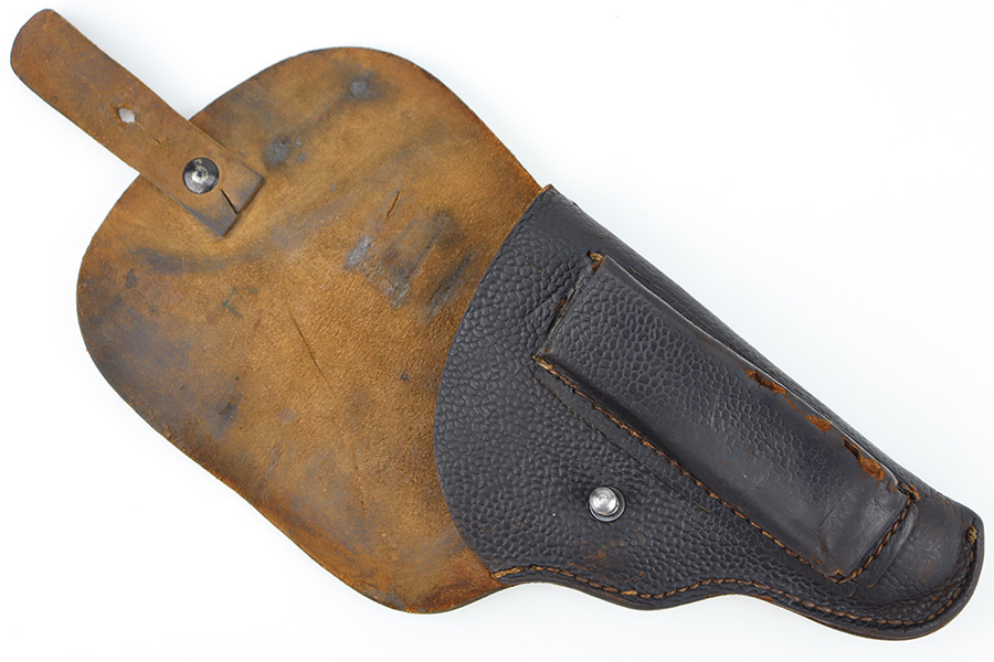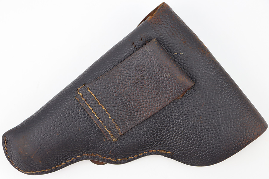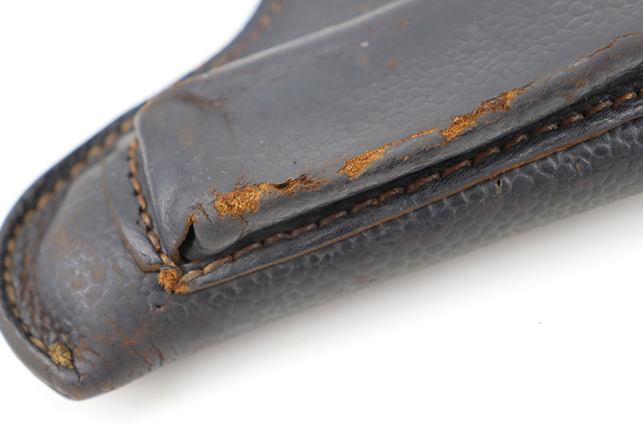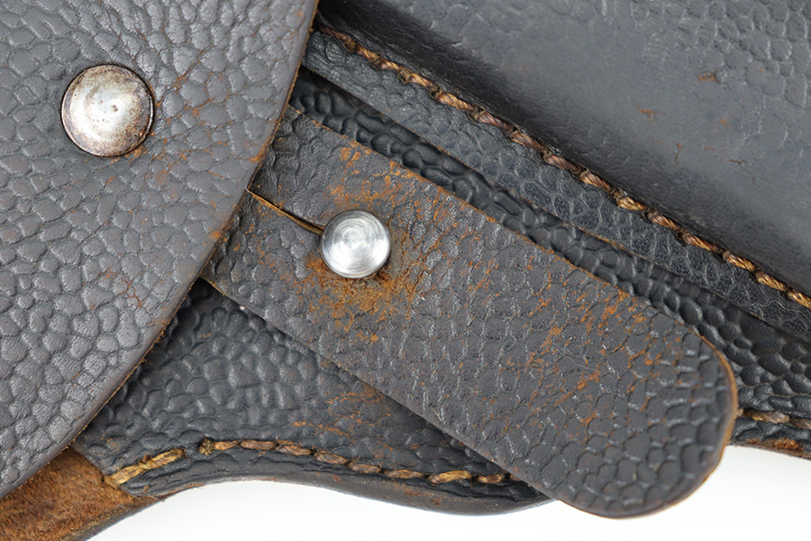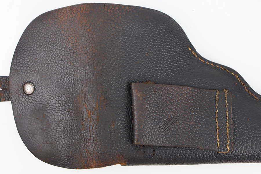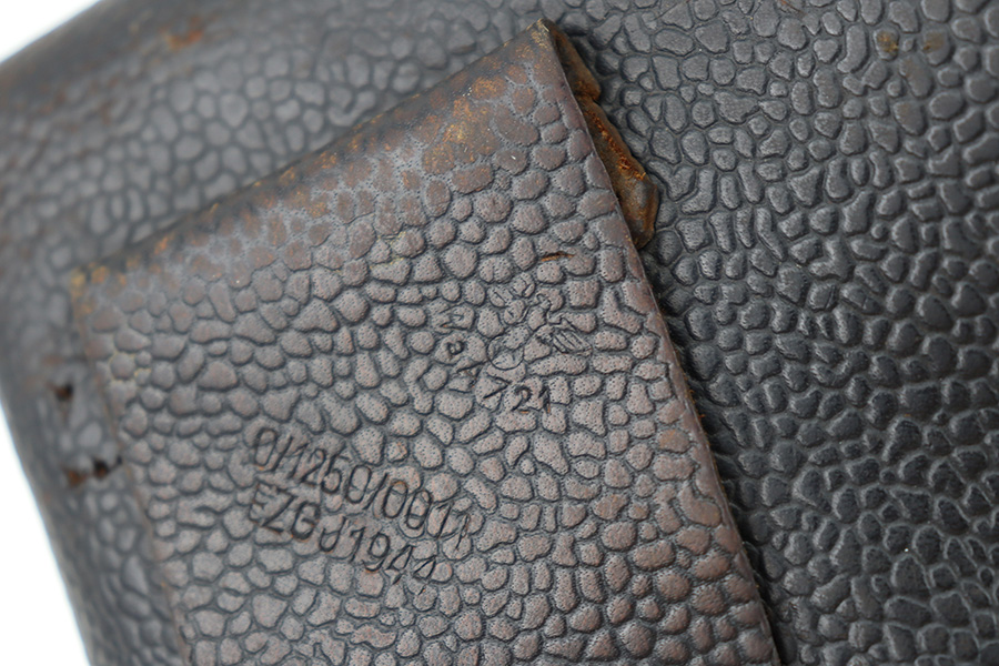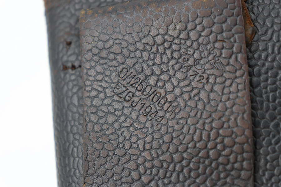12/27/23 – This is an original late WW2 production CZ-27 holster. The holster is in good condition with soft, pliable leather that shows use and age throughout. The magazine pouch has some scuffs along the edges, and a small hole near the bottom corner. The interior leather shows typical signs of previous use. The back belt loop is stamped with a RBNr. distribution code, along with a maker and date “EZGJ 1944”. There’s also a waffen military eagle proof stamp on the belt loop. The top of the belt loop is repaired with a metal (aluminum) bar, as shown in photos. This is likely a field repair. The rest of the stitching is original and intact.
