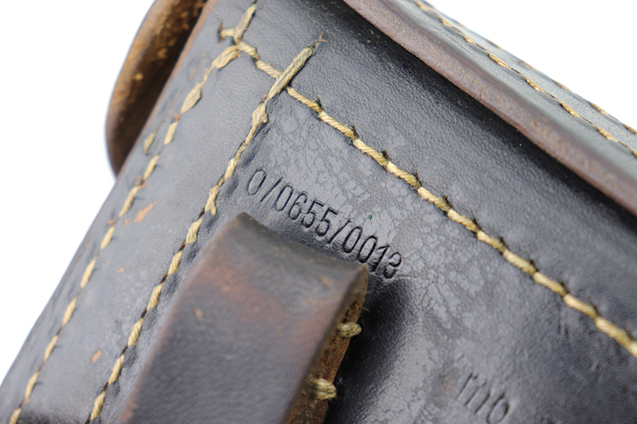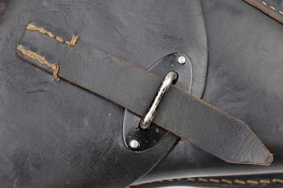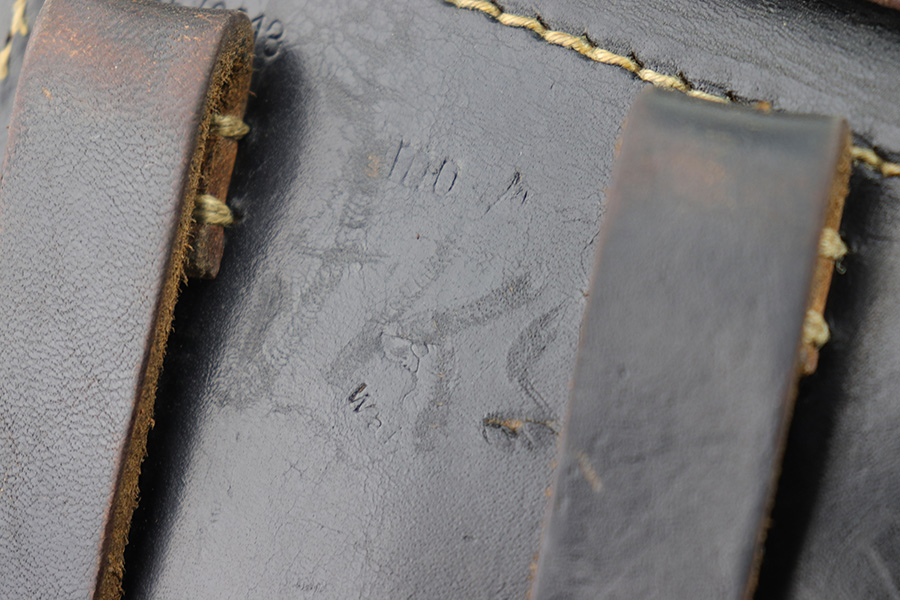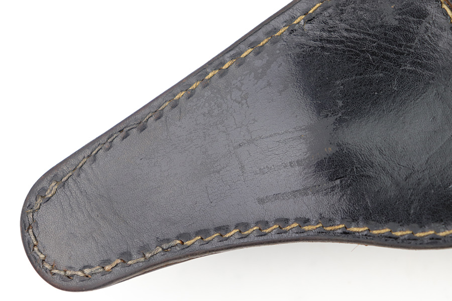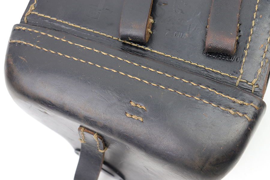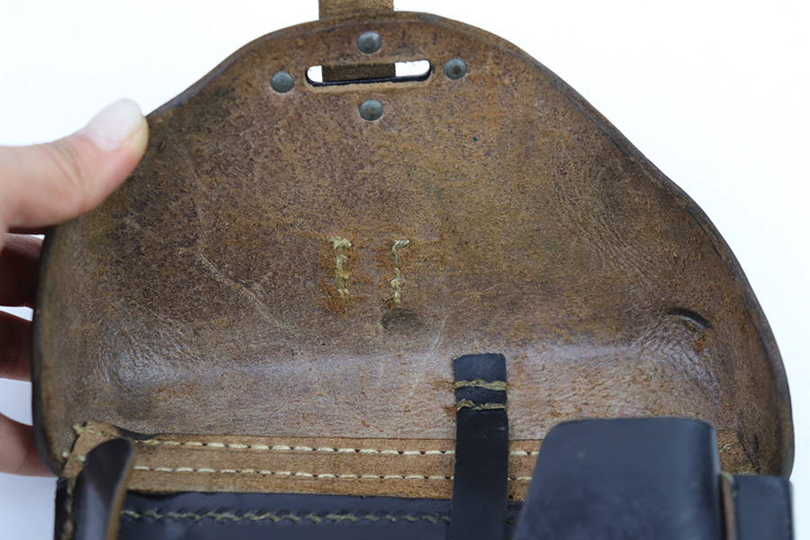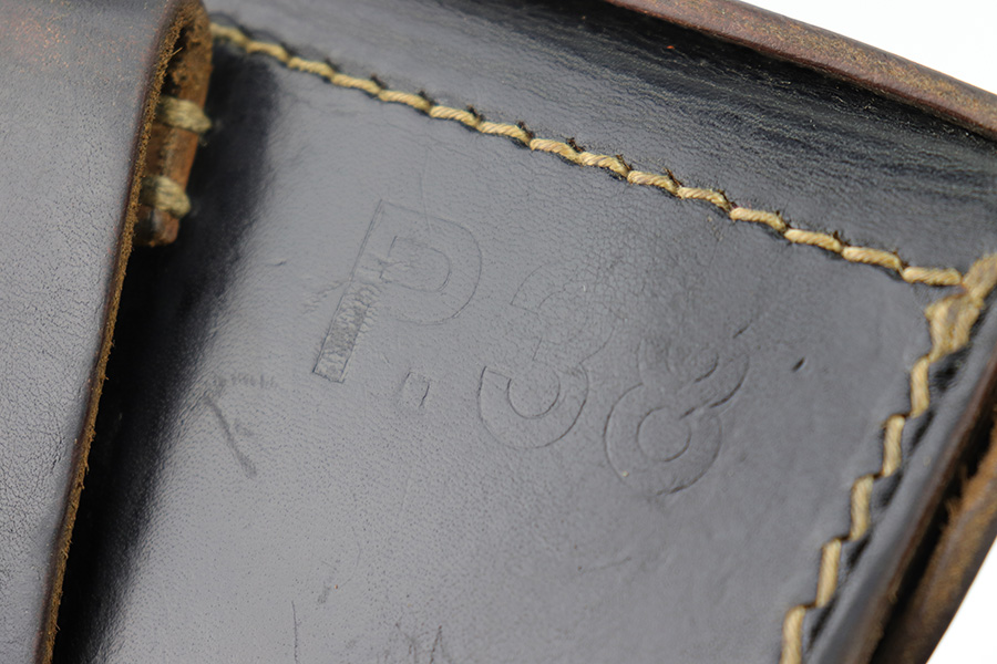 3/10/23 – This is a rare and desirable variation 1944 dated hard shell style P.38 holster. Very few hard shell style holsters were made in 1944, as the Germans switched to soft shell in 1943. The ’44 hardshells in existence today are mostly made from scrap leather, but this example has very nice original black leather that’s in great condition. The leather has normal pliability and is in great shape with a clean interior. The back leather is stamped with a maker code and date “4”, waffen military proof, P.38 stamp, and a RBNr. which was a later-wartime designation stamp for distribution channels throughout the German military. The stitching is all original and in great condition.