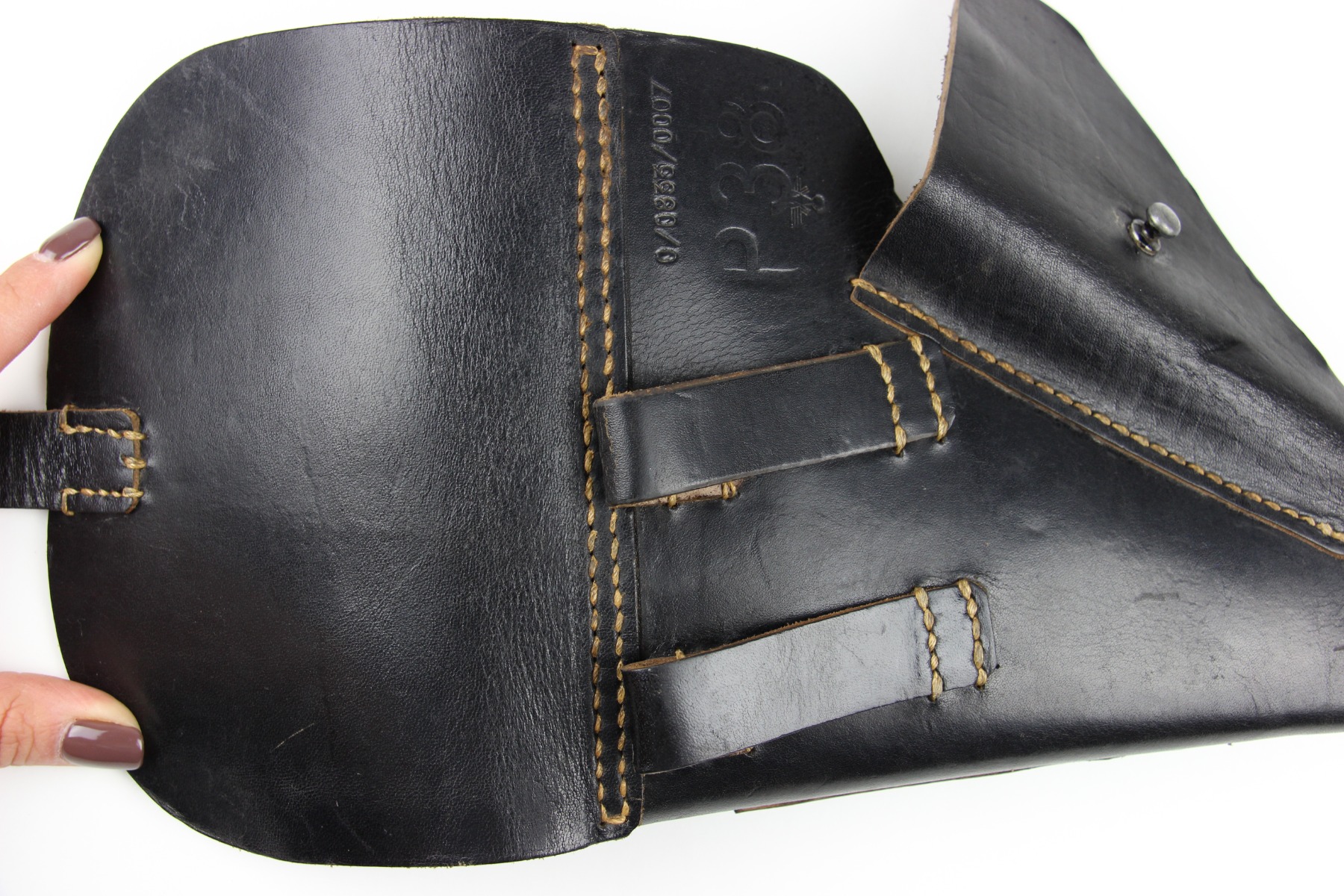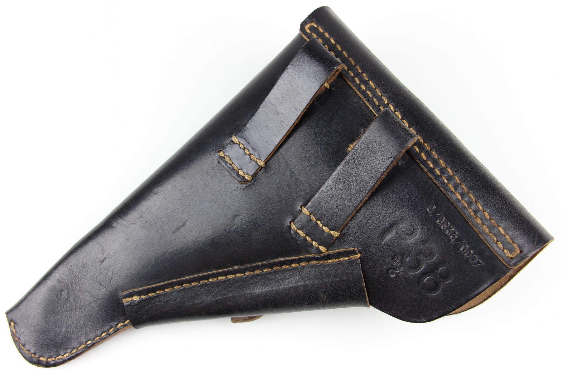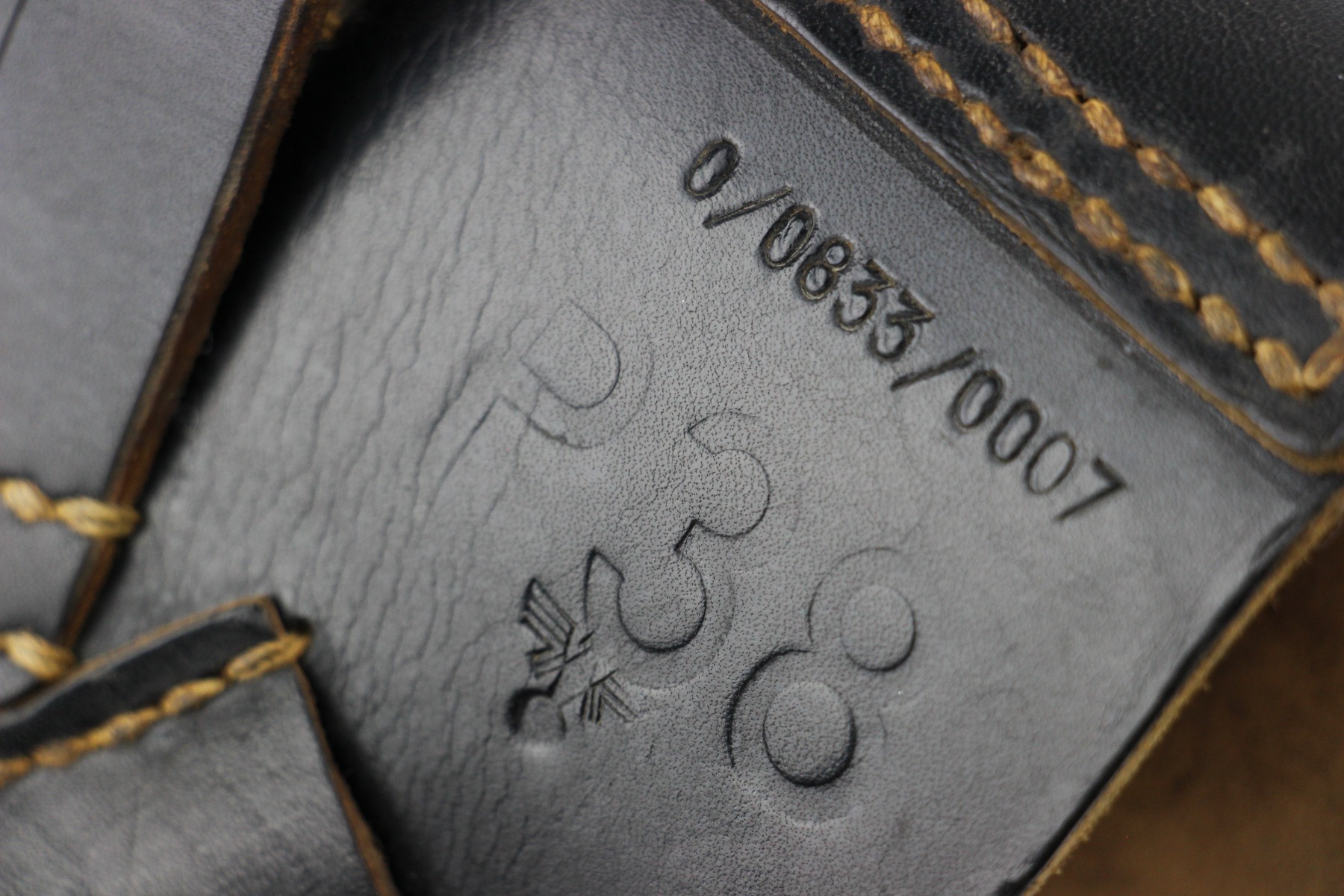 3/1/24 – This is an original, later WW2 variation Police P.38 holster. The holster is in excellent, unissued condition with strong, clean leather and all original stitching intact. The back leather is P.38 designation stamped with a RBNr. distributor number and a Police Eagle proof stamp. All original and authentic.