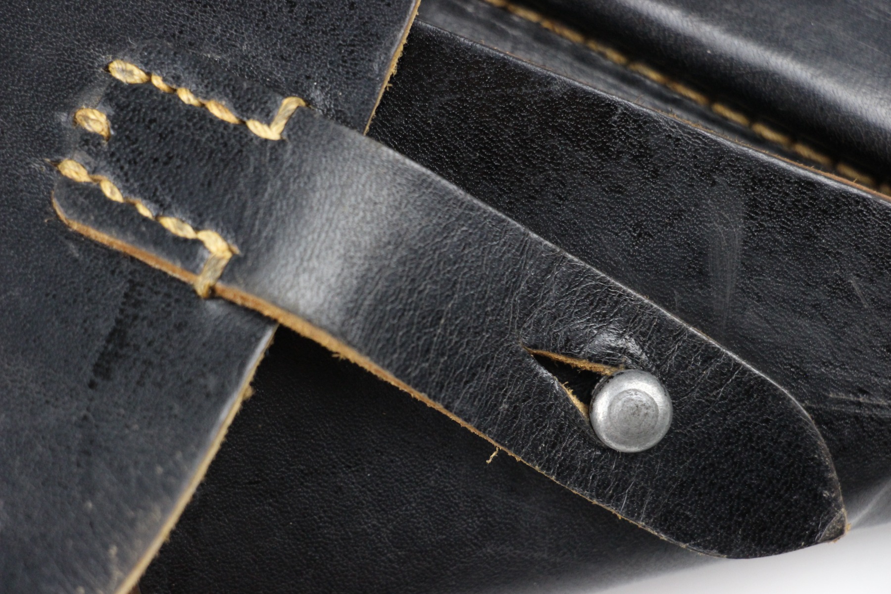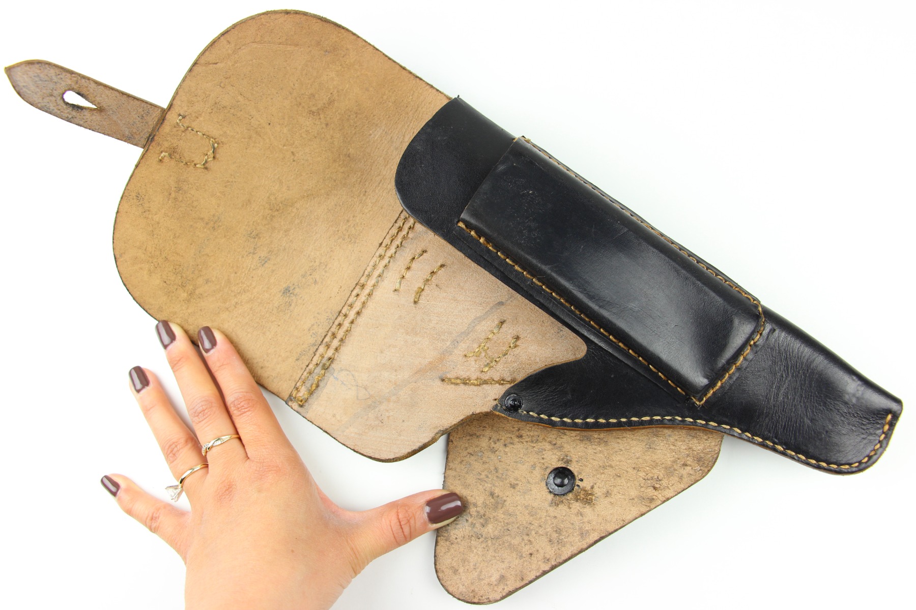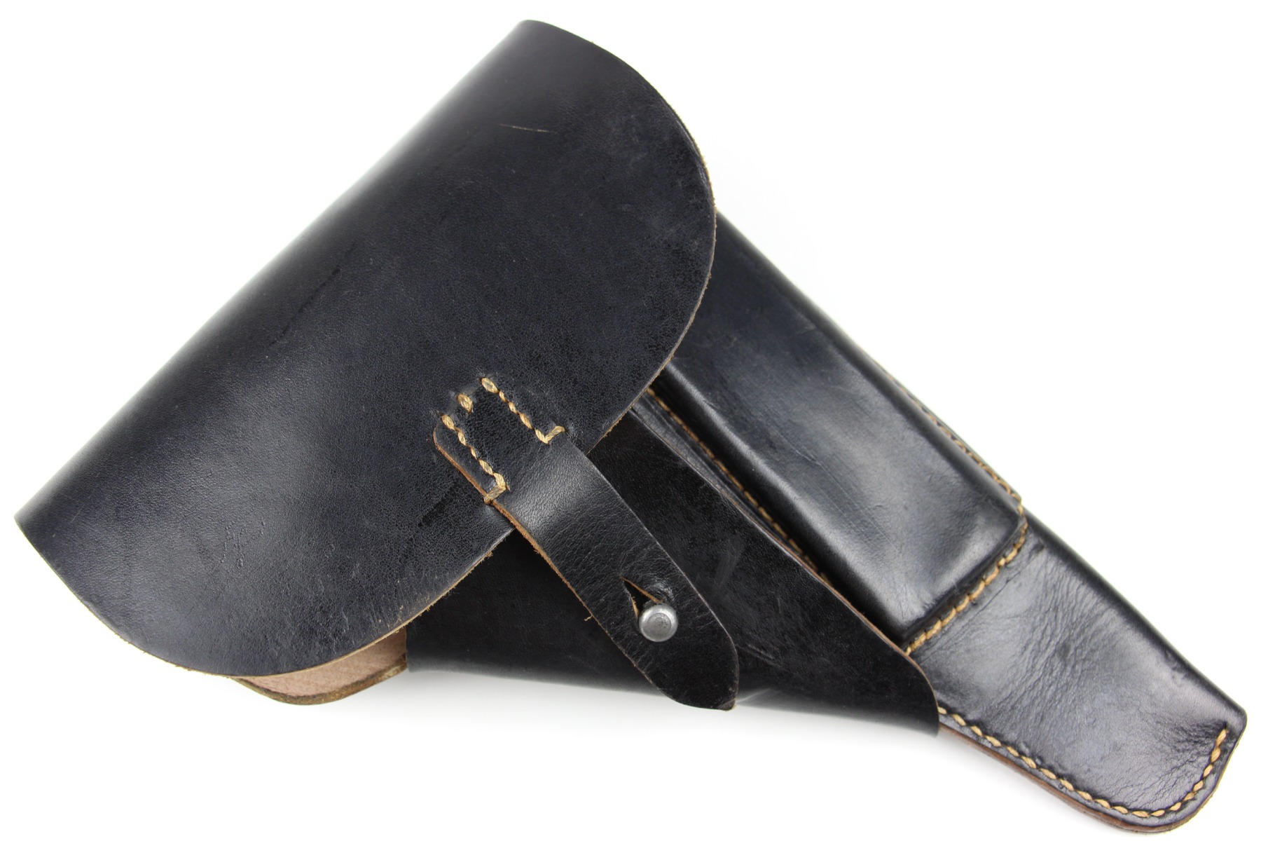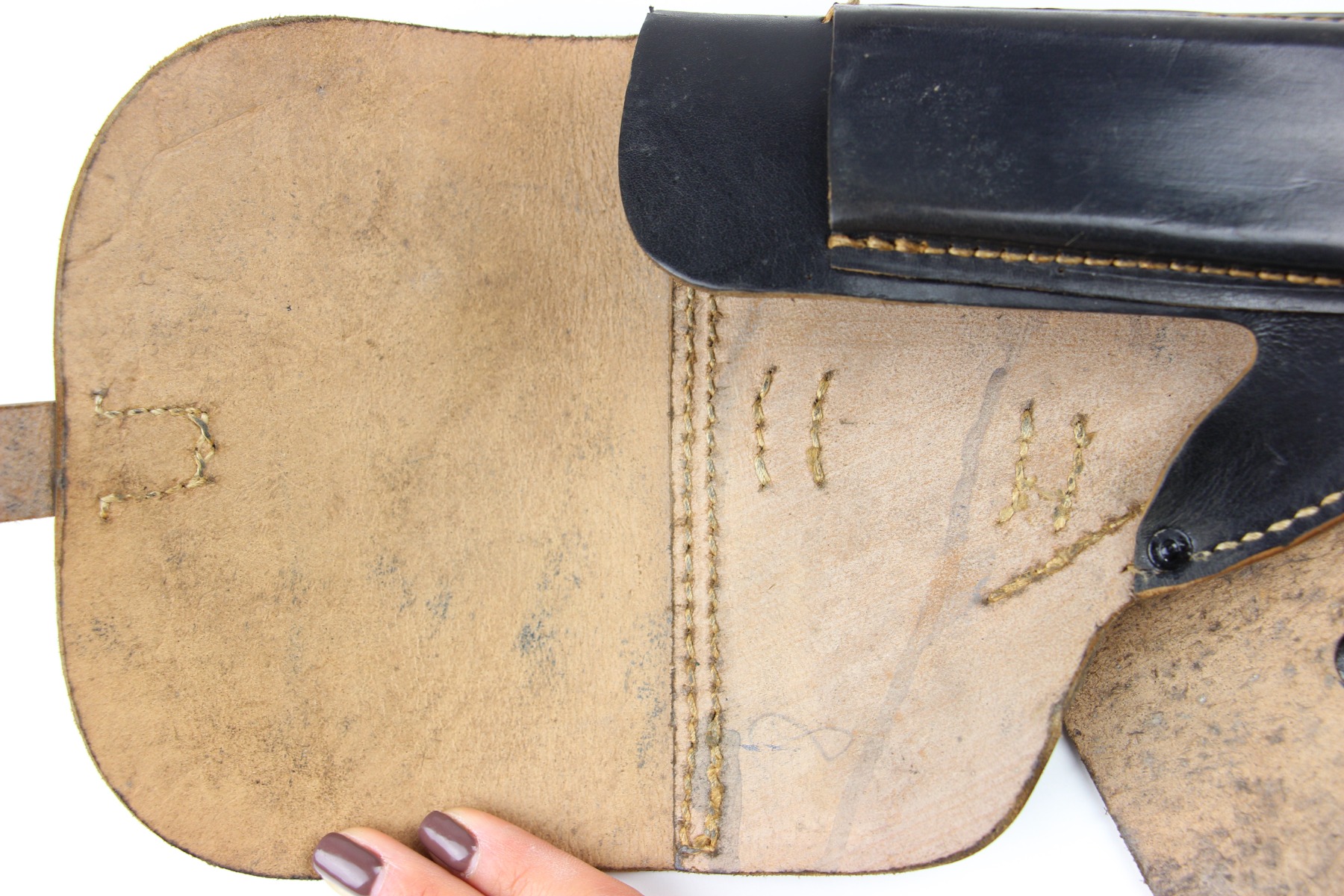 3/1/24 – This is an original, later WW2 variation Police P.38 holster. The holster is in excellent, unissued condition with strong, clean leather and all original stitching intact. The back leather is P.38 designation stamped with a RBNr. distributor number and a Police Eagle proof stamp. All original and authentic.