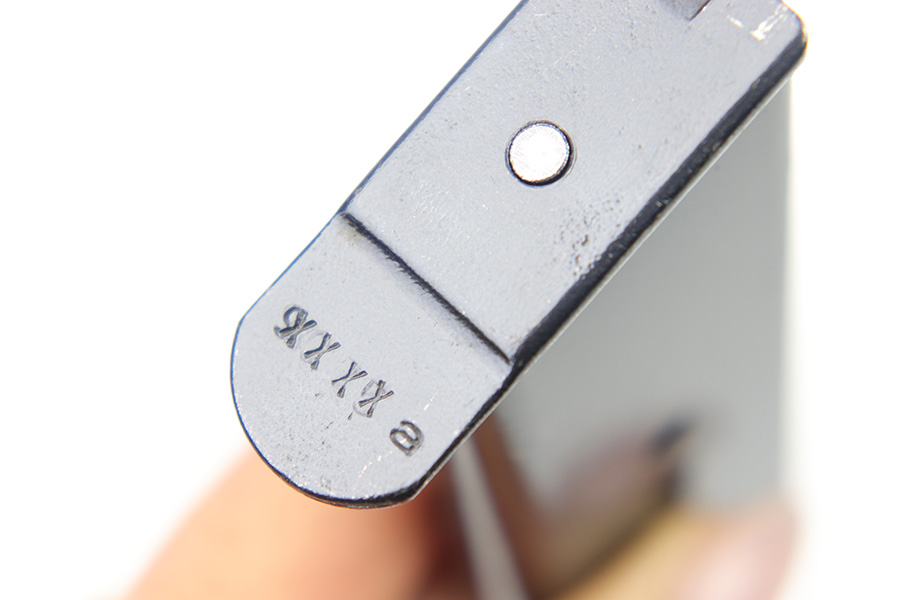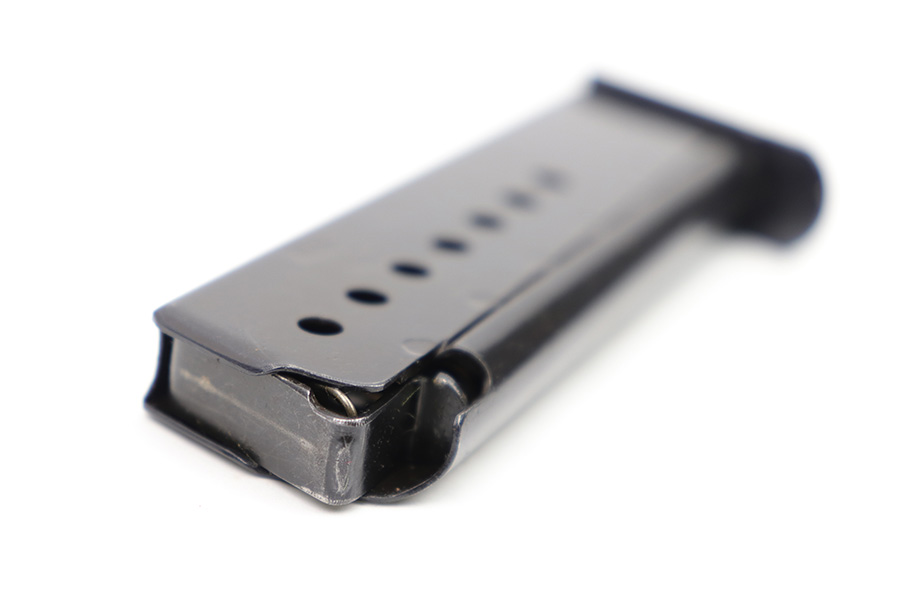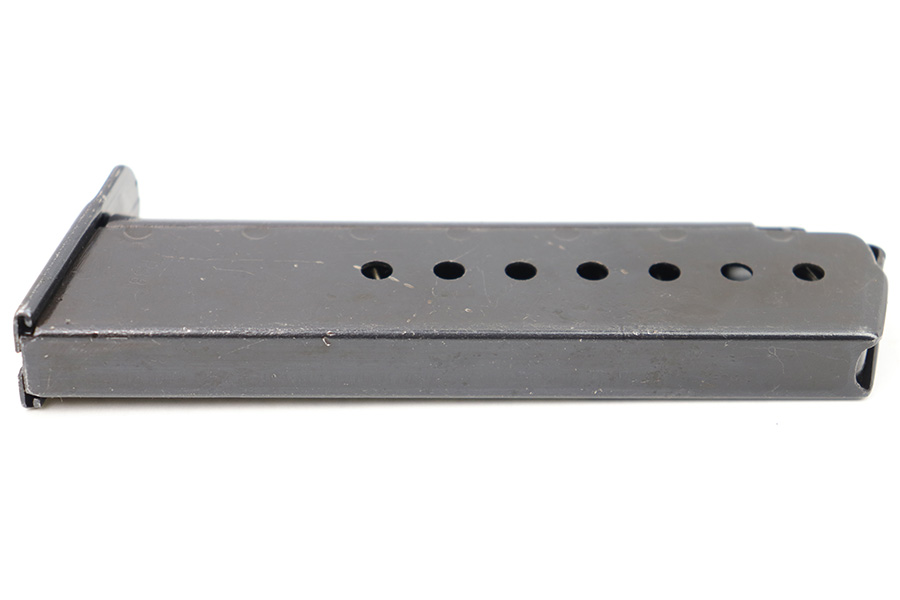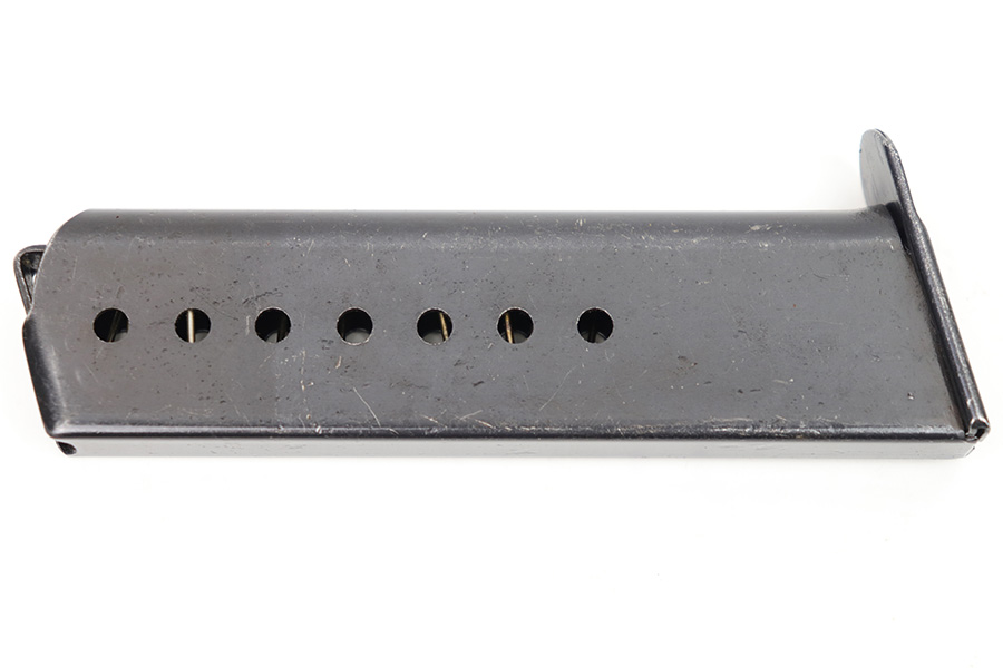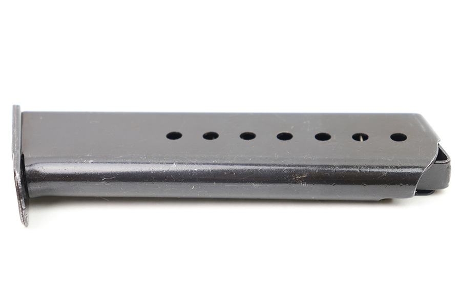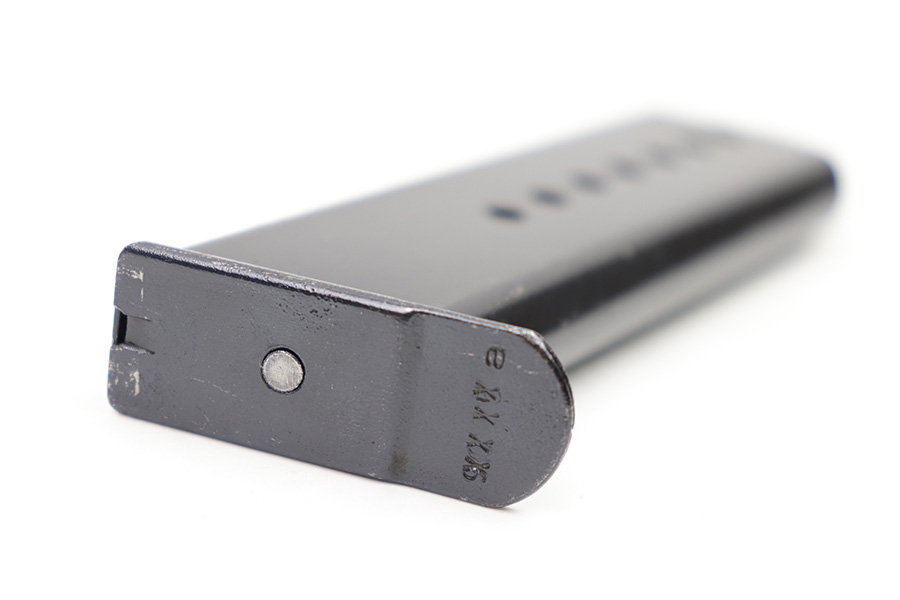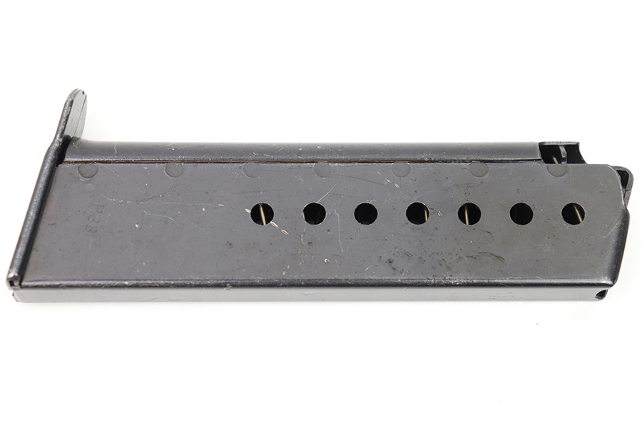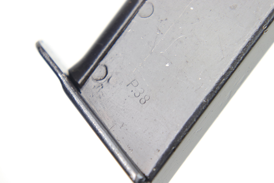 1/26/23 – This is an original WW2 Walther P.38 magazine that we suspect was re-issued and arsenal refinished at some point (likely for police use). The magazine features a serial numbered base, but the serial number is X’d out. The tube of the magazine is P.38 stamped and proof stamped on the spine with an eagle 359 proof. The finish is dark throughout the magazine and base, and we believe this is refinished. The spring is strong and fully functional.