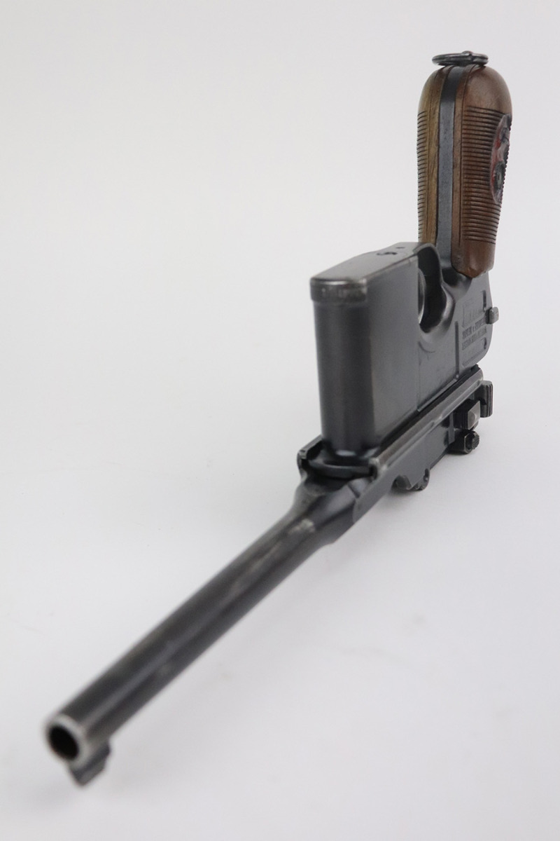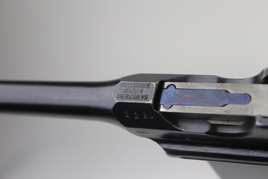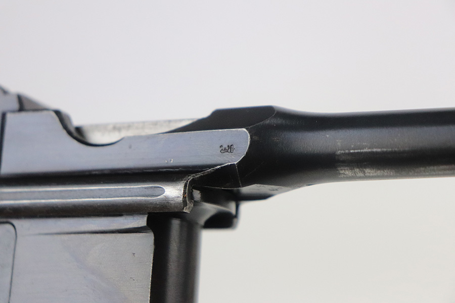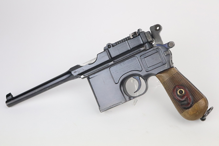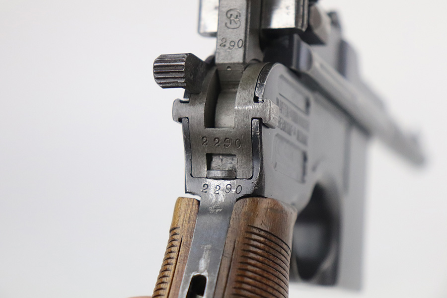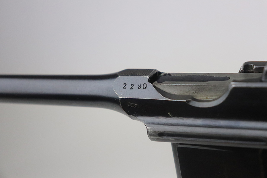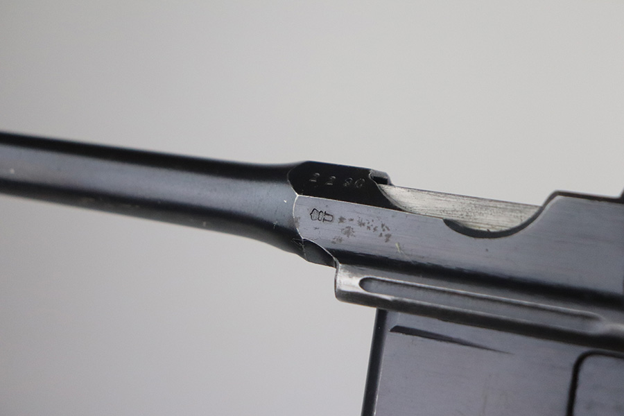 7/9/21 – This is a nice example of an original “Red 9” Mauser C96 Broomhandle rig with matching stock. Unlike its commercial counterparts, “Red 9” Broomhandles were chambered in the more common 9mm Para caliber, which was used by the German Army and were marked with a large 9 on the grips which was then filled with red or orange paint to help German soldiers differentiate its caliber from the standard .30 mauser cartridge. Only about 130,000 of these very collectible guns were made, with only about 100,000 being accepted by the army and issued to the troops. Considered to be a substitute for a light carbine, they became very popular in trench warfare and were used by some of the Germany’s elite crack troops. This is one of the first 2,300 produced, and the earliest example we’ve offered. All matching and original with most of the bluing loss on the underside of the barrel, which is common as they rub against the inside of the stock. The grips were likely the field replacement variation based off the design of the ‘Red 9’ but they aren’t numbered to the pistol. The stock is matching numbered to the gun but the lid was replaced at some point and is missing a small screw. Bore is shiny with strong rifling but a little frost in the grooves. Stock has clear imperial proof, and pistol also has Prussian eagle on trigger guard.