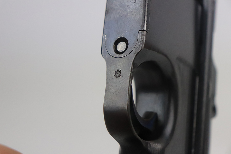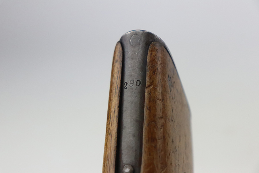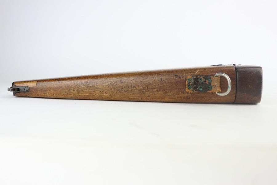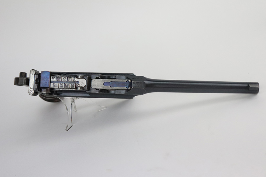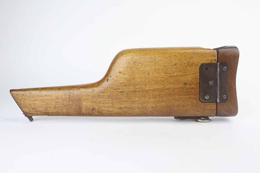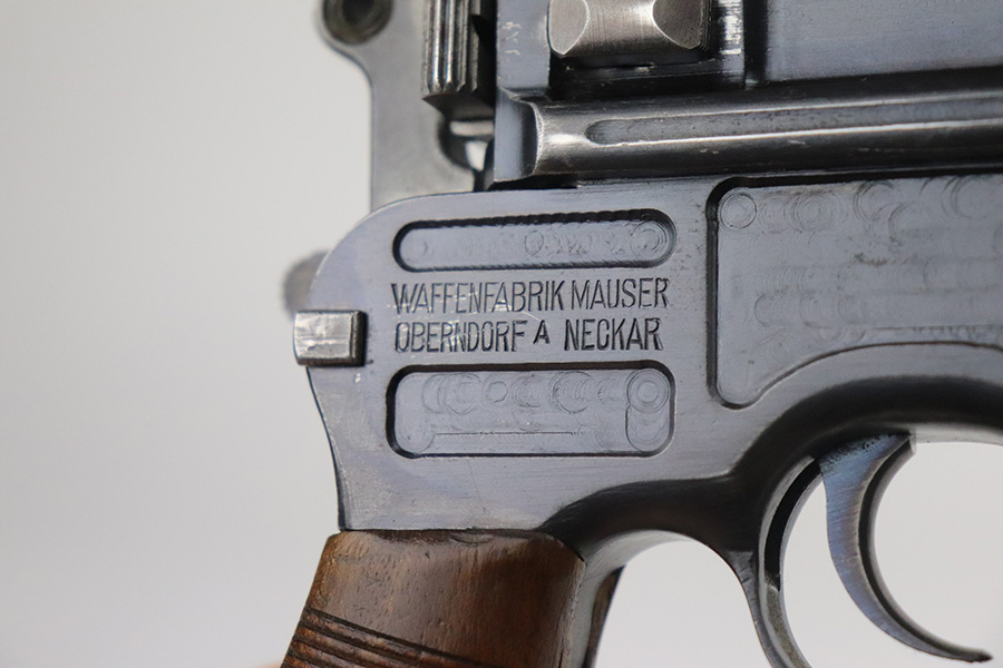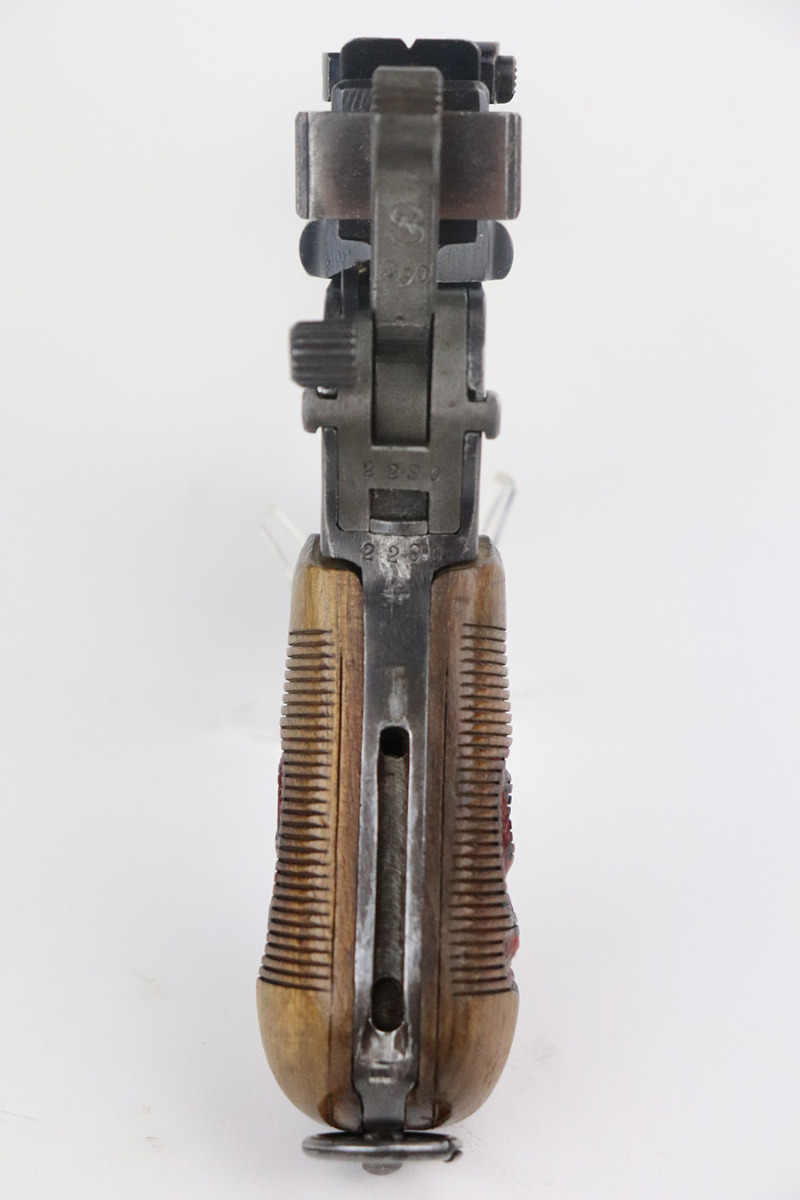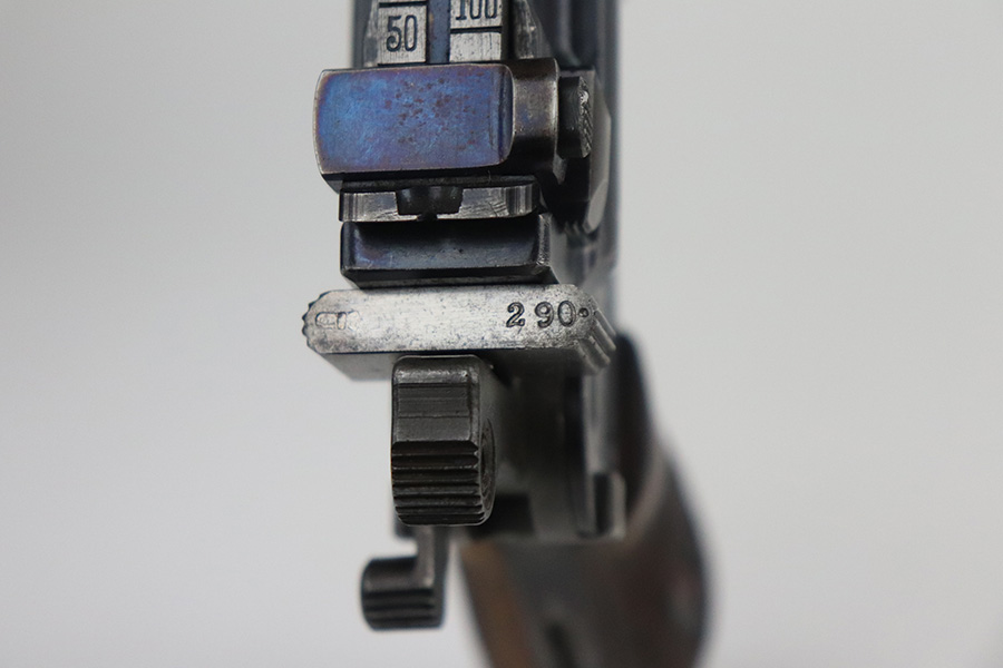 7/9/21 – This is a nice example of an original “Red 9” Mauser C96 Broomhandle rig with matching stock. Unlike its commercial counterparts, “Red 9” Broomhandles were chambered in the more common 9mm Para caliber, which was used by the German Army and were marked with a large 9 on the grips which was then filled with red or orange paint to help German soldiers differentiate its caliber from the standard .30 mauser cartridge. Only about 130,000 of these very collectible guns were made, with only about 100,000 being accepted by the army and issued to the troops. Considered to be a substitute for a light carbine, they became very popular in trench warfare and were used by some of the Germany’s elite crack troops. This is one of the first 2,300 produced, and the earliest example we’ve offered. All matching and original with most of the bluing loss on the underside of the barrel, which is common as they rub against the inside of the stock. The grips were likely the field replacement variation based off the design of the ‘Red 9’ but they aren’t numbered to the pistol. The stock is matching numbered to the gun but the lid was replaced at some point and is missing a small screw. Bore is shiny with strong rifling but a little frost in the grooves. Stock has clear imperial proof, and pistol also has Prussian eagle on trigger guard.