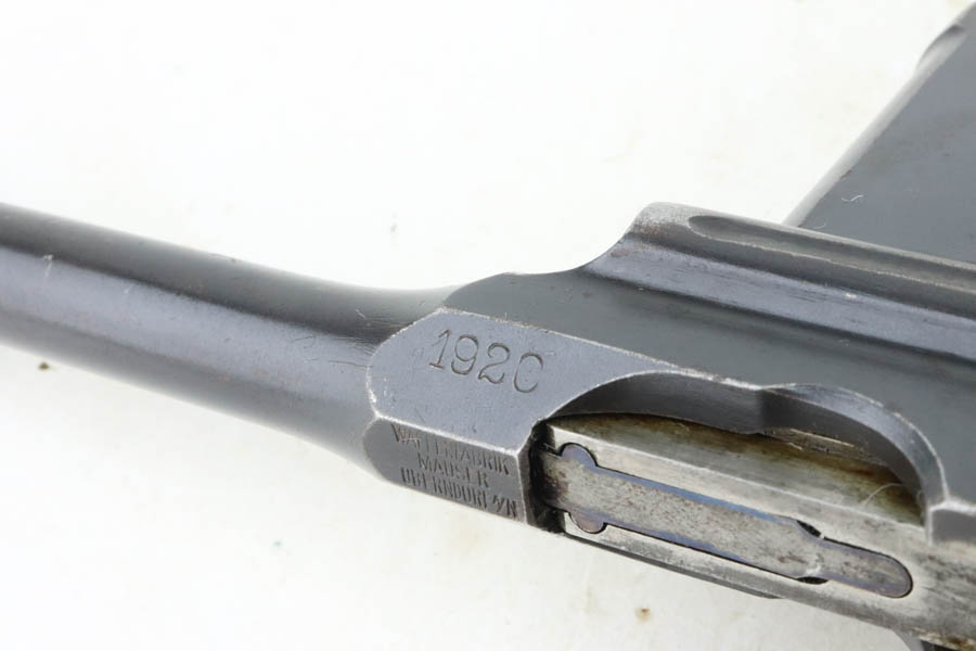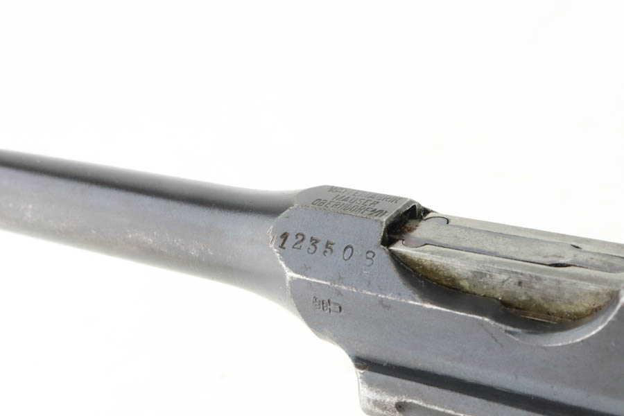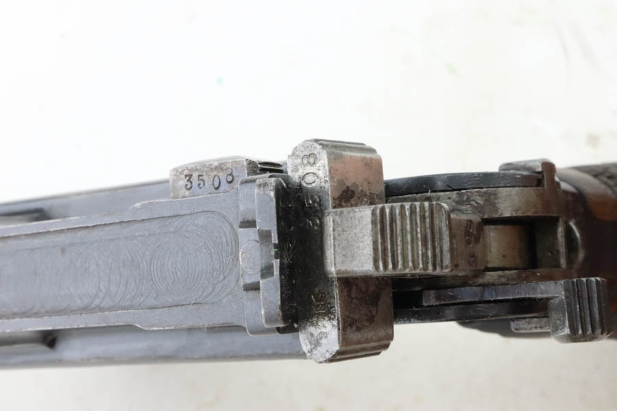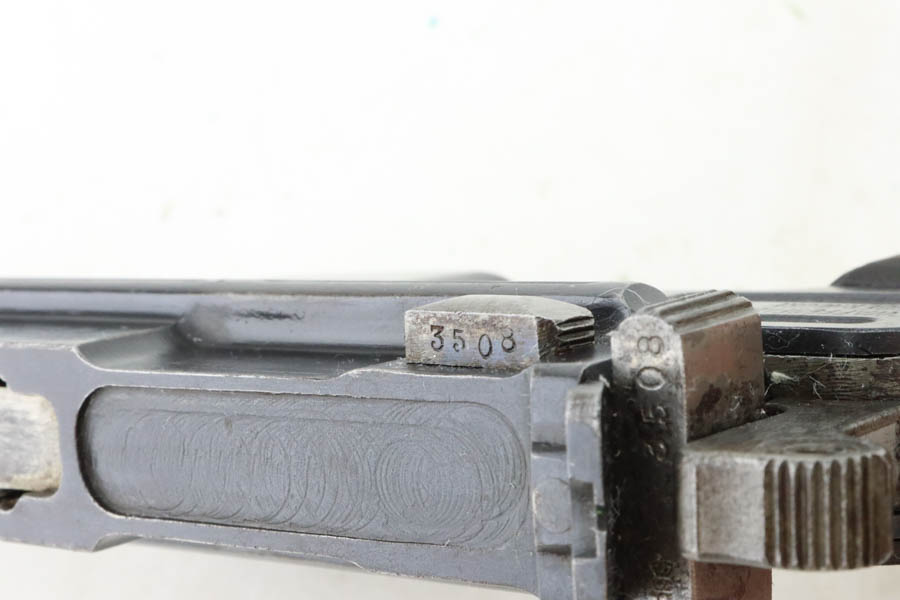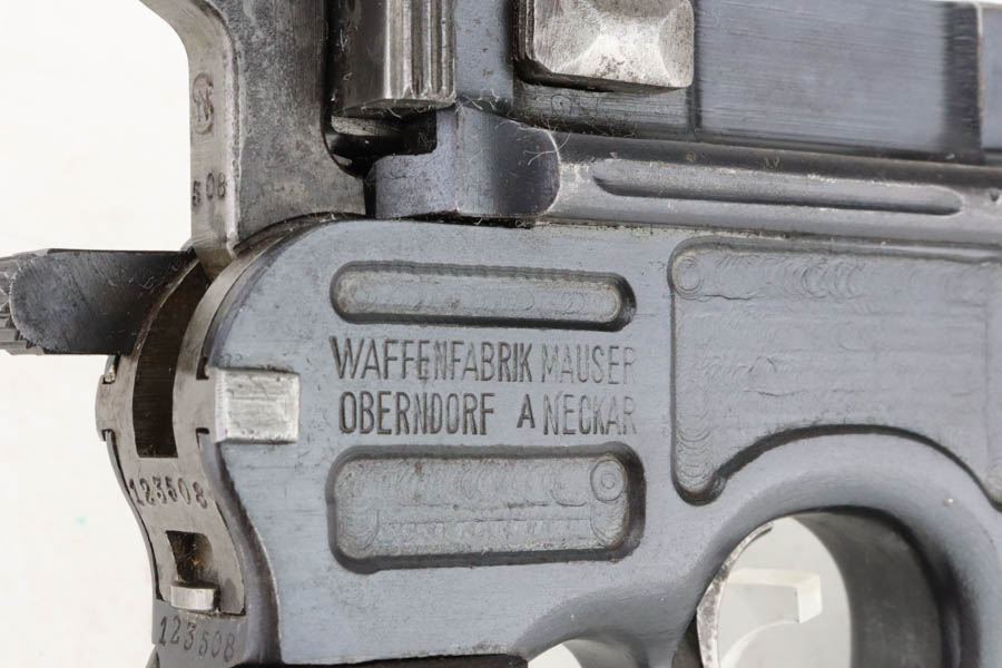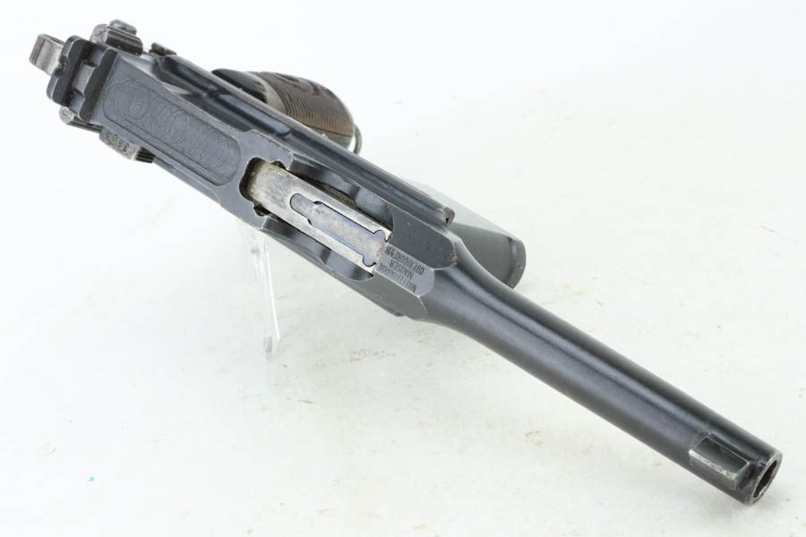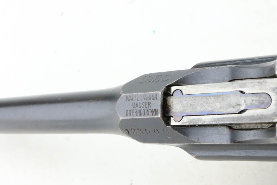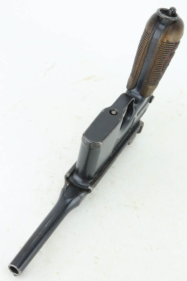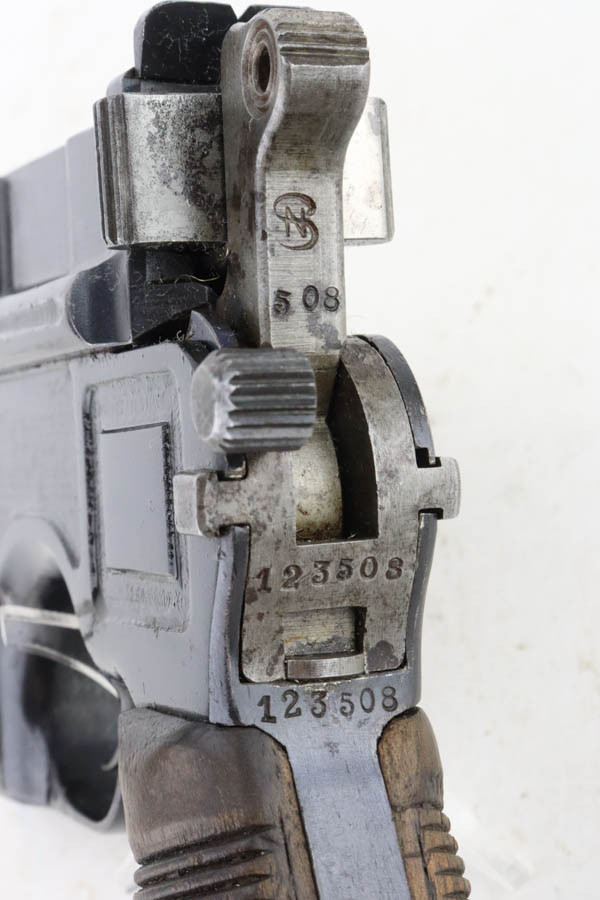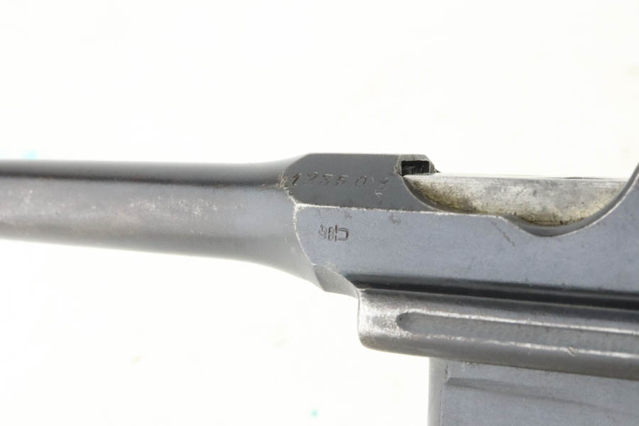 5/31/24 – This is a very nice example of a Red 9 Mauser C96 issued to the Imperial German military during WW1. It is all matching and has the proper proofs. Unit marking on the front strap. We believe this one was reworked and issued to the Nazi police force, given its characteristics – the barrel has been shortened and the rear sight was milled. There is a “1920” rework marking on the barrel and a unit marking on the front strap. The gun has retained about 95% of its finish with minor high edge wear. Fitted with original matching-numbered “Red 9” grips. The bore has great rifling with pin-pricking throughout.