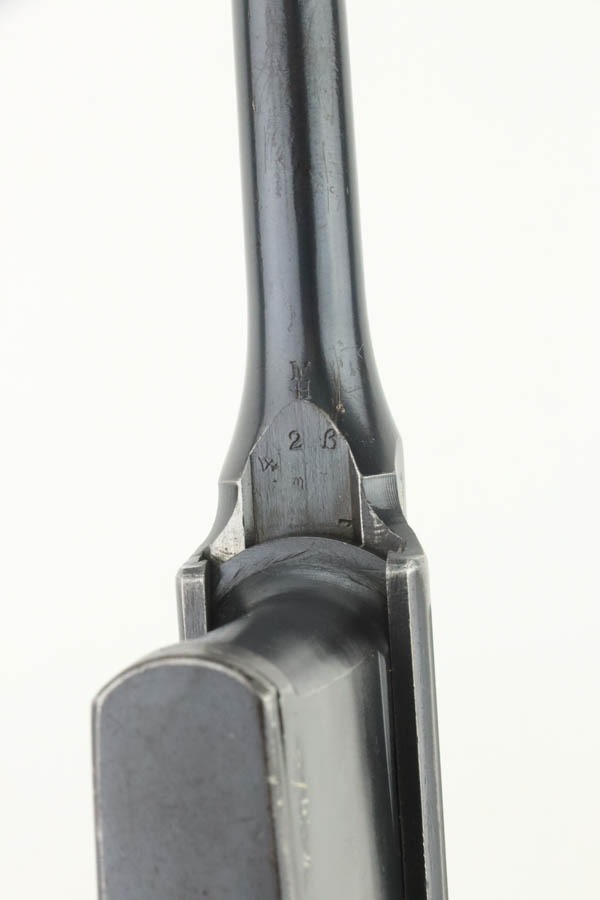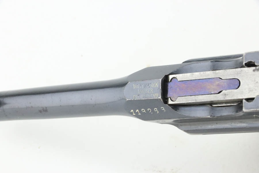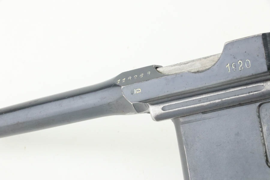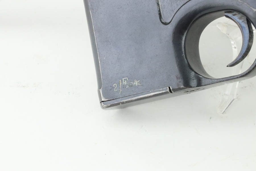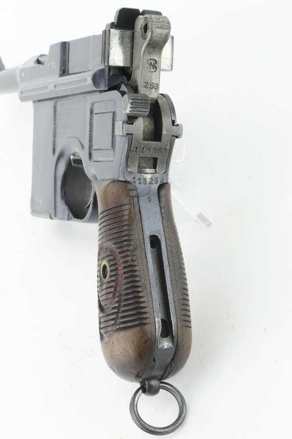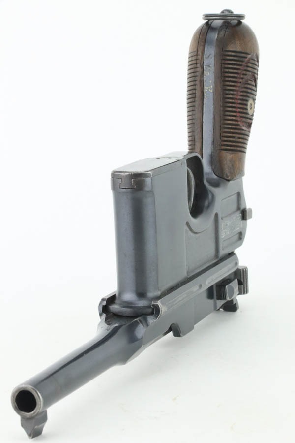 10/1/24 – This is an excellent example of a Red 9 Mauser C96 issued to the Imperial German military during WW1. It is all matching and has the proper proofs. Unit marking on the front strap. We believe this one was reworked and issued to the Nazi police force, given its characteristics – the barrel has been shortened and the rear sight was milled. There is an “S. Ma. I. K. 4.” unit marking on the front strap and what looks like an X’d out unit marking on the left side of the frame. “1920” government property marking on the slide. The gun has retained about 95% of its finish with minor high edge wear. Fitted with original matching-numbered “Red 9” grips. Excellent bore.