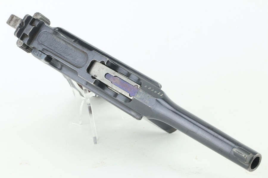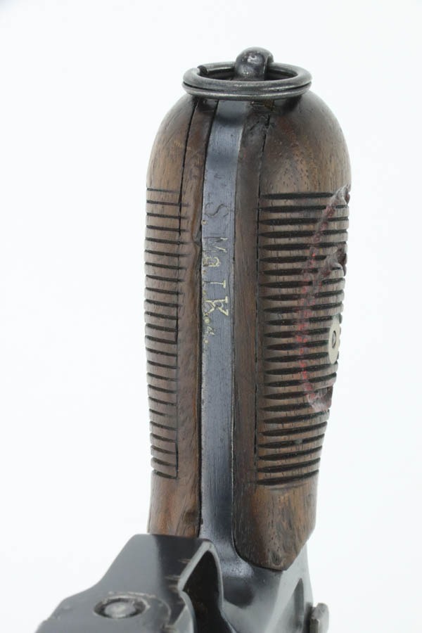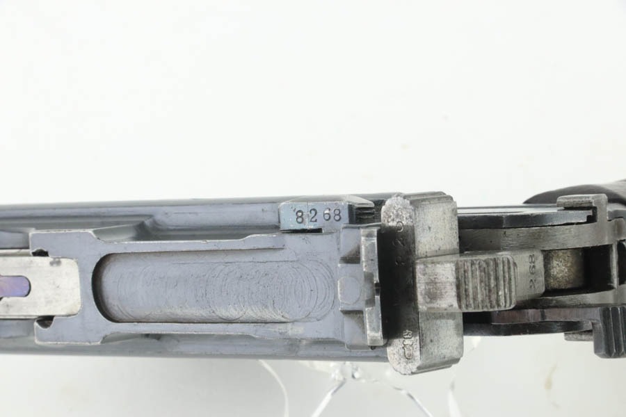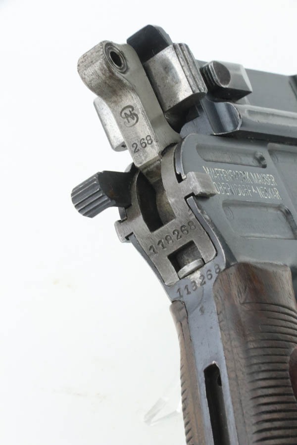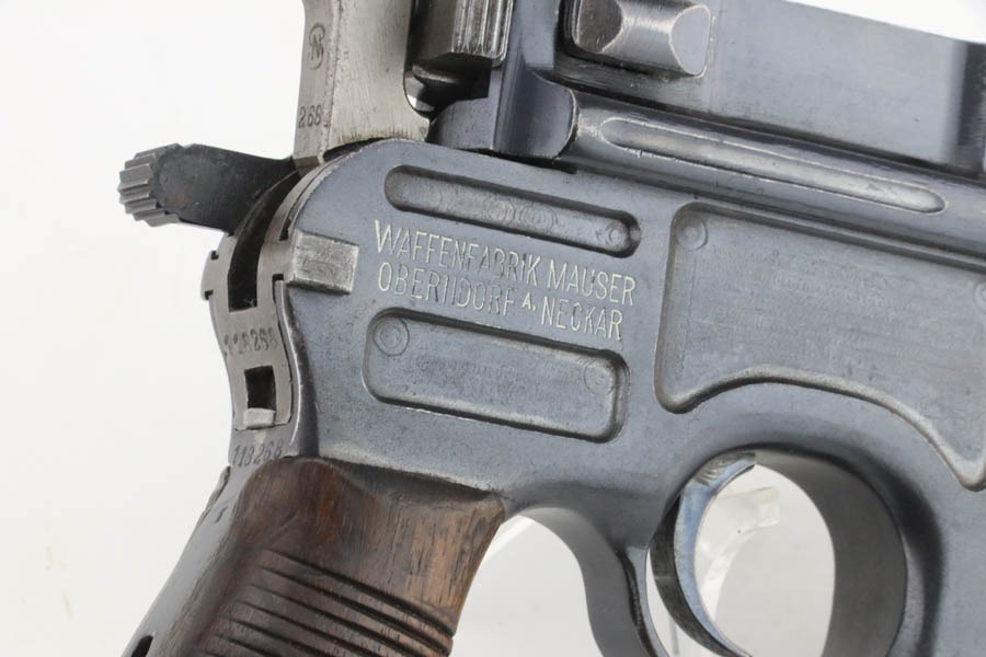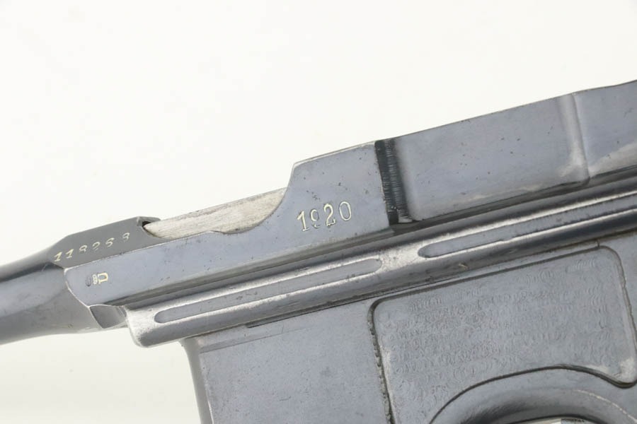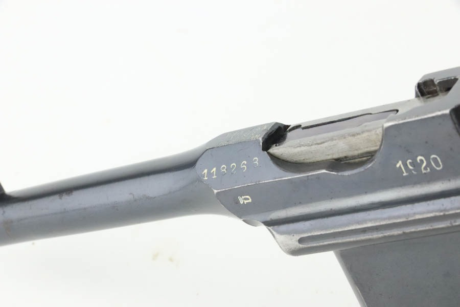 10/1/24 – This is an excellent example of a Red 9 Mauser C96 issued to the Imperial German military during WW1. It is all matching and has the proper proofs. Unit marking on the front strap. We believe this one was reworked and issued to the Nazi police force, given its characteristics – the barrel has been shortened and the rear sight was milled. There is an “S. Ma. I. K. 4.” unit marking on the front strap and what looks like an X’d out unit marking on the left side of the frame. “1920” government property marking on the slide. The gun has retained about 95% of its finish with minor high edge wear. Fitted with original matching-numbered “Red 9” grips. Excellent bore.