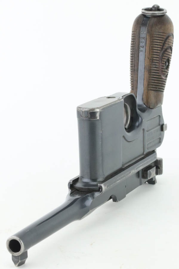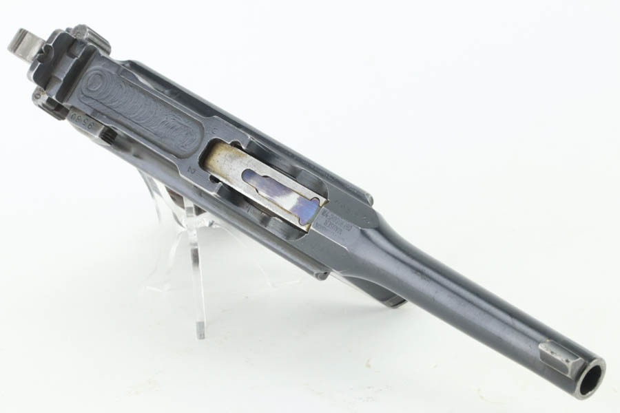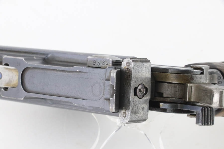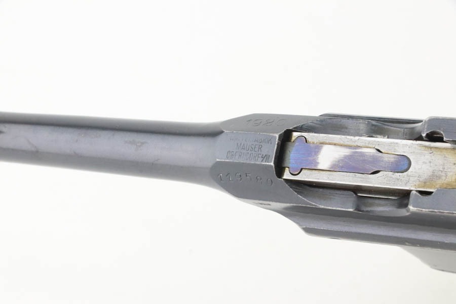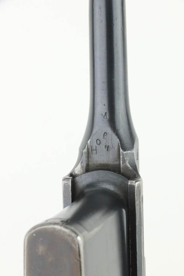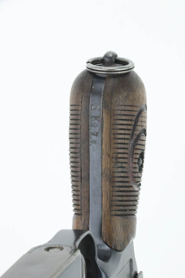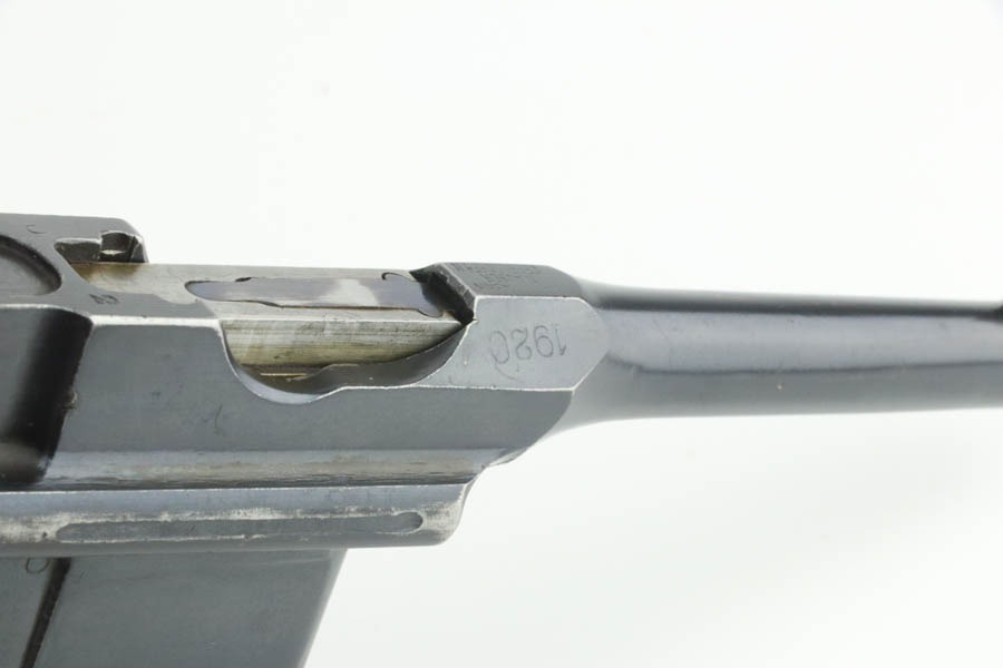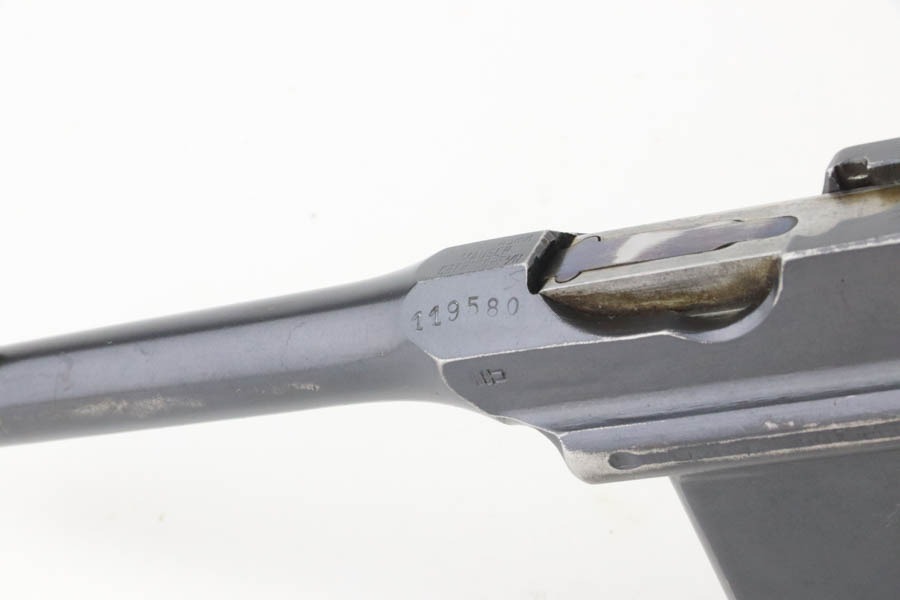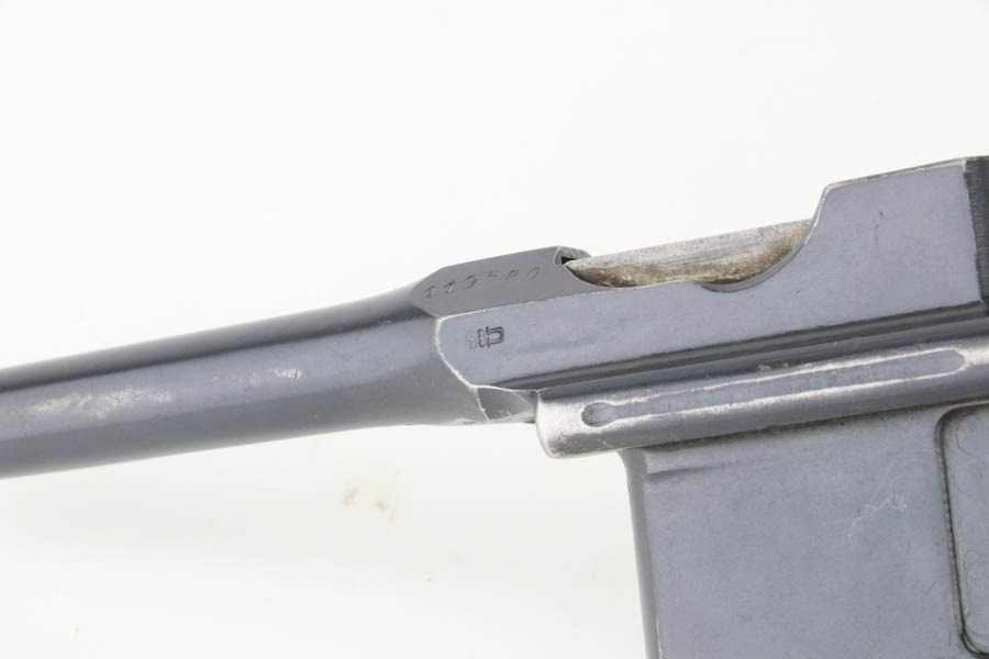 10/4/24 – This is a very nice example of a Red 9 Mauser C96 issued to the Imperial German military during WW1. It is all matching and has the proper proofs. Unit marking on the front strap. We believe this one was reworked and issued to the Nazi police force, given its characteristics – the barrel has been shortened and the rear sight was milled. There is an “S. Kg. 7. 5.” unit marking on the front strap and a “1920” government property marking on the slide. The gun has retained about 90% of its finish with general high edge wear and some patina on the base plate. Fitted with original matching-numbered “Red 9” grips. Very nice bore.