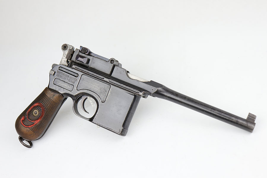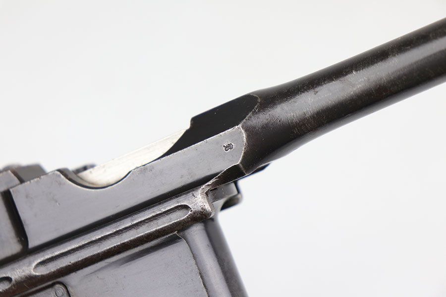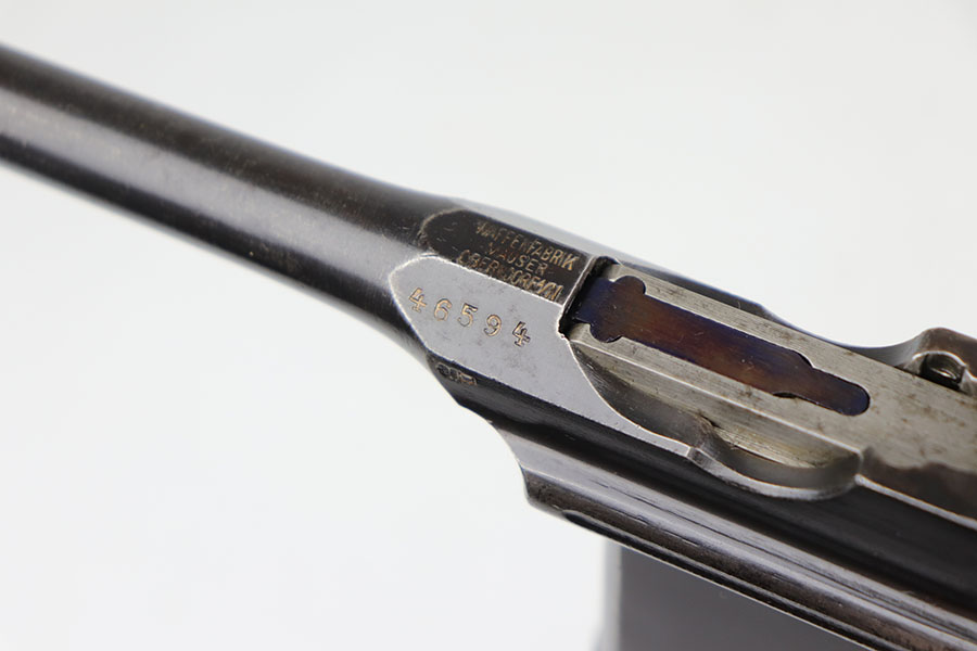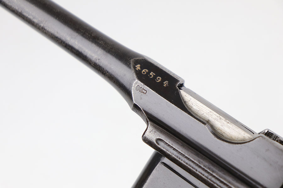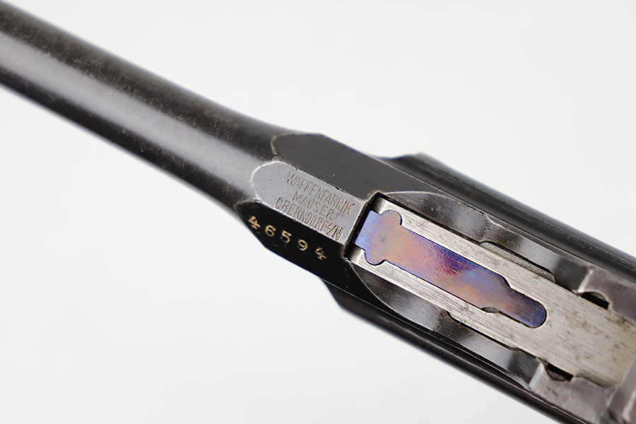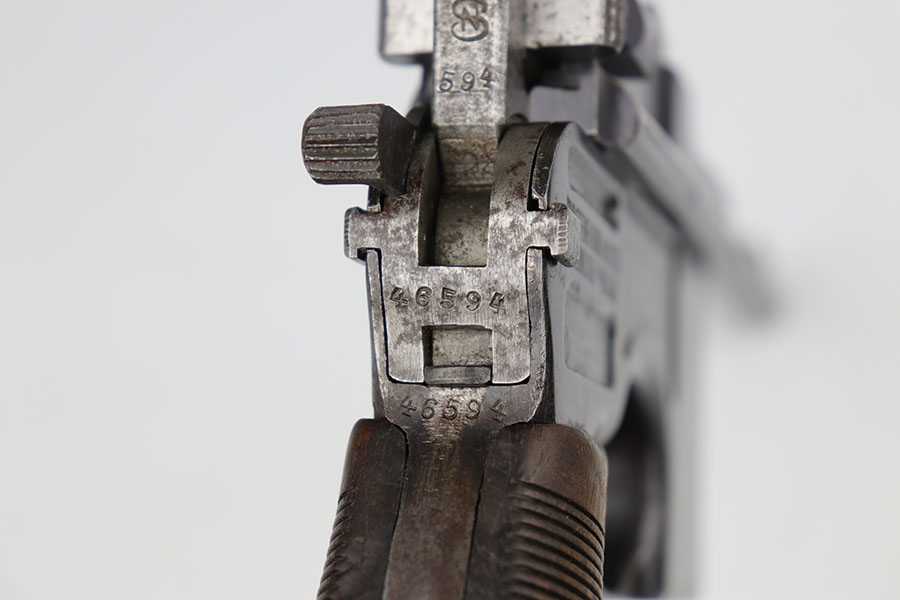 6/18/20 – This is a nice example of an all original ‘Red 9’ Mauser C96 with matching stock. Unlike its commercial counterparts, “Red 9” Broomhandles were chambered in the more common 9mm Para caliber, which was used by the German Army and were marked with a large 9 on the grips which was then filled with red or orange paint to help German soldiers differentiate its caliber from the standard .30 mauser cartridge. Only about 130,000 of these very collectible guns were made, with only about 100,000 being accepted by the army and issued to the troops. Considered to be a substitute for a light carbine, they became very popular in trench warfare and were used by some of the Germany’s elite crack troops. The gun has about 85% of the original blue with most of the wear on the barrel and rear of frame, likely from rubbing against the inside of the stock. There is also some thinning on the rails and front of mag well. Small parts on the pistol show nice fire blue still. The grips are matching numbered to the pistol, with the large red 9 externally. Stock is matching numbered to the gun. The lid does have a repaired crack. Strong bore but there is minor frost.