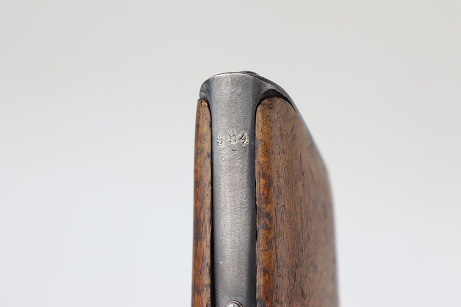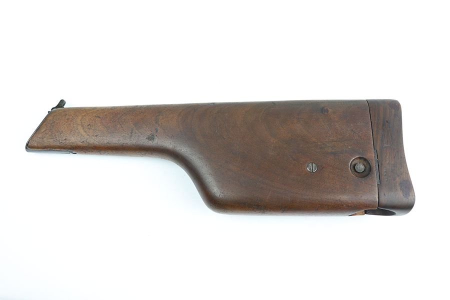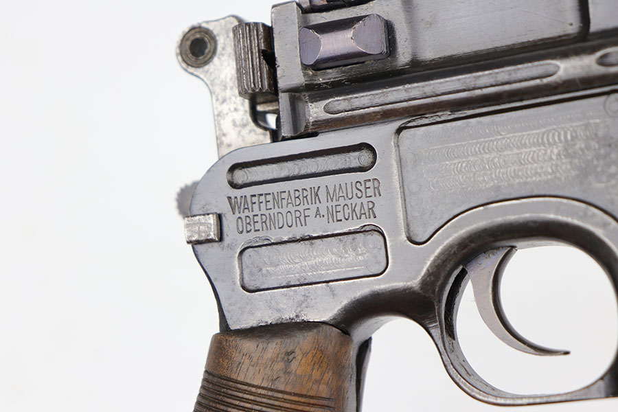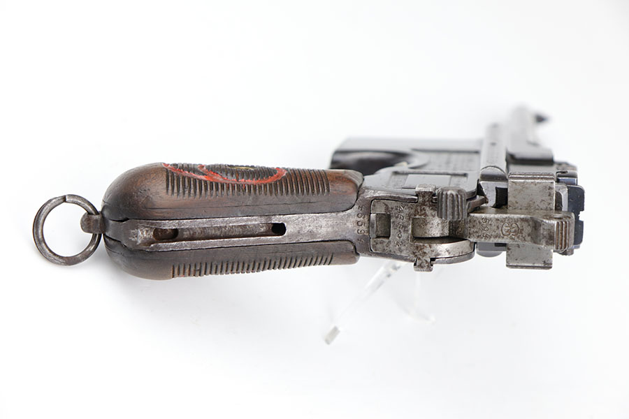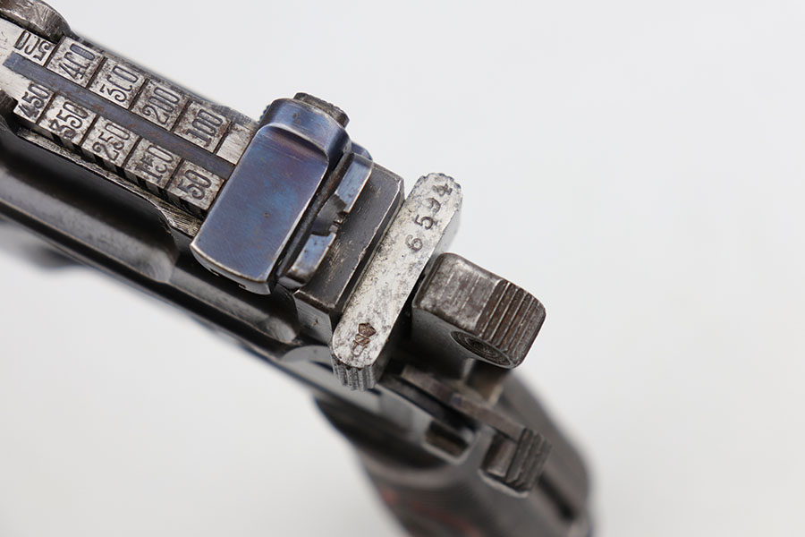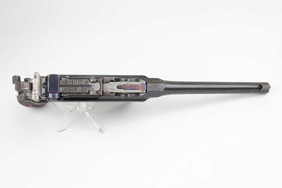 6/18/20 – This is a nice example of an all original ‘Red 9’ Mauser C96 with matching stock. Unlike its commercial counterparts, “Red 9” Broomhandles were chambered in the more common 9mm Para caliber, which was used by the German Army and were marked with a large 9 on the grips which was then filled with red or orange paint to help German soldiers differentiate its caliber from the standard .30 mauser cartridge. Only about 130,000 of these very collectible guns were made, with only about 100,000 being accepted by the army and issued to the troops. Considered to be a substitute for a light carbine, they became very popular in trench warfare and were used by some of the Germany’s elite crack troops. The gun has about 85% of the original blue with most of the wear on the barrel and rear of frame, likely from rubbing against the inside of the stock. There is also some thinning on the rails and front of mag well. Small parts on the pistol show nice fire blue still. The grips are matching numbered to the pistol, with the large red 9 externally. Stock is matching numbered to the gun. The lid does have a repaired crack. Strong bore but there is minor frost.