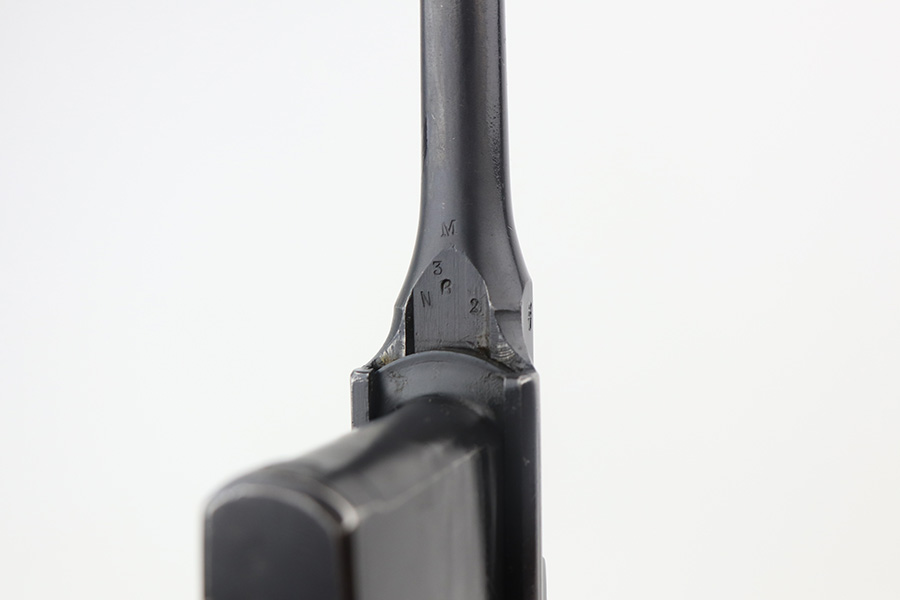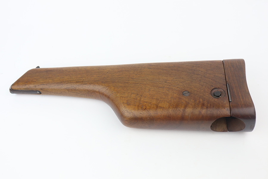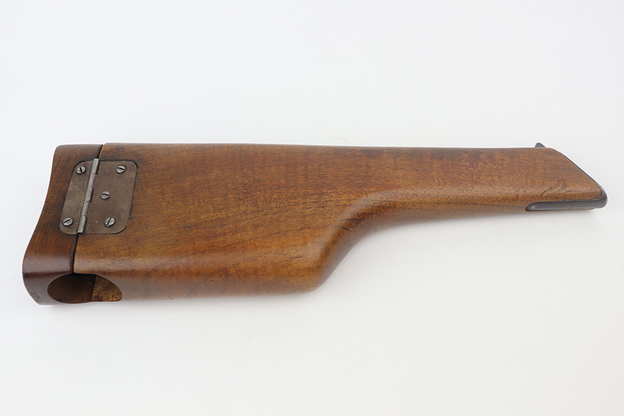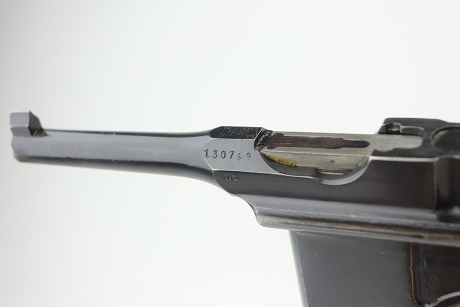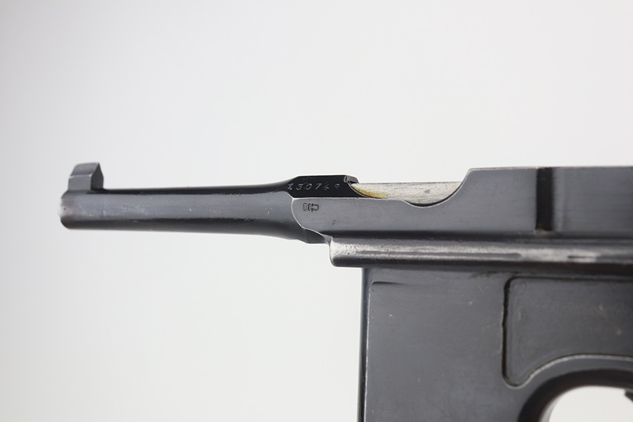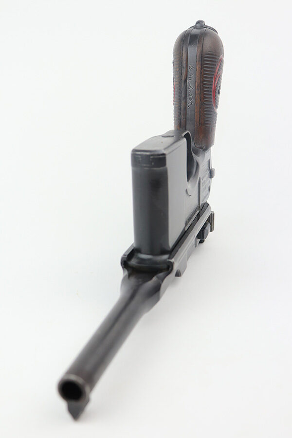 6/1/21 – This is an excellent example of a “Red 9” Mauser C96 rig that was initially issued to the Imperial German army during WW1. It was then reworked by the police force in 1920. The barrel was shortened and a “S. MI. 2. 107.” police unit marking was added. It stands for “Schutz Polizei Minden”. The gun has the proper Red 9 grips that match the gun. The gun is all matching and “Crown U” proofed. It has retained about 95% of its bluing. There is minor wear on the side rails and a few very minor dings here and there. It comes with a mismatched Imperial-proofed wood stock. There is a name written faintly on the side. The bore is excellent – shiny with strong rifling.