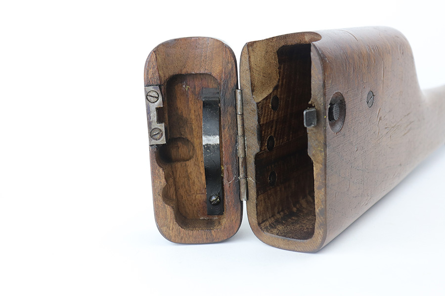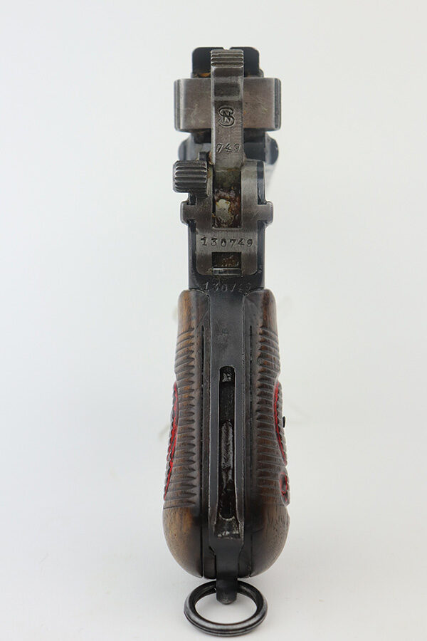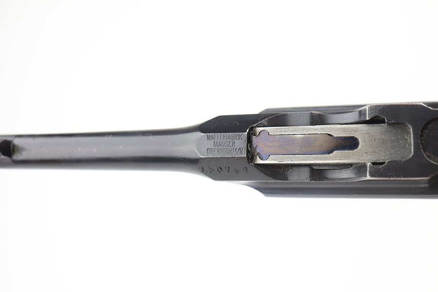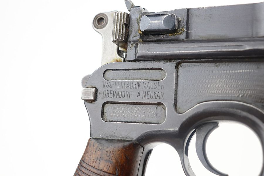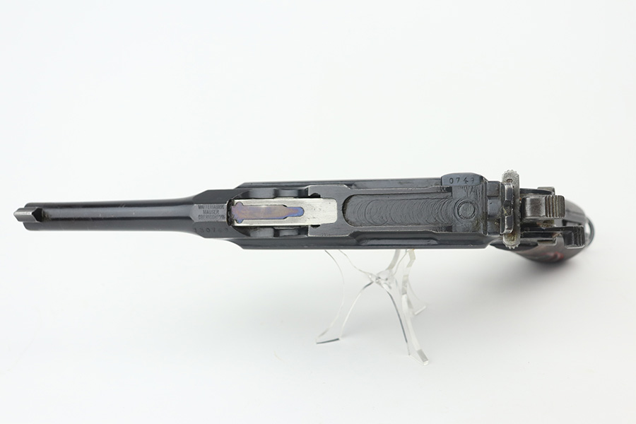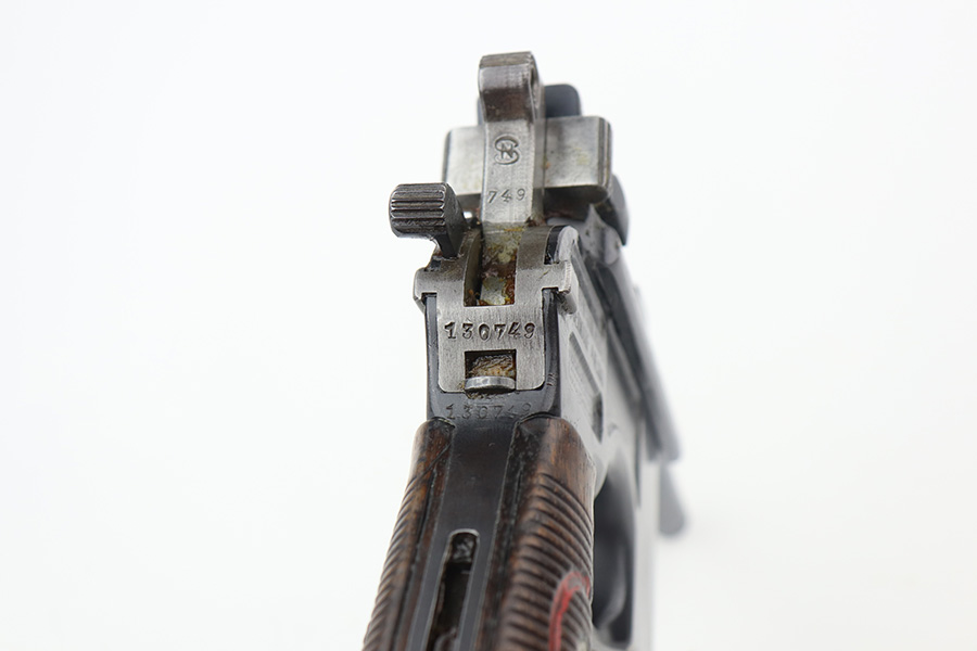 6/1/21 – This is an excellent example of a “Red 9” Mauser C96 rig that was initially issued to the Imperial German army during WW1. It was then reworked by the police force in 1920. The barrel was shortened and a “S. MI. 2. 107.” police unit marking was added. It stands for “Schutz Polizei Minden”. The gun has the proper Red 9 grips that match the gun. The gun is all matching and “Crown U” proofed. It has retained about 95% of its bluing. There is minor wear on the side rails and a few very minor dings here and there. It comes with a mismatched Imperial-proofed wood stock. There is a name written faintly on the side. The bore is excellent – shiny with strong rifling.