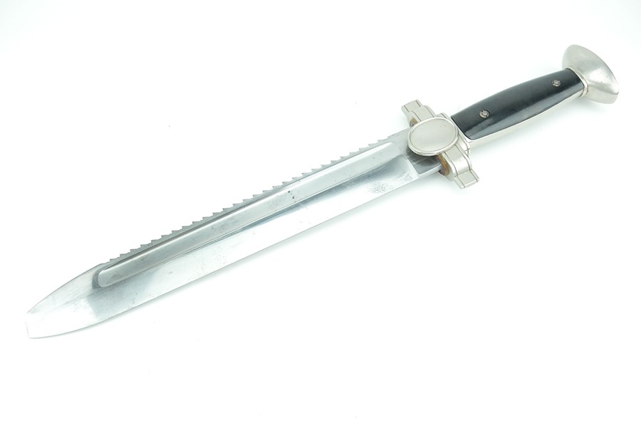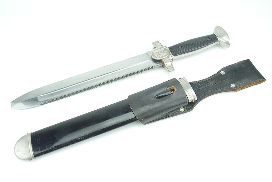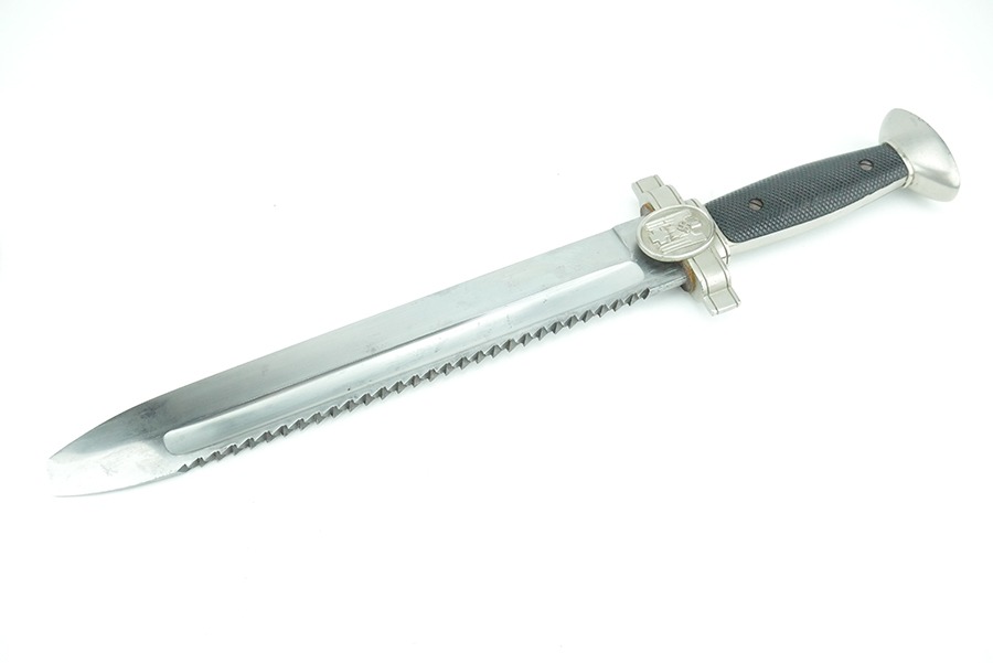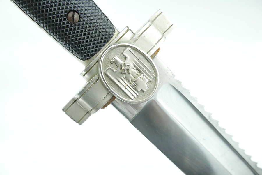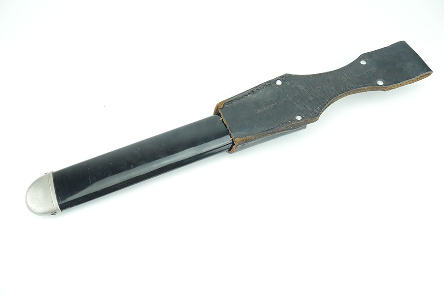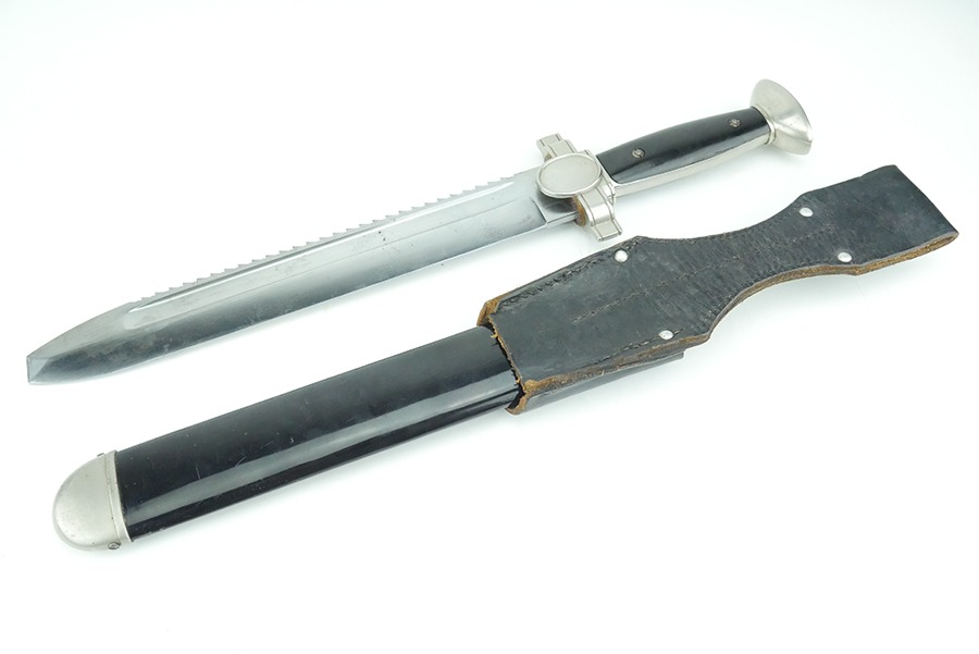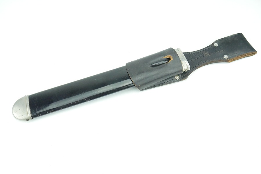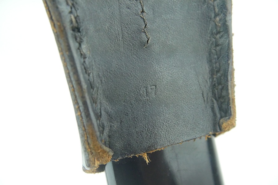 10/29/24 – This is an original WW2 Nazi medical Hewer. Technically, due to the Genova convention, this is not considered a weapon. Notice the squared tip – this Hewer was made strictly for medical purposes. In December of 1937 the Nazi Party recognized the German Red Cross and in 1938 it became part of the Ministry of Interior Social Welfare Organization. Due to the organization’s non-combatant status under the Geneva Convention, members were not allowed to carry weapons. This hewer is in excellent condition overall with the original scabbard and leather frog. The blade is marked, but the maker stamp is hidden under the nazi eagle holding the red cross logo. The handle is checkered on one side, and smooth on the reverse side. There are no cracks or chips on the grip. The blade is excellent as well with almost no wear.