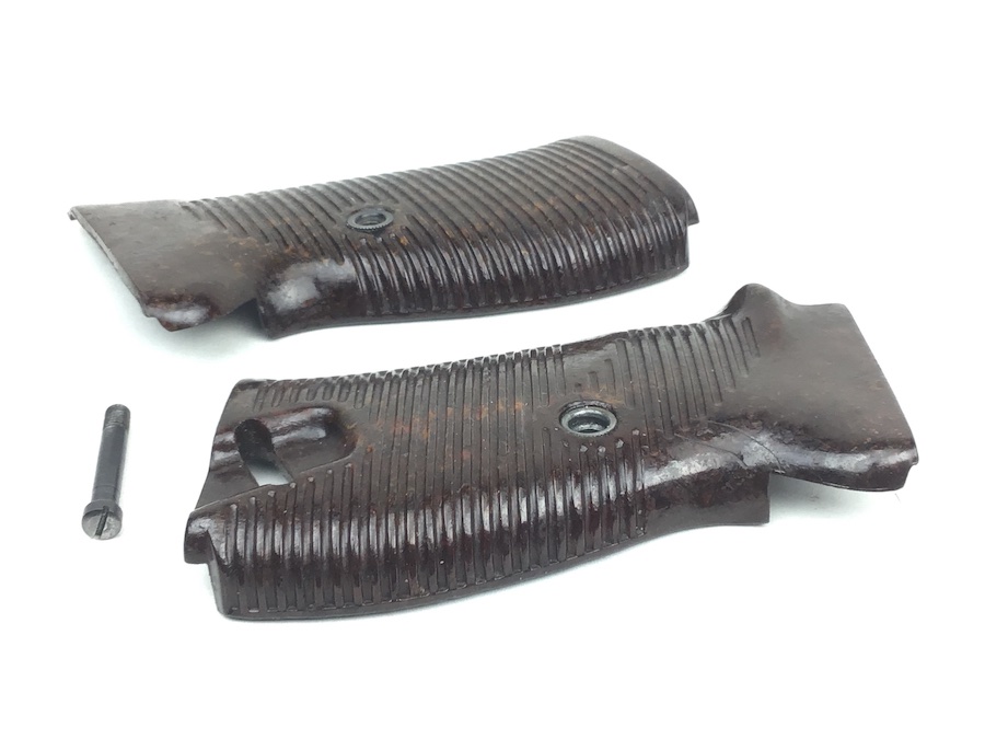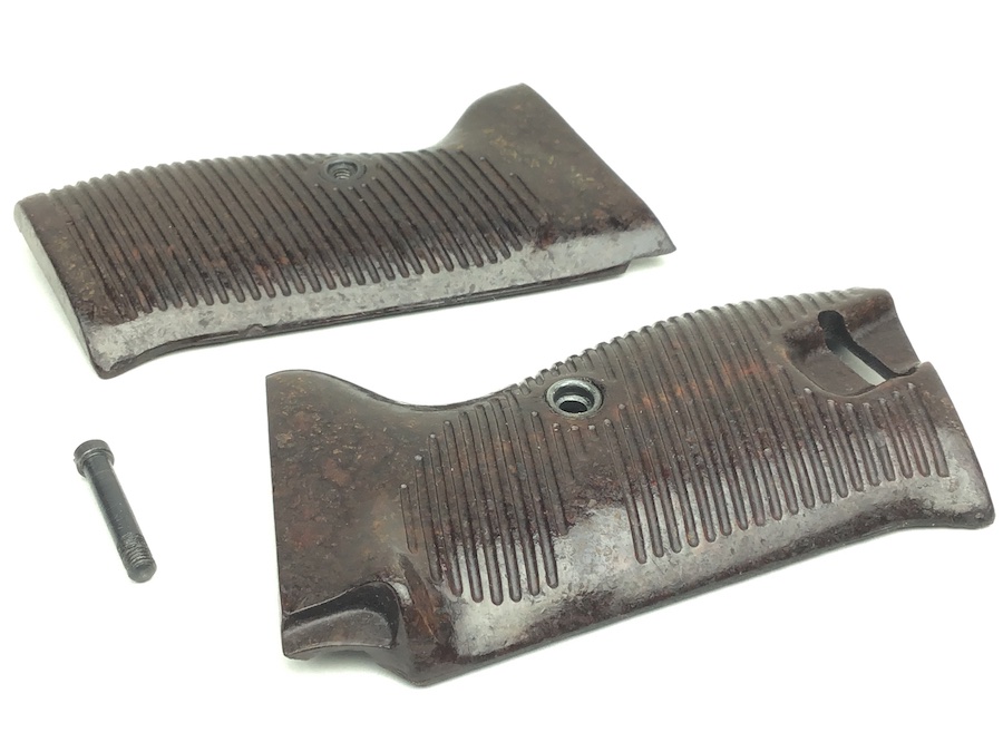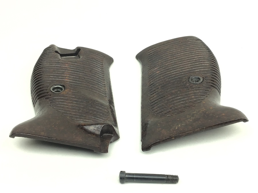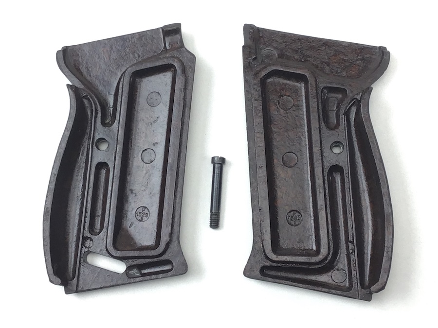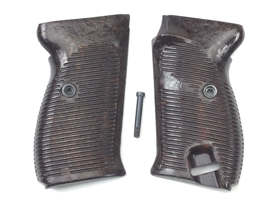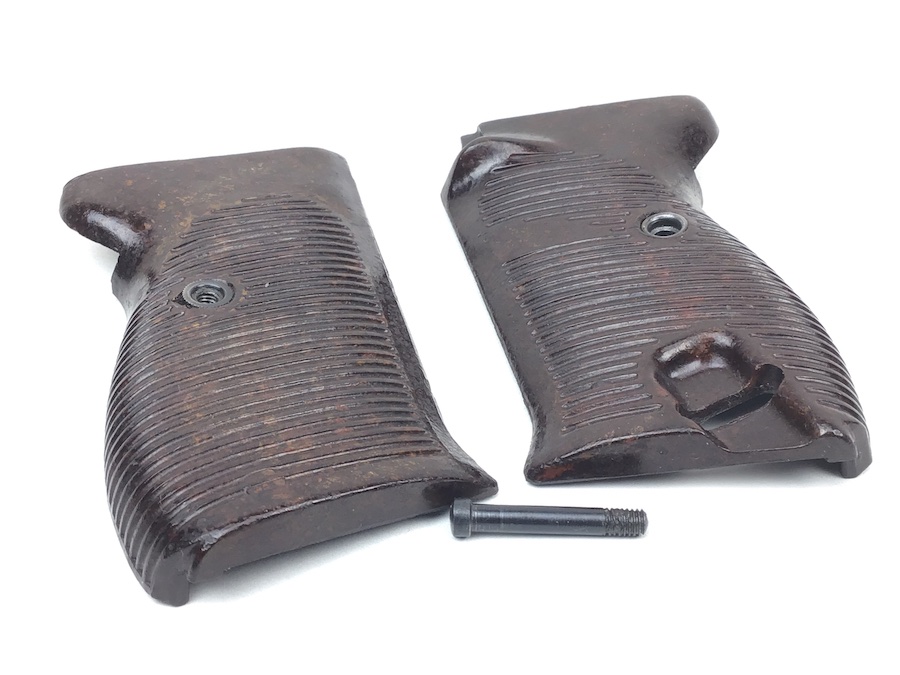 3/25/20 – This is a pair of wartime WW2 P.38 grips. The grips are perfect for a wartime production Walther or Mauser P.38. The grips have a beautiful reddish brown color, which is more desirable by some collectors. The grips have no cracks or chips. The interior of the grips are unmarked, except for a formula stamp in the lower circle. Includes original screw.
