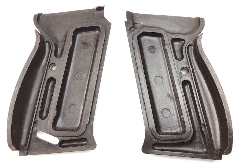 1/12/21 – This is a pair of wartime WW2 P.38 grips. The grips are perfect for a wartime Spreewerke P.38. The grips have a beautiful reddish brown color, which is more desirable by some collectors. The grips have no cracks or chips. The tops do not have the “russian cut”. The interior of the grips are unmarked, except for a maker stamp in the upper circle.