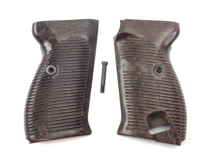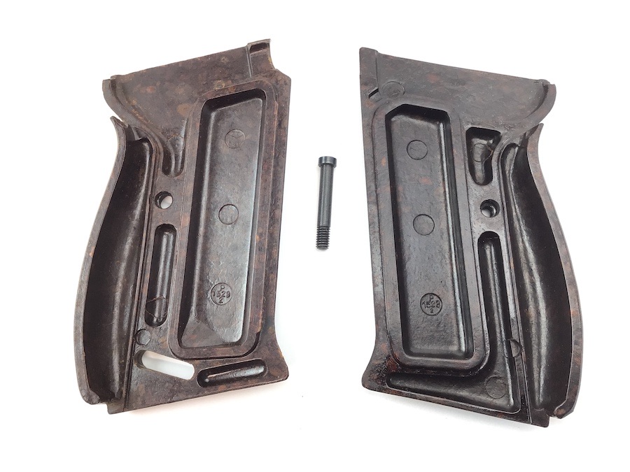 7/18/22 – This is a pair of wartime WW2 P.38 grips. The grips are perfect for a wartime P.38. The grips have a beautiful reddish brown color, which is more desired by some collectors. The grips have no cracks or chips. They do show some minor surface wear. The tops do not have the “russian cut”. The interior of the grips are unmarked, except for a maker stamp in the lower circle. Comes with an original screw.