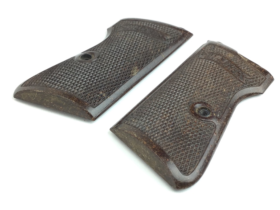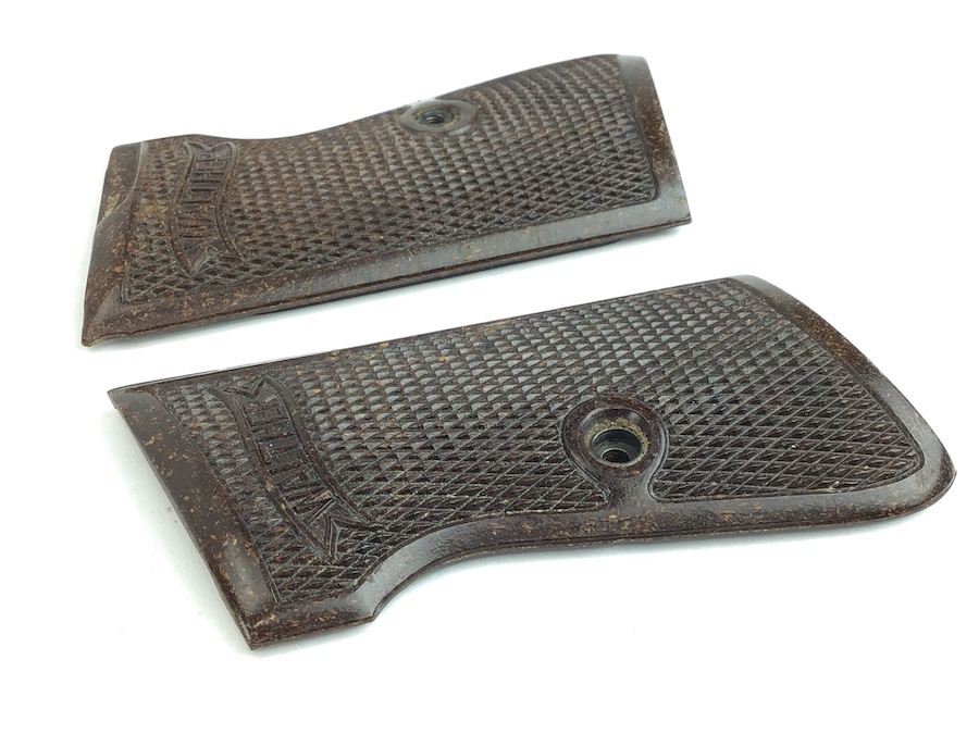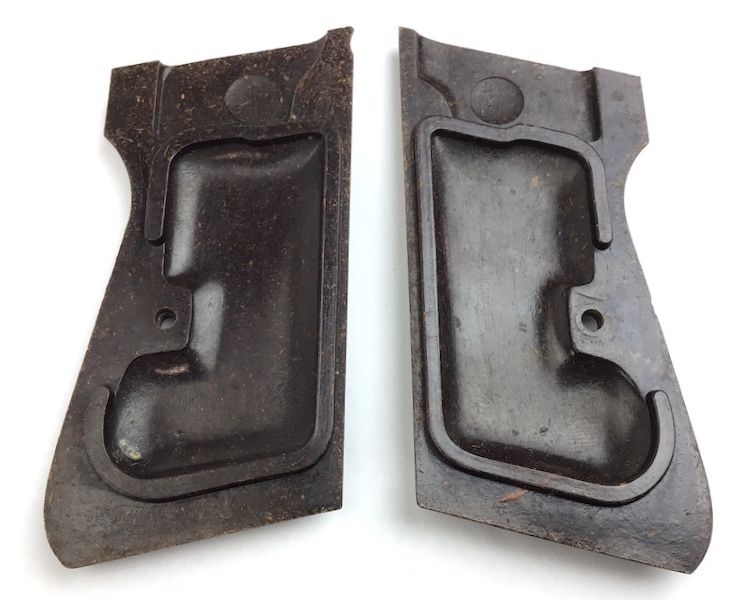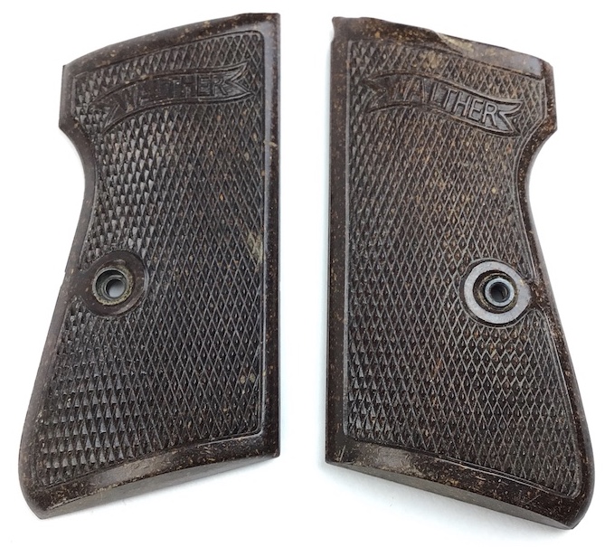 5/25/21 – This is a rare pair of original pair of WW2 era Walther PP grips. The grips are a reddish / brown bakelite color, which is the most uncommon of the PP grips. The grips are correct WW2 later wartime variation without weighted inserts. These grips are in great condition with no cracks or chips.