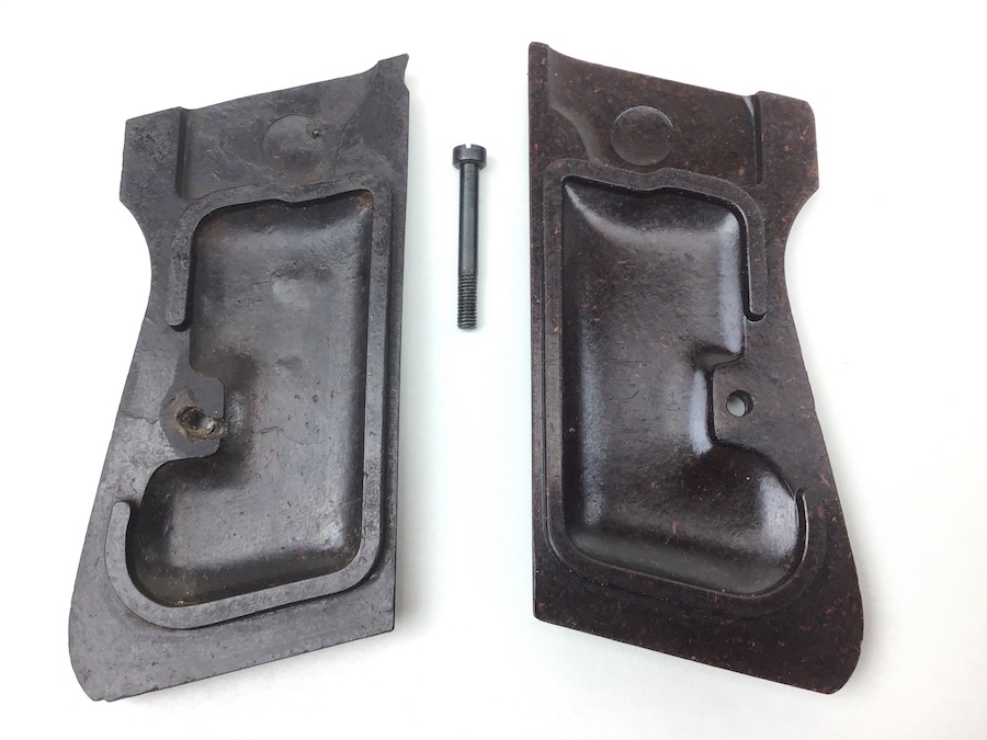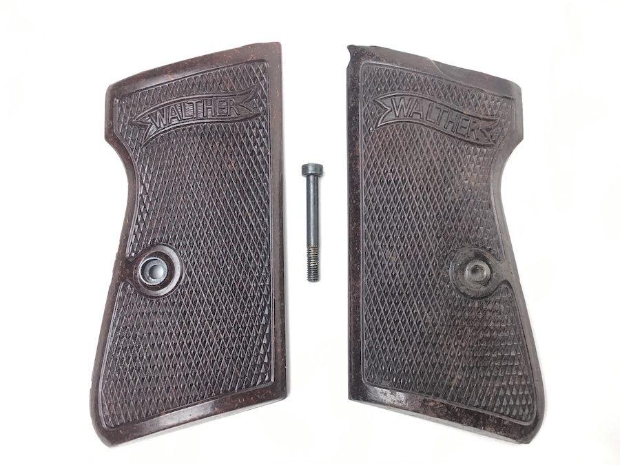 3/25/20 – This is a rare pair of original pair of WW2 era Walther PP grips. The grips are a reddish / brown bakelite color, which is the most uncommon of the PP grips. The grips are correct WW2 wartime variation with no weighted inserts. These grips are in excellent condition with no cracks or chips and includes an original screw. The color of the panels differ slightly but mostly on the back side. The fronts look very close. There is a surface hairline crack on the back of the left panel at the escutcheon, but it is not visible on the front. Priced accordingly.