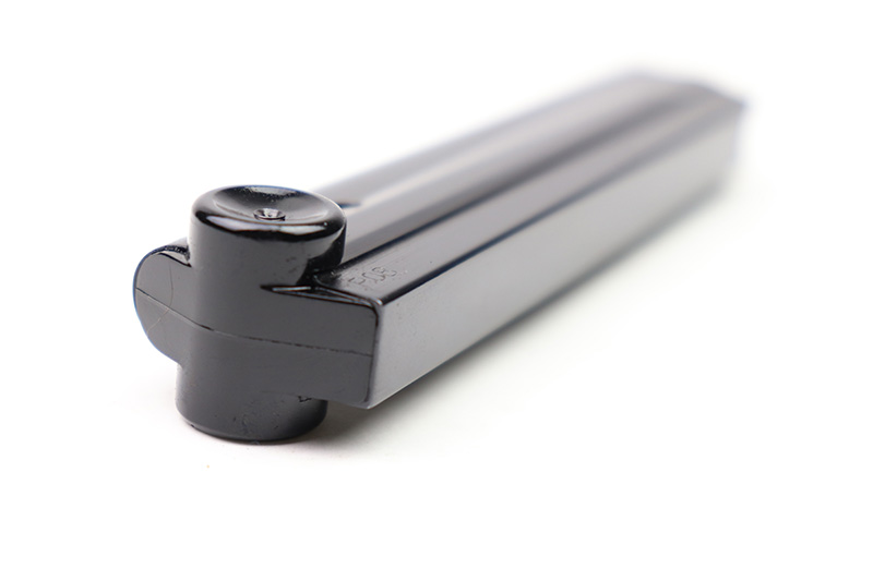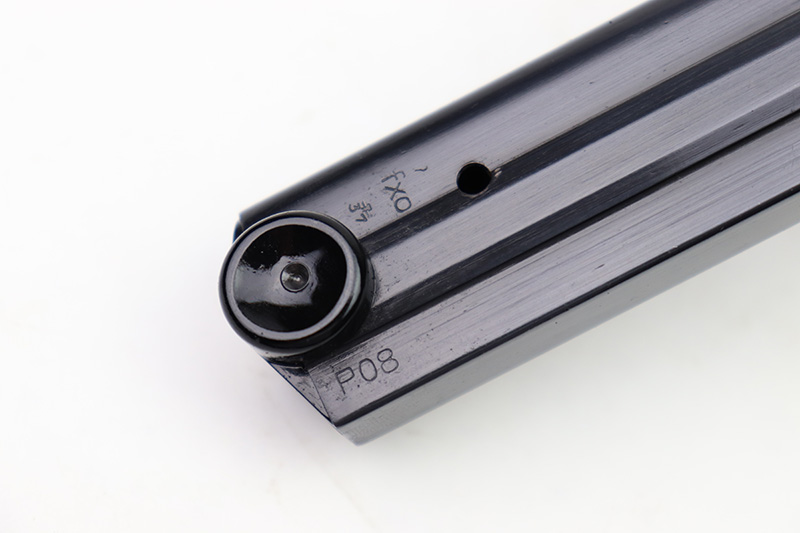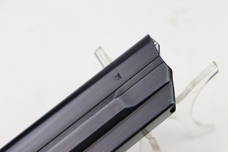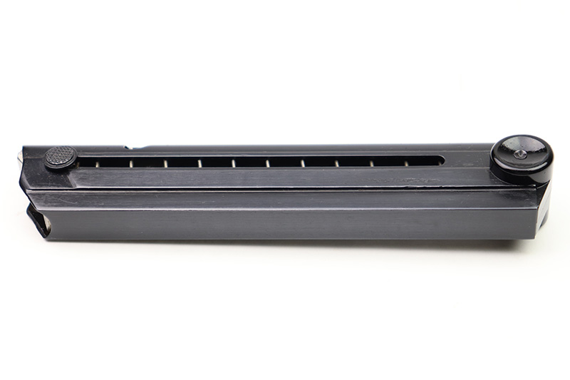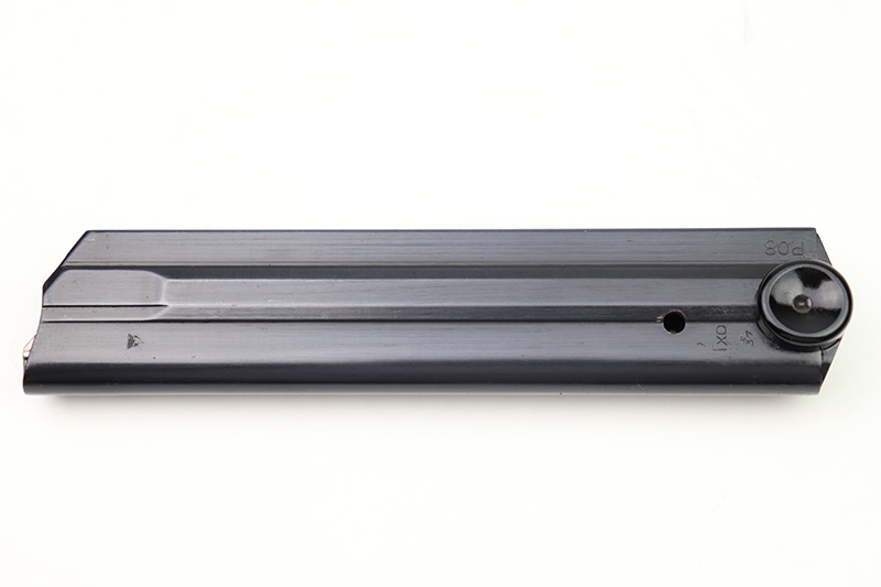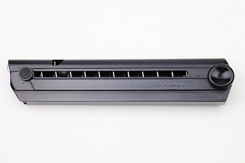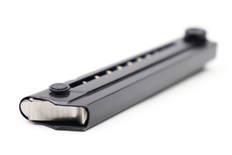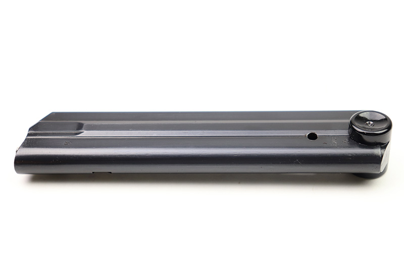 8/18/22 – This is an original Black Widow Luger magazine from WW2. The tube of the magazine is fxo stamped with two eagle 37 proof stamps. The tube has been refinished, as shown and is in excellent condition. The base is original bakelite and has no cracks or chips. Fully functional spring.