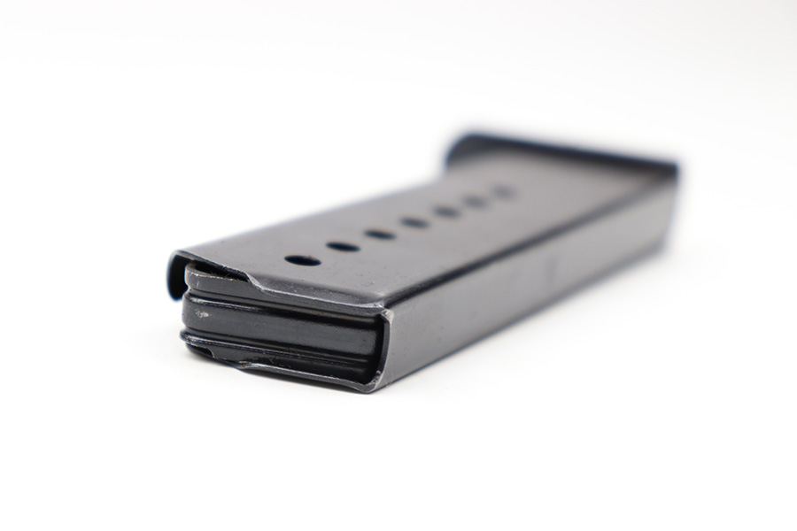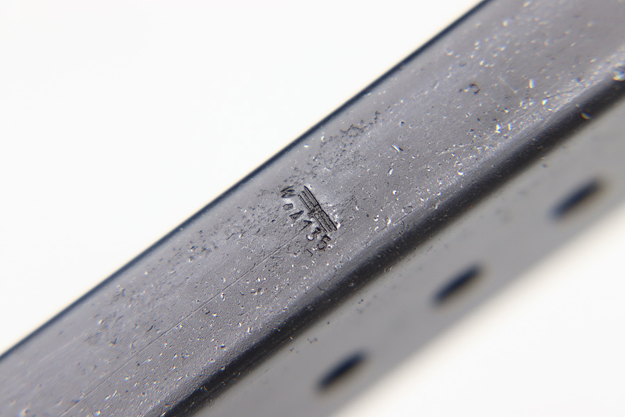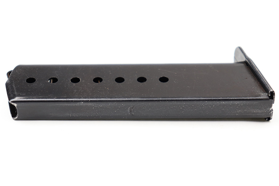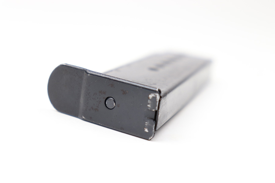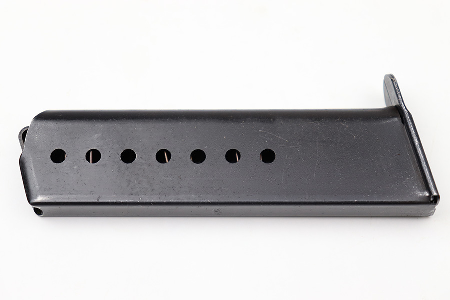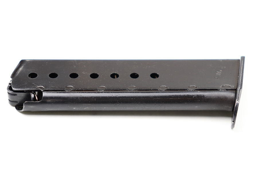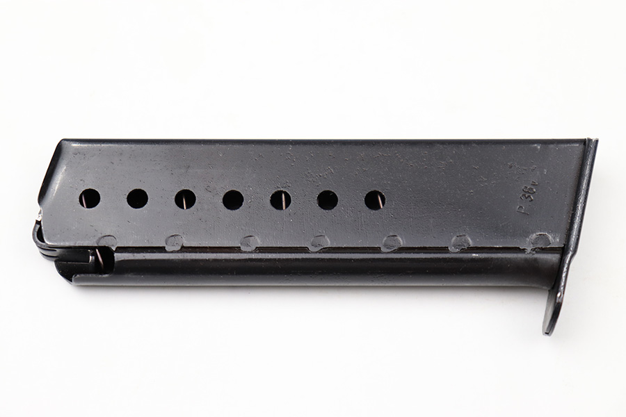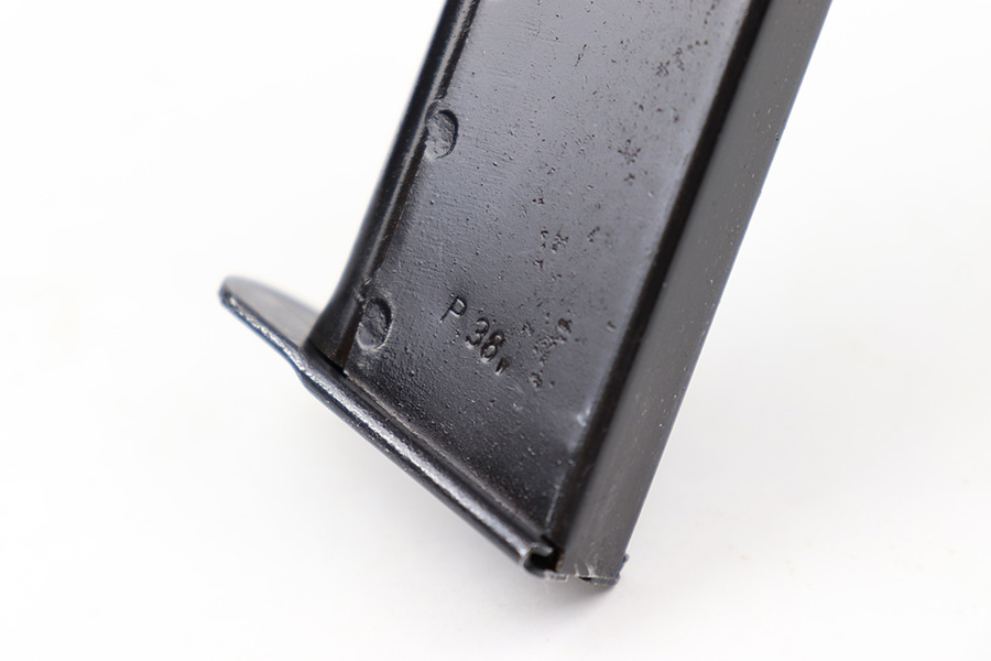 7/21/22 – This is an original late WW2 production Mauser P.38 magazine. The magazine is all original, but has been refinished post-factory. The result is an excellent dark bluing throughout. The magazine has a late war ribbed follower and a waffen WaA135 military proof stamp on the spine. The left side of the tube is P.38v stamped. No other markings. The spring is strong and fully functional.